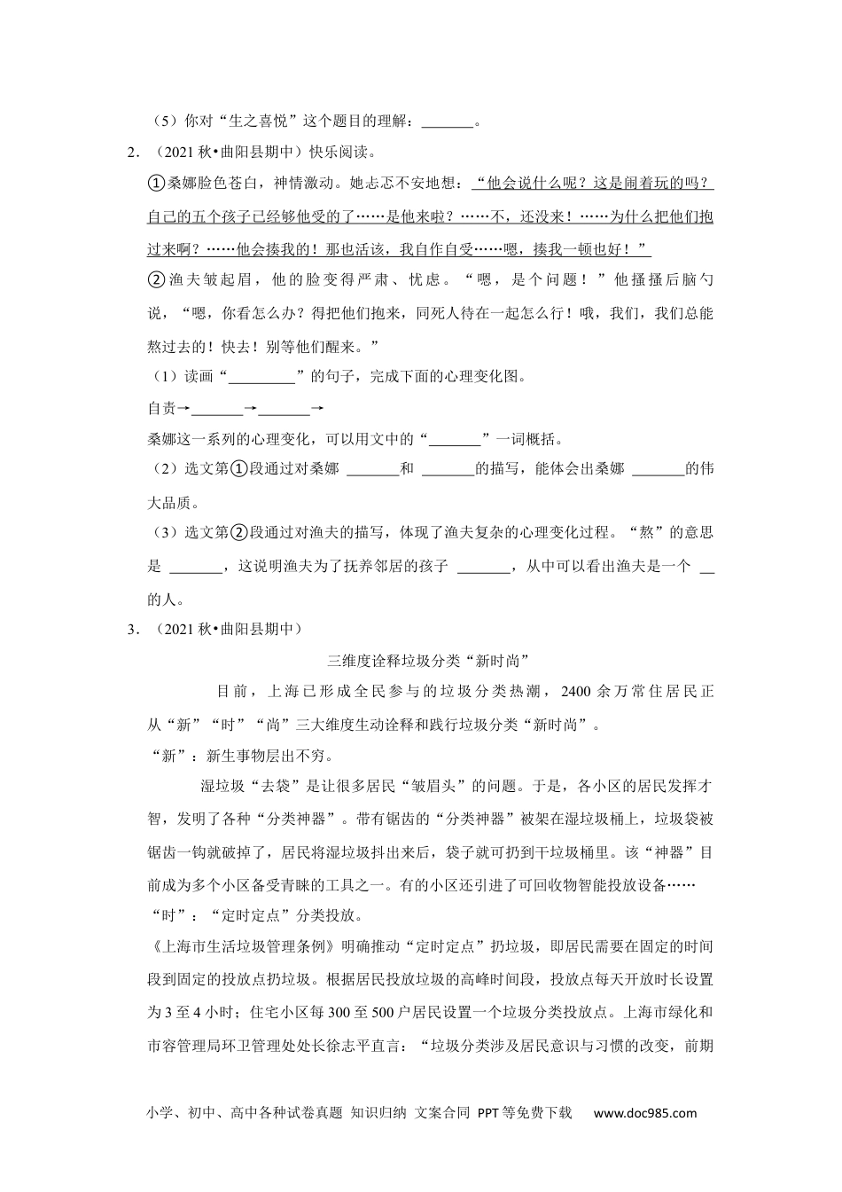 小学、初中、高中各种试卷真题知识归纳文案合同PPT等免费下载www.doc985.com期中专项复习-现代文阅读真题汇编(二)-小学语文六年级上册部编版一.现代文阅读(共9小题)1.(2021秋•毕节市期中)课外阅读。生之喜悦美国西海岸的边境城市圣迭戈的一家医院里,长年住着因外伤全身瘫痪的威廉•马修。当阳光从朝南的窗口射入病房时,马修开始迎接来自身体不同部位的痛楚的袭击——病痛总是早上光临。在将近一个小时的折磨中,马修不能翻身,不能擦汗,甚至不能流泪,他的泪腺由于药物的副作用而萎缩。年轻的女护士为马修所经受的痛苦以手掩面,不敢正视。马修说:“钻心的刺痛难忍,但我还是感激它——痛楚让我感到我还活着。”马修住院的头几年,身体没有任何感觉,没有舒适感也没有痛楚感。在医生的精心治疗下,有一部分神经已经再生,每天早上向中枢神经发出“痛”的信号。在痛楚中发现喜悦,这在一般人看来简直是荒唐。但置身马修的处境,就知道这种特定的痛楚不仅给他带来了喜悦,而且带来了希望。当然一个重要前提在于,马修是一个意志坚强的人。如果说,痛楚感是一处断壁残垣的话,无知觉则是死寂的沙漠。痛楚感使马修体验到了“存在”。从某种意义上说,这甚至是一种价值体现——医疗价值与康复价值的体现。谁也不能保证可怜的马修能获得这一天,但他和医生一起朝这个方向努力,因而他盼望痛楚会在第二天早晨如期到来。(1)破折号的主要用法有①表注释,②表语意转换,③表声音延长或中断。请判断下面句子中破折号的用法,选择序号填在句子后面的中。A.当阳光从朝南的窗口射入病房时,马修开始迎接来自身体不同部位痛楚的袭击——病痛总是早上光临。B、钻心的刺痛难忍,但我还是感激它——痛楚让我感到我还活着。(2)在短文中找出表现马修所经受的痛苦的句子,选两句摘抄下来。(3)马修为什么要感激使他钻心难忍的痛楚?(4)读了短文后,你有什么感受?请用简洁流畅的语言写下来。。小学、初中、高中各种试卷真题知识归纳文案合同PPT等免费下载www.doc985.com(5)你对“生之喜悦”这个题目的理解:。2.(2021秋•曲阳县期中)快乐阅读。①桑娜脸色苍白,神情激动。她忐忑不安地想:“他会说什么呢?这是闹着玩的吗?自己的五个孩子已经够他受的了……是他来啦?……不,还没来!……为什么把他们抱过来啊?……他会揍我的!那也活该,我自作自受……嗯,揍我一顿也好!”②渔夫皱起眉,他的脸变得严肃、忧虑。“嗯,是个问题!”他搔搔后脑勺说,“嗯,你看怎么办?得把他们抱来,同死人待在一起怎么行!哦,我们,我们总能熬过去的!快去!别等他们醒来。”(1)读画“”的句子,完成下面的心理变化图。自责→→→桑娜这一系列的心理变化,可以用文中的“”一词概括。(2)选文第①段通过对桑娜和的描写,能体会出桑娜的伟大品质。(3)选文第②段通过对渔夫的描写,体现了渔夫复杂的心理变化过程。“熬”的意思是,这说明渔夫为了抚养邻居的孩子,从中可以看出渔夫是一个的人。3.(2021秋•曲阳县期中)三维度诠释垃圾分类“新时尚”目前,上海已形成全民参与的垃圾分类热潮,2400余万常住居民正从“新”“时”“尚”三大维度生动诠释和践行垃圾分类“新时尚”。“新”:新生事物层出不穷。湿垃圾“去袋”是让很多居民“皱眉头”的问题。于是,各小区的居民发挥才智,发明了各种“分类神器”。带有锯齿的“分类神器”被架在湿垃圾桶上,垃圾袋被锯齿一钩就破掉了,居民将湿垃圾抖出来后,袋子就可扔到干垃圾桶里。该“神器”目前成为多个小区备受青睐的工具之一。有的小区还引进了可回收物智能投放设备……“时”:“定时定点”分类投放。《上海市生活垃圾管理条例》明确推动“定时定点”扔垃圾,即居民需要在固定的时间段到固定的投放点扔垃圾。根据居民投放垃圾的高峰时间段,投放点每天开放时长设置为3至4小时;住宅小区每300至500户居民设置一个垃圾分类投放点。上海市绿化和市容管理局环卫管理处处长徐志平直言:“垃圾分类涉及居民意识与习惯的改变,前期小学、初中、高中各种试卷真题知识归纳文案合同PPT等免费下载www.doc985.com的‘不方便’难以避免,定...