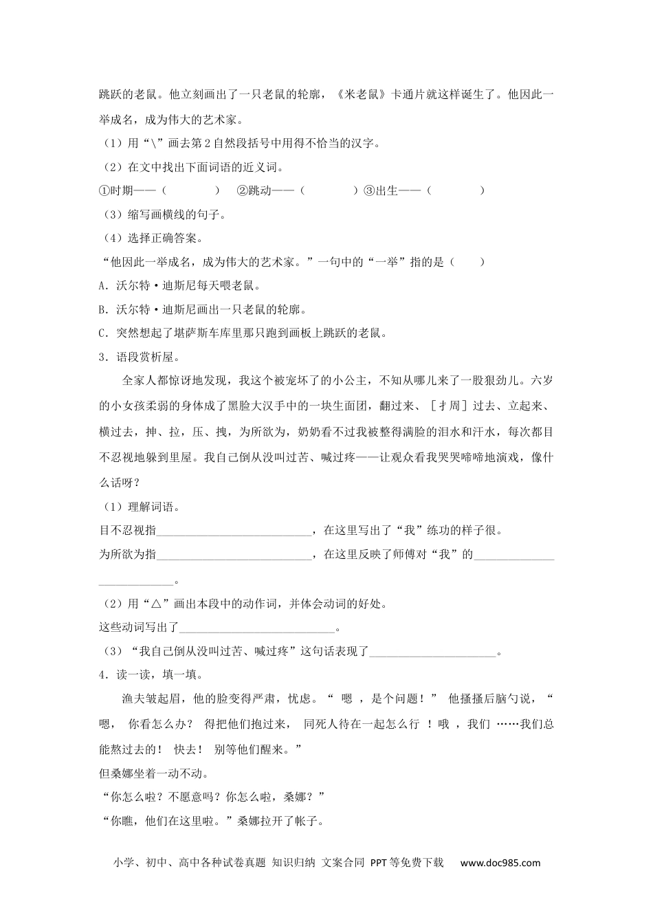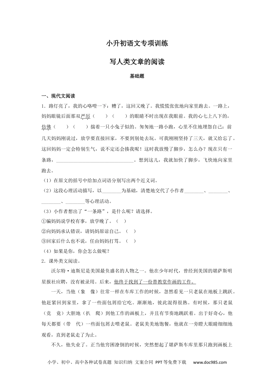 小学、初中、高中各种试卷真题知识归纳文案合同PPT等免费下载www.doc985.com小升初语文专项训练写人类文章的阅读基础题一、现代文阅读1.路灯亮了,我的心咯噔一下:糟了,这回又晚了。我慌慌张张地向家里跑去。一路上,妈妈眼镜后面那双严厉()()的眼睛不时出现在我眼前。我的心七上八下的,仿佛()()揣着一只小兔子似的。匆匆地一路小跑,心里不住地埋怨自己:前几天妈妈刚说过,放学要直接回家,不要到别处去玩。可我刚刚坚持了三天,就又给忘了。这回妈妈一定会特别生气,说不定还会揍我呢!这时我放慢了脚步,怎么办?现在只有一条路,________________________________。想到这儿,我就加快了脚步,飞快地向家里跑去。(1)在原文的括号中给加点词语分别写出两个近义词。(2)这段心理活动描写,以________为基础,清楚地交代了小作者________、________、________、________等心理活动。(3)小作者想出了“一条路”,是什么呢?请选择。①骗妈妈说学校有事,放学晚了。()②向妈妈承认错误,请妈妈原谅自己。()③回家后什么也不说,任由妈妈打骂。()(4)如果是你,你会怎么做呢?2.课外类文阅读。沃尔特·迪斯尼是美国最负盛名的人物之一。他在少年时代,曾经到美国的堪萨斯明星报社应聘,没有被录用。后来,他终于找到了一份替教堂作画的工作。一天,当他(象像)往常一样在车库工作的时候,忽然看见一只老鼠在地板上跳跃。他赶紧回到家里,拿了一些面包屑给它吃。渐渐地,彼此混得很熟。有时候,那只老鼠(竞竟)大胆地(扒爬)到他工作的画板上,并且有节奏地跳跃着。出于好奇心,他每天都要(带代)一些面包屑去喂老鼠。老鼠美美地饱餐,他就在一旁瞪大眼睛细细地观看,直到老鼠走了为止。不久,他失业了。正当他穷困潦倒的时候,突然想起了堪萨斯车库里那只跑到画板上小学、初中、高中各种试卷真题知识归纳文案合同PPT等免费下载www.doc985.com跳跃的老鼠。他立刻画出了一只老鼠的轮廓,《米老鼠》卡通片就这样诞生了。他因此一举成名,成为伟大的艺术家。(1)用“\”画去第2自然段括号中用得不恰当的汉字。(2)在文中找出下面词语的近义词。①时期——()②跳动——()③出生——()(3)缩写画横线的句子。(4)选择正确答案。“他因此一举成名,成为伟大的艺术家。”一句中的“一举”指的是()A.沃尔特·迪斯尼每天喂老鼠。B.沃尔特·迪斯尼画出一只老鼠的轮廓。C.突然想起了堪萨斯车库里那只跑到画板上跳跃的老鼠。3.语段赏析屋。全家人都惊讶地发现,我这个被宠坏了的小公主,不知从哪儿来了一股狠劲儿。六岁的小女孩柔弱的身体成了黑脸大汉手中的一块生面团,翻过来、[扌周]过去、立起来、横过去,抻、拉,压、拽,为所欲为,奶奶看不过我被整得满脸的泪水和汗水,每次都目不忍视地躲到里屋。我自己倒从没叫过苦、喊过疼——让观众看我哭哭啼啼地演戏,像什么话呀?(1)理解词语。目不忍视指___________________________,在这里写出了“我”练功的样子很。为所欲为指___________________________,在这里反映了师傅对“我”的___________________________。(2)用“△”画出本段中的动作词,并体会动词的好处。这些动词写出了___________________________。(3)“我自己倒从没叫过苦、喊过疼”这句话表现了______________________。4.读一读,填一填。渔夫皱起眉,他的脸变得严肃,忧虑。“嗯,是个问题!”他搔搔后脑勺说,“嗯,你看怎么办?得把他们抱过来,同死人待在一起怎么行!哦,我们……我们总能熬过去的!快去!别等他们醒来。”但桑娜坐着一动不动。“你怎么啦?不愿意吗?你怎么啦,桑娜?”“你瞧,他们在这里啦。”桑娜拉开了帐子。小学、初中、高中各种试卷真题知识归纳文案合同PPT等免费下载www.doc985.com(1)“皱起眉,他的脸变得严肃,忧虑”这是通过对渔夫______________________的描写来反映他______________________的心理。(2)“搔搔后脑勺”是通过______________________描写来说明渔夫在思考______________________。这句话的含义是()。A、表达了渔夫同情穷人,关心孩子的思想感情。B、反映了渔...