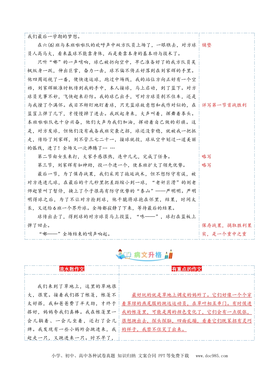 小学、初中、高中各种试卷真题知识归纳文案合同PPT等免费下载www.doc985.com写作:叙事不写流水账[来源:学科网ZXXK]一、什么是“流水账”流水账,指的是写作文时,在叙述或描写时,事无巨细地将内容表述出来,使得文章在内容上没有重点,主题不够突出的情况。什么样的作文像流水账呢?下面列举几种情况。1.有的文章写起来之后,什么事都只是提一下,什么事又都不细说。【示例1】今天早上,我还是六点半起床,七点十分到了学校。上完早操和自习课后,是第一节课,第一节课下课后我们玩得很高兴。很快第二节课又上课了,是数学课,老师下课后内容没讲完就拖长了课堂。第三节英语,我挺喜欢的。第四节课语文。好不容易到下课,我们一起去吃午饭。下午只有两节课,很快就上完了。今天真是开心的一天啊!”2.还有一种情况,就是像录音机一样事无大小,全都记下来。毫无紧要的一件事,他也能写一两百字,不紧不慢地挨个儿细细说来,让读者根本找不出他重点要说什么。这样的作文虽然很具体很详细,但我们仍然可以把它当成流水账。二、为什么会写“流水账”1.选择“线性”材料今天早上……六点半……七点十分……第一节课……第二节课……第三节……第四节……午饭……下午……2.内容写不具体今天学校大扫除。老师先给我们分工,我被分到了擦玻璃组。我先去打水,又把抹布浸湿后开始擦玻璃。终于干完了,今天可真是充实又辛苦的一天啊!3.抓不住重点,没有详略之分【示例2】我们来到了草地上,这里的草地很大,很宽。接着我们搭了帐篷,帐篷不太好搭,我和爸爸费了半天劲,才终于搭好,妈妈夸我们真棒。我在帐篷里一会儿躺着、一会儿坐着,还打了会几牌。我发现有一些小妈蚱会跳进来,我赶走一只,又跳进来一只。时不早了,妈妈让我们收起帐篷。我们就收起怅篷,往河边走去。三、不让作文变成“流水账”的方法1.选择“点形”材料2.把事情写具体学会观察——学会提问——学会描写——学会联想3.学会抓重点每一件事的过程都可以分为几个小环节,如果前前后后每个环节都面面俱到、平均用墨,作文就会小学、初中、高中各种试卷真题知识归纳文案合同PPT等免费下载www.doc985.com写成流水账;反之,如果我们抓住自己感受最深的一个环节去写,其余的简单带过或干脆不写,就能写出一篇重点突出的好文章。(1)慎审题,抓题眼——围绕题眼详写什么是题眼?题眼就是暗示作文的重点或中心的词语。比如《一个乐于助人的同学》,“乐于助人”就是题眼。怎样抓题眼?①单词题:题目就是题眼。如《悔恨》《关怀》等。②短语和句子题:题眼往往是修饰词,如《特别的礼物》中“特别”是题眼。③没有修饰词:题眼往往是动词。如《家乡变了》中的“变”是题眼。(2)合理安排结构①头不重:文章的开头并不一定要交代那么多东西才行,只要它能达到两个要点就够了:第一,要能围绕所要表达的中心思想引出下面的内容;第二,能吸引别人读下去。②脖不细:人的脖子起着连接大脑指挥部和身体阵地的作用,部分同学在写作文时,开头第一段说一件事,第二段说另一件事,两件事并没有必然或因果的联系,看文章的人根本不知道文章要重点说什么。我们可以把这种情况理解成“脖细”。因此我们在写作时要做到恰当运用铺垫的表现手法,它可以起到三个主要作用:承上启下、介绍故事发生的原由和设置伏笔。③腰不粗:有的同学刚开始写作文时,不管文章里写到多少字,都是三大段。作文宝宝除了“头”和“脚”之外,其它部分都堆成一坨了。层次不清,段落不明,重点不突出。因此,我们要注意作文的合理分段,一个意思则分一段,重点段落详写。④尾不大:文章的结尾应是重点要处理的部位,但好多同学在结尾处花的功夫却明显不够,好多结尾,往往都成了点缀,说明整个文章已经写完了,并没能发挥作用。好的结尾如画龙点睛。要简洁有力,收束全文,有引申,令人回味无穷。《一件珍贵的衬衫》,开头写了“在我的家里,珍藏着一种白色的确凉衬衫。”结尾写道:“四年来,这件珍贵的衬衫,我精心地收藏着,没有舍得穿它一次。”小兴安岭是一座巨大的宝库,也是一座美丽的大花园。——《美丽的小兴安岭》范文展示篮球比赛一年一度的...
