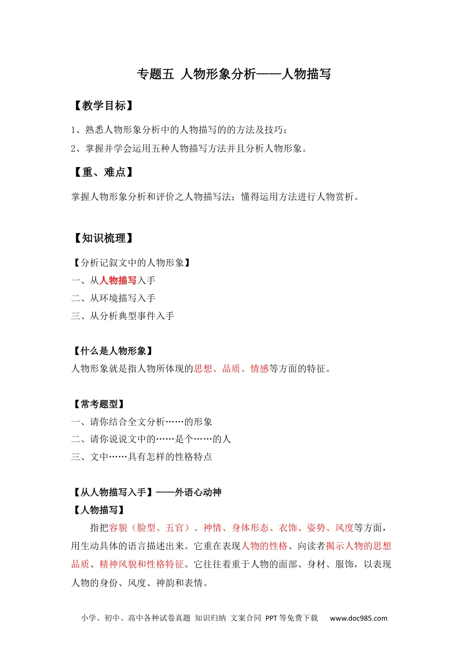 小学、初中、高中各种试卷真题知识归纳文案合同PPT等免费下载www.doc985.com专题五人物形象分析——人物描写【教学目标】1、熟悉人物形象分析中的人物描写的的方法及技巧;2、掌握并学会运用五种人物描写方法并且分析人物形象。【重、难点】掌握人物形象分析和评价之人物描写法;懂得运用方法进行人物赏析。【知识梳理】【分析记叙文中的人物形象】一、从人物描写入手二、从环境描写入手三、从分析典型事件入手【什么是人物形象】人物形象就是指人物所体现的思想、品质、情感等方面的特征。【常考题型】一、请你结合全文分析……的形象二、请你说说文中的……是个……的人三、文中……具有怎样的性格特点【从人物描写入手】——外语心动神【人物描写】指把容貌(脸型、五官)、神情、身体形态、衣饰、姿势、风度等方面,用生动具体的语言描述出来。它重在表现人物的性格、向读者揭示人物的思想品质、精神风貌和性格特征。它往往着重于人物的面部、身材、服饰,以表现人物的身份、风度、神韵和表情。小学、初中、高中各种试卷真题知识归纳文案合同PPT等免费下载www.doc985.com例1:炊事班班长快四十岁了,个子挺高,背有点儿驼,四方脸,高颧骨,脸上布满了皱纹。——《金色的鱼钩》解析:运用外貌描写,通过“脸上布满了皱纹”,生动形象地说明了老班长经历长期艰苦的革命斗争,饱经风霜。例2:他正在厨房里,紫色的圆脸,头戴一顶小毡:帽,颈上套一个明晃晃的银项圈,这可见他的父亲十分爱他,怕他死去,所以在神佛面前许下愿心,用圈子将他套住了。——《少年闰土》解析:运用外貌描写,刻画了少年闰土健康、朴实的形象。【语言描写】语言描写是塑造人物形象的重要手段。成功的语言描写总是鲜明地展示人物的性格,生动地表现人物的思想感情,深刻地反映人物的内心世界,使读者“如闻其声,如见其人”,获得深刻的印象。语言描写包括人物的独白和对话。独白是反映人物心理活动的重要手段。对话可以是两个人的对话,也可以是几个人的相互交谈。语言描写要反映人物的个性特征。由于时代、职业、身份、年龄等因素造成的差异,人们说话的内容、方式各有不同,语言描写就是要抓住能表现人物个性的语言,写出“这一个”的不同来,使读者如闻其声,如睹其容。语言描写宜简洁得体,不可拖沓散漫,有悖人物身份。例3:一语未了,只听后院中有人笑声,说:“我来迟了,不曾迎接远客!”黛玉纳罕道:“这些人个个敛声屏气,恭肃严整如此,这来者系谁,这样放诞无礼?”——《红楼梦》解析:运用语言描写,未见其人,先闻其声,生动形象地写出了王熙凤泼辣爽快的个性,也暗含了其在贾府的地位。例4:“全体安静,注意听命令!把救生艇放下去。妇女先走,其他乘客跟上,船员断后,必须把六十人救出去。”——《“诺曼底号”遇难记》解析:运用了语言描写,写出了哈尔威船长的临危不惧、镇定自若、指挥有方,在情急之中忘记了自己,表现了他在灾难来临之前的大无畏和舍己为人的精神。小学、初中、高中各种试卷真题知识归纳文案合同PPT等免费下载www.doc985.com【心理描写】心理描写就是对人物内心的思想情感活动进行描写。描写人物的思想活动,能反映人物的性格,展示人物的内心世界。通过对人物心理的描写,能够直接深入人物心灵,揭示人物的内心世界,表现人物丰富而复杂的思想感情。常有以下几种表达方式:内心独白、动作暗示、景物烘托、心理概述。例5:她忐忑不安地想:“他会说什么呢?这是闹着玩的吗?自己的五个孩子已经够他受的了……是他来啦?……不,还没来!……为什么把他们抱过来啊?……他会揍我的!那也活该,我自作自受……嗯,揍我一顿也好!”——《穷人》解析:“忐忑”是指心神不定。“忐忑不安”形容心神不安定。桑娜抱回孤儿后,面对自己的五个孩子,想想生死未卜的丈夫,她紧张、担忧,她不知道丈夫会说什么,觉得自己这样做给丈夫增加了负担,觉得对不起他;她担心丈夫突然回来,不知道怎么告诉丈夫自己把孤儿抱回家的事。但是她宁可让丈夫揍一顿,也要收养孤儿。文章内容真实地展现了桑娜此时的心理活动。透过桑娜的心理活动,读者能充分感受到生活给桑娜带来的压力...