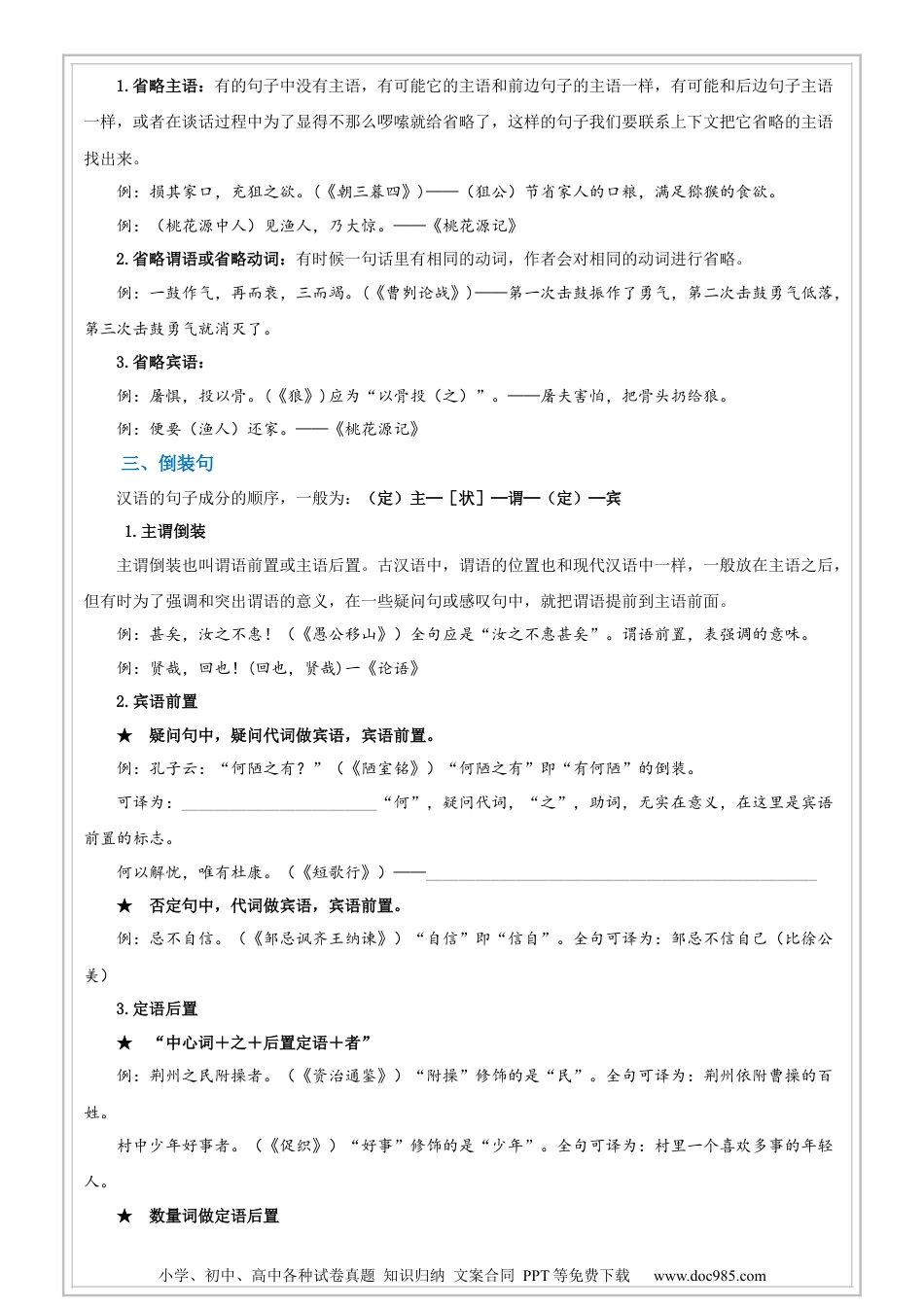 小学、初中、高中各种试卷真题知识归纳文案合同PPT等免费下载www.doc985.com古文:文言文阅读之句式文言文字词一、词类活用1.名词用作动词。例:“雨雪霏霏”“天雨墙坏”。雨:____________。例“驴不胜怒,蹄之”。蹄:____________。2.形容词用作动词。例:“天下苦秦久矣”。苦:____________。例:“吾妻之美我者,私我也”。美:____________。3.名词作状语。例:“群臣吏民能面刺寡人之过者”。面:____________。二、通假字1.不亦说乎。“说”通“悦”,意思是:高兴。《论语·学而》2路转溪桥忽见。“见”通“现”,意思是:显现,出现。《西江月》3.食之不能尽其材。“食”通“饲”,意思是:喂养。《马说》三、一词多义(一)举1.____________:举头望明月,低头思故乡。(《静夜思》)2.____________:今亡亦死,举大计亦死。(《陈涉世家》)3.____________:举世无双。4.____________:举一反三。5.____________:管夷吾举于士。(《生于忧患,死于安乐》)(二)道1.____________:会天大雨,道不通。(《陈涉世家》)2.____________:伐无道,诛暴秦。(《陈涉世家》)3.____________:策之不以其道。(《马说》)4.____________:不足为外人道也。(《桃花源记》)四、古今异义1.词义扩大江河:古,专指____________;今,普通名词,成为河流的通名。小学、初中、高中各种试卷真题知识归纳文案合同PPT等免费下载www.doc985.com例:水由地中行,江、淮、河、汉是也。(《孟子·滕文公》)2.词义缩小臭:古,____________;今,只指难闻的气味。例:左佩刀,右备容臭(xiù),烨(yè)然若神人。(《送东阳马生序》)3.词义转移闻:古,________,是听觉;今,一般指“嗅觉”。例:我闻其声,不见其身。(《诗经》)4.词义感情色彩的变化爪牙:古,原指________________;今,指帮凶、狗腿子一类的坏人。例:今阁下为王爪牙,为国藩(fān)垣(yuán)。(《与凤翔邢尚书书》)5.其他常见古今异义词举例“或”:古,有的。今,或者。例:或以为死,或以为亡。(《陈涉世家》)思考:这些诗文在翻译的时候有什么需要注意的呢?1.屠惧,投以骨。(《狼》)2.甚矣,汝之不惠!(《愚公移山》)3.何以解忧?唯有杜康。(《短歌行》)4.三岁贯汝,莫我肯顾。(《诗经·魏风·硕鼠》)文言文特殊句式一、判断句判断句是比较简单的一种句式,通常都有固定而明显的格式,我们在翻译中要注意把“……是……”翻译出来。1.句式一:“……,……也。”例:夫战,勇气也。(《曹刿论战》)——作战,________________________。2.句式二:“……者,……也”。这是最常见的格式。例:廉颇者,赵之良将也。(《廉蔺列传》)——________________________。3.句式三:“……,……者也”。例:城北徐公,齐国之美丽者也。(《邹忌讽齐王纳谏》)——________________________。4.句式四:“……者,……”例:当立者乃公子扶苏。(《陈涉世家》)——________________________。二、省略句小学、初中、高中各种试卷真题知识归纳文案合同PPT等免费下载www.doc985.com1.省略主语:有的句子中没有主语,有可能它的主语和前边句子的主语一样,有可能和后边句子主语一样,或者在谈话过程中为了显得不那么啰嗦就给省略了,这样的句子我们要联系上下文把它省略的主语找出来。例:损其家口,充狙之欲。(《朝三暮四》)——(狙公)节省家人的口粮,满足猕猴的食欲。例:(桃花源中人)见渔人,乃大惊。——《桃花源记》2.省略谓语或省略动词:有时候一句话里有相同的动词,作者会对相同的动词进行省略。例:一鼓作气,再而衰,三而竭。(《曹刿论战》)——第一次击鼓振作了勇气,第二次击鼓勇气低落,第三次击鼓勇气就消灭了。3.省略宾语:例:屠惧,投以骨。(《狼》)应为“以骨投(之)”。——屠夫害怕,把骨头扔给狼。例:便要(渔人)还家。——《桃花源记》三、倒装句汉语的句子成分的顺序,一般为:(定)主─[状]─谓─(定)─宾1.主谓倒装主谓倒装也叫谓语前置或主语后置。古汉语中,谓语的位置也和现代汉语中一样,一般放在主语之后,但有时为了强调和突出谓语的意义,在一些疑问句或感叹句...