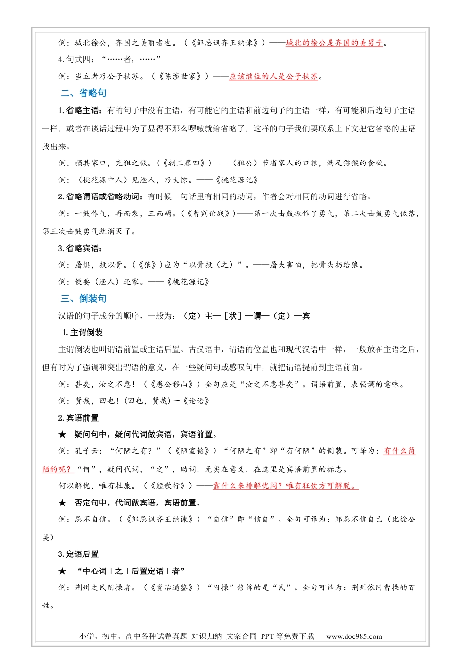 小学、初中、高中各种试卷真题知识归纳文案合同PPT等免费下载www.doc985.com古文:文言文阅读之句式文言文字词一、词类活用1.名词用作动词。例:“雨雪霏霏”“天雨墙坏”。雨:下雨。例“驴不胜怒,蹄之”。蹄:用蹄踢。2.形容词用作动词。例:“天下苦秦久矣”。苦:苦于,被压迫。例:“吾妻之美我者,私我也”。美:认为……美。3.名词作状语。例:“群臣吏民能面刺寡人之过者”。面:当面。二、通假字1.不亦说乎。“说”通“悦”,意思是:高兴。《论语·学而》2路转溪桥忽见。“见”通“现”,意思是:显现,出现。《西江月》3.食之不能尽其材。“食”通“饲”,意思是:喂养。《马说》三、一词多义(一)举1.抬:举头望明月,低头思故乡。(《静夜思》)2.发起,兴起:今亡亦死,举大计亦死。(《陈涉世家》)3.全:举世无双。4.提出:举一反三。5.任用:管夷吾举于士。(《生于忧患,死于安乐》)(二)道1.道路:会天大雨,道不通。(《陈涉世家》)2.道义:伐无道,诛暴秦。(《陈涉世家》)3.方法:策之不以其道。(《马说》)4.说:不足为外人道也。(《桃花源记》)四、古今异义1.词义扩大江河:古,专指长江和黄河;今,普通名词,成为河流的通名。小学、初中、高中各种试卷真题知识归纳文案合同PPT等免费下载www.doc985.com例:水由地中行,江、淮、河、汉是也。(《孟子·滕文公》)2.词义缩小臭:古,气味;今,只指难闻的气味。例:左佩刀,右备容臭(xiù),烨(yè)然若神人。(《送东阳马生序》)3.词义转移闻:古,听,是听觉;今,一般指“嗅觉”。例:我闻其声,不见其身。(《诗经》)4.词义感情色彩的变化爪牙:古,原指武臣或得力助手;今,指帮凶、狗腿子一类的坏人。例:今阁下为王爪牙,为国藩(fān)垣(yuán)。(《与凤翔邢尚书书》)5.其他常见古今异义词举例“或”:古,有的。今,或者。例:或以为死,或以为亡。(《陈涉世家》)思考:这些诗文在翻译的时候有什么需要注意的呢?1.屠惧,投以骨。(《狼》)投以骨:“以骨投(之)”,状语后置2.甚矣,汝之不惠!(《愚公移山》)甚矣,汝之不惠:“汝之不惠甚矣”,主谓倒装3.何以解忧?唯有杜康。(《短歌行》)何以解忧:“以何解忧”,倒装(宾语前置)4.三岁贯汝,莫我肯顾。(《诗经·魏风·硕鼠》)莫我肯顾:“莫肯顾我”,宾语前置文言文特殊句式一、判断句判断句是比较简单的一种句式,通常都有固定而明显的格式,我们在翻译中要注意把“……是……”翻译出来。1.句式一:“……,……也。”例:夫战,勇气也。(《曹刿论战》)——作战,靠的是勇气。2.句式二:“……者,……也”。这是最常见的格式。例:廉颇者,赵之良将也。(《廉蔺列传》)——廉颇是赵国的良将。3.句式三:“……,……者也”。小学、初中、高中各种试卷真题知识归纳文案合同PPT等免费下载www.doc985.com例:城北徐公,齐国之美丽者也。(《邹忌讽齐王纳谏》)——城北的徐公是齐国的美男子。4.句式四:“……者,……”例:当立者乃公子扶苏。(《陈涉世家》)——应该继位的人是公子扶苏。二、省略句1.省略主语:有的句子中没有主语,有可能它的主语和前边句子的主语一样,有可能和后边句子主语一样,或者在谈话过程中为了显得不那么啰嗦就给省略了,这样的句子我们要联系上下文把它省略的主语找出来。例:损其家口,充狙之欲。(《朝三暮四》)——(狙公)节省家人的口粮,满足猕猴的食欲。例:(桃花源中人)见渔人,乃大惊。——《桃花源记》2.省略谓语或省略动词:有时候一句话里有相同的动词,作者会对相同的动词进行省略。例:一鼓作气,再而衰,三而竭。(《曹刿论战》)——第一次击鼓振作了勇气,第二次击鼓勇气低落,第三次击鼓勇气就消灭了。3.省略宾语:例:屠惧,投以骨。(《狼》)应为“以骨投(之)”。——屠夫害怕,把骨头扔给狼。例:便要(渔人)还家。——《桃花源记》三、倒装句汉语的句子成分的顺序,一般为:(定)主─[状]─谓─(定)─宾1.主谓倒装主谓倒装也叫谓语前置或主语后置。古汉语中,谓语的位置也和现代汉语中一样,一般放在主语之后,但有时为了强调和突出谓语的意义,在一些疑问...