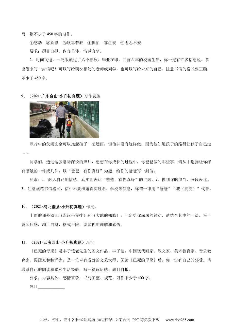 小学、初中、高中各种试卷真题知识归纳文案合同PPT等免费下载www.doc985.com专题26应用文写作学校:___________姓名:___________班级:___________1.(2020·江苏海安·小升初真题)下列说法不正确的一项是()A.外婆告诉我,过年的时候吃鱼,寓意是“年年有余”。B.习作时引用名人名言,可以使自己的观点更具说服力。C.辩论前,要作充分的准备;辩论时,既要证明自己,又要反驳对方。D.我给柳老师写了一封信,在结尾处写上日期,然后在下面一行写下自己的名字。2.(2020·贵州安顺·小升初真题)写信封铜陵市东方小学(邮编:230061)的李兵同学要给合肥市第一实验小学(邮编:244000)的陈亮同学写一封信,请你替他写个信封。3.(2020·江西临川·小升初真题)选择正确的答案,将序号填在括号里。A.通知B.建议书C.表扬信D.请柬E.请假条F.日记1.别人做了好事,我们可以给他写一封(______)。2.学校要开会或举行活动,我们采用(______)的形式告诉大家,如果有事不能参加,那么就要写(______)。3.针对当地街道交通混乱或环境卫生差的现象,我们可以把自己好的想法用(______)的形式反映给主管部门。四、书面表达4.(2020·山西·太原市小店区实验小学校小升初真题)习作。亲爱的孩子,六年的小学生活即将画上句号,对于自己或者家庭,对于国家或者社会,相信你有埋藏小学、初中、高中各种试卷真题知识归纳文案合同PPT等免费下载www.doc985.com于心底的心愿,现在请你以书信的方式将它写下来。希望,这封特别的书信会在多年后带给你很多的感动和怀念。(要求:语句通顺,中心突出,感情真实,注意书信格式正确哦,字数不少于400字。)5.(2021·广东东莞·小升初真题)习作根据下面题目,按要求完成习作。要毕业了,小林说:“毕业就是到达,我喜欢到达时的放松。”小芳说:“毕业就是出发,我喜欢出发时的新奇。”请以“今天我毕业了”为话题,给自己、父母或老师写一封信,讲述自己的所见、所闻和所感。注意书信的格式,署名统一写“张华”。要求:1.先拟好题目,写在作文格中;2.内容具体,语句通顺,写出自己的真情实感;3.书写工整,不写错别字,正确运用标点符号;4.不要出现真实的校名、姓名。6.(2020·湖北·武汉市青山区新沟桥小学小升初真题)作文任选一题题目一:给中学老师的一封信提示:就要进入中学了,为了让中学老师尽快地了解我们,赏识我们,我们可以用书信的形式向中学老师介绍自己,如兴趣、爱好、特长、担任过什么职务、参加过什么活动等,还可以谈谈进入中学后的打算。想怎么写就怎么写,要注意信的格式。信中不出现真实的校名和人名。题目二:心愿选择你最想和别人交流的心愿写下来。7.(2020·湖北·武汉市硚口区星火小学小升初真题)习作。写给的一封信习作要求:六年的小学时光,一定给同学们留下了许多美好的回忆……你一定还有很多很多的话,想对母校、老师、同学或自己述说,请你按照书信的格式述说一下自己的心声,表达对母校、老师、同学的依依惜别之情,或对未来的期许。8.(2021·辽宁海城·小升初真题)习作。从以下两个题目中,任选其中写一篇。要求内容具体,表达自己的真情实感,字迹工整、语句通顺,写的时候注意正确使用标点符号,有卷面分,字数不少于400字。1.生活中经历的一切,都会带给我们各种各样的情感体验。请从下面选择一种使你印象最深的感受,小学、初中、高中各种试卷真题知识归纳文案合同PPT等免费下载www.doc985.com写一篇不少于450字的习作。①感动②欣慰③欣喜若狂④惧怕⑤沮丧⑥忐忑不安要求:题目自拟,内容具体,情感真挚。2.时间飞逝,一眨眼就过了六个春秋。毕业在即,回首六年的校园生活,你一定有许多话想说。拿出笔来写一封信吧!可以写给朝夕相处的老师或同学,也可以写给未来的自己。注意书信的格式要正确,不少于450字。9.(2021·广东台山·小升初真题)习作表达照片中的父亲完全可以抱起孩子一起遮雨,但他并没有这样做,因为他知道孩子的路得让孩子自己走……同学们,透过这张意味深长的照片,想想在你成长的过程中,你爸爸做的那些事,请从中选择让你深有感触的一件或几...