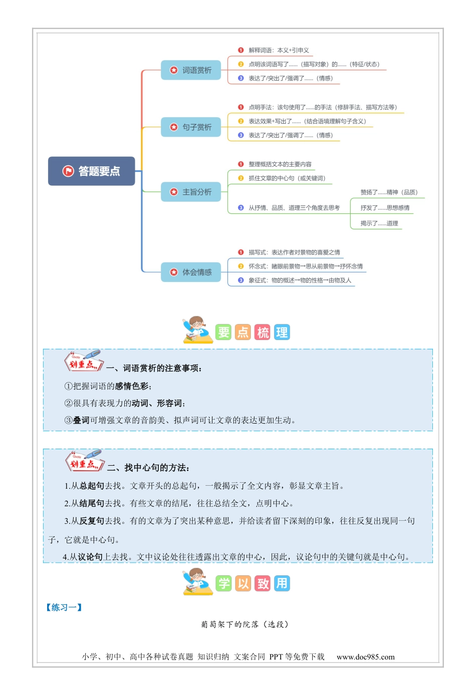小学、初中、高中各种试卷真题知识归纳文案合同PPT等免费下载www.doc985.com阅读:写景状物文阅读小学、初中、高中各种试卷真题知识归纳文案合同PPT等免费下载www.doc985.com一、词语赏析的注意事项:①把握词语的感情色彩;②很具有表现力的动词、形容词;③叠词可增强文章的音韵美、拟声词可让文章的表达更加生动。二、找中心句的方法:1.从总起句去找。文章开头的总起句,一般揭示了全文内容,彰显文章主旨。2.从结尾句去找。有些文章的结尾,往往总结全文,点明中心。3.从反复句去找。有的文章为了突出某种意思,并给读者留下深刻的印象,往往反复出现同一句子,它就是中心句。4.从议论句上去找。文中议论处往往透露出文章的中心,因此,议论句中的关键句就是中心句。【练习一】葡萄架下的院落(选段)小学、初中、高中各种试卷真题知识归纳文案合同PPT等免费下载www.doc985.com葡萄架就在院门口,有十来年了,枝干道劲粗壮,缠绕的枝蔓爬了大半个院子。冬天时看着全是枯枝,很肃杀衰败,令人心生寂寞之感。一到春天就不同了。树枝里仿佛藏了一个魔术师,一天抽一些绿出来,眨眼就满目鲜绿,嫩嫩地在风里摇晃,看得人心里忍不住生出许多喜爱。叶子是手掌形的,像一只只婴孩的手掌轻轻地摆。接着开花了,浅绿色的小花一串又一串地从手掌中垂下来,碎米粒似的,世界上本来绿色的花就少得很,且小得如此可怜,又被浓荫给遮蔽了,需认真才看得清。不过不着急,转瞬间它们就落了,飘一层浅浅的绿色和淡然悠远的香气。葡萄花落了,藤上渐渐地结了青果,小小的,在风中悄悄长大。这些日子总是天暖风轻,让人平白无故地添了-些慵懒和倦怠。搬一把竹椅躺在那儿,享受这和风送爽、小鸟啼鸣的清净。睁眼见阳光从叶隙里撤下无数个圆圆的光圈,闭眼听见蜜蜂在花间忙碌。这样令人快乐的时间总是过得极快的,十几年了,仿佛我就没挪过地方,一直是个身穿花衣的农家少女坐在葡萄架下想一些不着边际的事情。1.选段按照____________顺序写出了葡萄生长变化的过程。2.随着葡萄的生长变化,人的心情、状态也不断变化。读选段,依次写出“我”的心情、状态变化。____________——____________——慵懒和倦怠——____________3.“树枝里仿佛藏了一个魔术师,一天抽一些绿出来,眨眼就满目鲜绿,嫩嫩地在风里摇晃,看得,人心里忍不住生出许多喜爱。”联系上下文,写出这句话带给你的感受。________________________________________________________________________________________________________________________________________________________________________________________4.“葡萄花落了,藤上渐渐地结了青果,小小的,在风中悄悄长大。”句子中连续使用了三个叠词,这样写有什么好处?________________________________________________________________________________________________________________________________________________________________________________________【答案】1.时间2.寂寞喜爱快乐3.这句话让人感受到春天到来,葡萄发芽长叶的蓬勃生机。4.用“渐渐”“小小”“悄悄”三个叠词,描述更生动形象,叠词增强了语言的韵律感,读起来朗朗上口,富有音乐美;而且叠词并不是简单的重复,它的恰当运用,能和谐音律,表达丰富的思想内容,收到较好的艺术效果,给人以美的享受。【解析】1.本题考查文章写作顺序的分析。仔细阅读文章内容。从“冬天时看着全是枯枝”“一到春天就不同了。”“接着开花了”“不过不着急,转瞬间它们就落了”等可以看出来是按时间顺序写出了葡萄小学、初中、高中各种试卷真题知识归纳文案合同PPT等免费下载www.doc985.com生长变化的过程。2.本题考查理解文章内容,寻找关键句子。从“冬天时看着全是枯枝,很肃杀衰败,令人心生寂寞之感。”可知最初的心情是寂寞。从“眨眼就满目鲜绿,嫩嫩地在风里摇晃,看得人心里忍不住生出许多喜爱。”可知心情是喜爱。从“这样令人快乐的时间总是过得极快的”可知最后的心情是快乐。3.本题考查理解句子意思。“树枝里仿佛藏了一个魔术师,一天抽一些绿出来,眨眼就满目鲜绿,嫩嫩地在风...