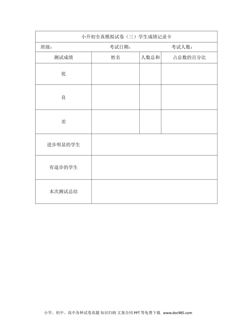 小升初全真模拟试卷(三)学生成绩记录卡班级:考试日期:考试人数:测试成绩姓名人数总和占总数的百分比优良差进步明显的学生有退步的学生本次测试总结小学、初中、高中各种试卷真题知识归纳文案合同PPT等免费下载www.doc985.com