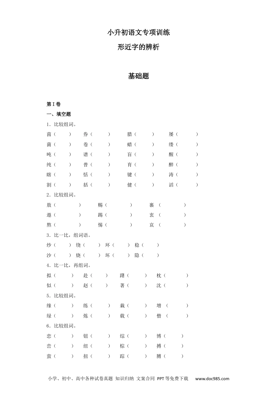 小学、初中、高中各种试卷真题知识归纳文案合同PPT等免费下载www.doc985.com小升初语文专项训练形近字的辨析基础题第I卷一、填空题1.比较组词。茵()券()腊()屡()菌()卷()蜡()缕()吨()谱()盲()醒()纯()普()育()醉()瞎()恬()键()涛()割()括()健()滔()2.比较组词。敖()赐()裹()遨()踢()衷()熬()惕()哀()3.比一比,组词语。纱()绕()环()稳()[来源:Z§xx§k.Com]沙()烧()坏()隐()4.比一比,再组词。拟()赴()躇()枕()似()赵()著()沈()5.比较组词。缘()练()栽()增()绿()炼()载()僧()6.比较组词。恋()钮()综()博()峦()纽()棕()搏()蛮()扭()踪()膊()小学、初中、高中各种试卷真题知识归纳文案合同PPT等免费下载www.doc985.com7.比较组词。善()期()饿()破()膳()欺()峨()坡()8.比较组词。哨()稍()徒()延()捎()梢()徙()廷()链()朦()惕()舔()涟()蒙()踢()添()9.比较组词。寇()躁()遭()欲()冠()燥()糟()浴()博()碑()僻()筒()搏()脾()劈()桶()10.比一比,再组词。挽()倍()逢()佳()异()晚()培()缝()挂()导()11.辨字组词。津()袖()扒()泼()律()抽()趴()拔()12.根据读音,在括号里写出恰当的汉字。1.dǎo向()()屿()蛋卧()2.dù()假()船()皮()鹃3.miǎn()除()强()怀()腆4.róng()易()树光()()岩5.mó薄()()托()炼()菇13.选字组词。⑴建健()康()设()身()议⑵形型()状造()()态典()⑶题提()问()字()纲()材⑷遐暇瑕()迩闻名目不()接应接不()()想联翩小学、初中、高中各种试卷真题知识归纳文案合同PPT等免费下载www.doc985.com()不掩瑜()瑜互见洁白无()白璧微()14.形近字组词。账()竞()驰()辨()账()竟()弛()辩()15.根据读音,在括号里写出恰当的汉字。⑴dǎo向(),()屿,()蛋,卧()⑵dù()假,()船,()皮,()鹃⑶miǎn()除,()强,()怀,()腆⑷róng()易,()树,光(),()岩[来源:学科网ZXXK]⑸mó薄(),()托,()炼,()菇16.找出句子中写错的字并用标“”出,然后在括号里改正过来。⑴每天放学回家,小青总是先作功课在玩。()⑵同学们以经养成了良好的学习习贯。()⑶时钟敲了七下,我来不极吃早参了,背起书包上学去了。()⑷经长看电视会影像你的视力。()⑸他以玩强的义力战胜伤残,重反工作冈位,做出了重大供献。()⑹这条小路弯弯屈屈,高底不平。()⑺我们应该遵敬帅长。()⑻深篮的天空挂着一轮金黄的园月。()⑼猫是捉老鼠的能手,这还多亏他有锐力的爪子。()⑽幽静的公圆里,璧波粼粼的湖面上,因为有了九曲桥,更显出湖光水色的谜人魅力。()小学、初中、高中各种试卷真题知识归纳文案合同PPT等免费下载www.doc985.com提升题第II卷一、选择题17.用“√”画出正确的拼音或字词。度假(jiàjiǎ)倾听(qīnɡqīn)摩天大厦(shàxià)鳞次栉比(jiézhì)(漫曼)步举世闻(明名)(宽阔宽广)的街道(观赏欣赏)音乐(轻柔轻轻)的海风(闪动闪耀)的灯光18.给带点字选择正确的解释:①不相同②特别③另外的④惊奇(1)独在异乡为异客。()(2)大海深处景色奇异。()(3)同学们异口同声地回答:“好!”()(4)看到日全食的景象,我们惊异地喊道:“太神奇了!”()19.选词填空。(1)幕慕暮()色银()爱()(2)戒诫械()备机()劝()20.选字组词板版返(1)()回()面黑()篇遍骗(2)诗()受()()布秘密(3)()书茂()机()槽糟遭(4)水()()糕()遇21.选字填空。扭纽忸枢()()打()捏较胶绞狡饺佼皎跤()()者比()()猾水()小学、初中、高中各种试卷真题知识归纳文案合同PPT等免费下载www.doc985.com()洁()水()刑摔()绪睹堵赌打()耳闻目()情()()车22.我会选,给加横线的字音选择正确的读音。差异(chāchāi)比较(jiǎojiào)筛(shīshāi)选辐(fúfū)射淘汰(tàitāi)佳肴(yáoxiáo)盐碱(jiànjiǎn)浩瀚(hànhān...