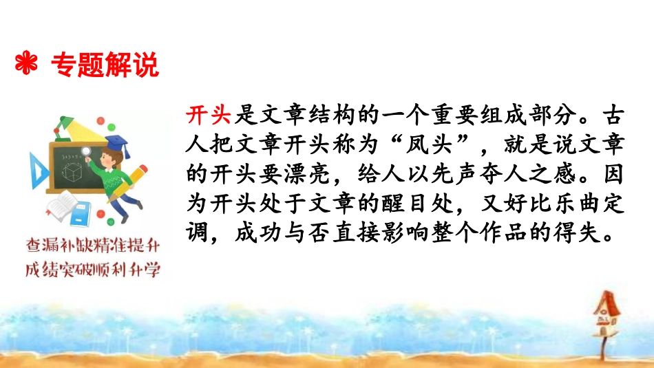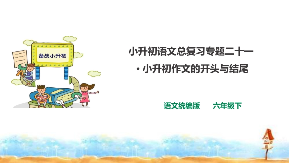 小升初语文总复习专题二十一·小升初作文的开头与结尾语文统编版六年级下开头是文章结构的一个重要组成部分。古人把文章开头称为“凤头”,就是说文章的开头要漂亮,给人以先声夺人之感。因为开头处于文章的醒目处,又好比乐曲定调,成功与否直接影响整个作品的得失。❃专题解说开篇的原则简洁生动切题扣文开门见山,即不拐弯抹角,直截了当点明与题目有关的人、事、物,揭示主题的方法。一、开门见山法、直接点题题目:《第一次成功》“人们都知道,成功总是甜蜜并且温馨的,而我的第一次成功,却是甜中带涩,涩中带甜,别有一番滋味……”开头引用警句、名言、诗句、歌词或俗语、谚语、典故等,可以达到吸引读者,帮助突出中心的作用。二、引用法题目:《我的同桌》“孔子曰:‘三人行,必有我师焉’。我的同桌小刚,便如我的良师益友,使我真正懂得什么叫真挚,什么叫友谊;如何学会生活,争取进步……”题目:《雪中西湖》杨万里写过“映日荷花别样红”的六月西湖,苏轼写过“湖光潋滟,山色空蒙”的雨中西湖,可是他们也许不知道雪中的西湖更有特殊的魅力。开篇使用修辞,以引起读者对所要面对的事物或观点的兴趣,使文章发端新颖,极富吸引力。三、巧用修辞展示风采题目:《那一次,我懂得了爱》鲜花的美丽,是因为它得到了阳光的爱;小树的茁壮,是因为它得到了雨露的爱;我们的健康成长,是因为在生命的每一天里,得到了母亲博大的爱……开头通过描绘环境、抒写感情来渲染气氛、设定情境,可为全文定下感情的基调,为全文创设出一种情境美。四、创设情境,引人入胜题目:《可爱的小邻居》“春夏季节,满山遍野一片雪白。那是家乡的酸枣花开了。看到了酸枣花,不禁又使我想起我的一位小邻居,她便如这可爱的小花,也这么冰清雪白……”题目:《送别》秋风萧瑟,呜呜地吹着我的发梢;秋雨沙沙,把它的泪珠溅在我单薄的衣服上;秋的柳树,在风雨中摇来摇去,黄叶黯然地低下了头。我望着远去的自行车,落下了离别的泪:小明你何时归来?在泪水中,我仿佛朦胧地想起了我和小明相遇、相识的点点滴滴。以直接提问或设置悬疑开启下文,激发读者心中的疑问,吸引读者急切地读下去。五、设问置疑,制造悬念。“这几天,我象丢了魂似的,坐在课室向外呆望。不是因为挨了老师的批评,也不是受了父母的责备,而是外面还有一个仍然需要我再去帮助和照顾的孤寡老人……”练习:练习:在你的学习生涯中,经历了许多考在你的学习生涯中,经历了许多考试,总有一次让你特别难忘,请以试,总有一次让你特别难忘,请以《《难忘那难忘那一次考试一次考试》》为题,写一个记叙文的开头。为题,写一个记叙文的开头。人们把好文章的结尾誉为“豹尾”,是说结尾要干脆有力。好文章的结尾,作者无不在“严谨、自然、和谐、统一”的结构原则上,根据文章的内容和表达需要,选择恰当的结尾,给人以“余音不绝”之感。❃专题解说结尾原则:严谨自然和谐统一“通过这件事,我终于明白了这样一个道理:真正的友谊并非彼此索取,而在于互相信任和互相帮助。愿人间永存诚挚的友爱!”一、小结领悟式结尾“回家的路上,我忽然发现:天格外的蓝,云格外的白,阳光格外的明媚。我不禁对着这蓝天白云高声喊道:我终于也能获得成功了!”二、写景抒情式结尾“外婆啊,外婆,外面的雪花又飘了,你还记得苹儿吗?苹儿好想你哟。”我絮絮地念着,仿佛又看到了外婆那一躬一直的身影……”三、自然顺畅、以情(景)动人法作文题目:《我品尝到了成功的喜悦》提示与要求:六年小学生活中,我们独立攻克难题,参加过特色活动……每逢我们成功的时候,心中总有无尽的喜悦,请把你做过某事或者参加学校某项活动的经过及成功时的内心感受写下来,要有条理,语句通顺连贯,写出自己真实感受,不少于550字。❃例题1、成功可以给人带来喜悦和快乐,也可以增强人的自信心和自豪感,在我的生活中,我成功过无数次,但给我带来最多自豪感的还是那次我成功的......2、每一个人都希望成功,但是成功是来之不易的,成功给我们带来的喜悦,更是无限的。3、成长中的快乐,不但让我学到了才艺,更重要的是让我懂得了一个人生道理:失败乃是成功之母...