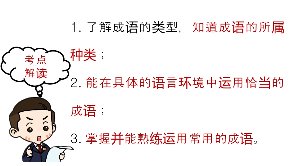 04成语主讲人小董老师1.了解成的型,语类知道成的所语属种类;2.能在具体的言境中用恰的语环运当成语;3.掌握能熟用常用的成并练运语。考点解读考范查围:成累、成典故、成用语积语语运考型查题:空填、选择主,为答问少较分比重值:2-5分,部分卷可试达10分考点度难:★★★考点度热:★★★★★命题趋势:范大围较,型活题灵小学常见成语_出处归类神话传说类神包括神话传说话与传说两个部分。一偏重于指于人神个关起源万物初始的来历,一偏个重于口流的于世界源头传关来及英雄故事的法说。古口远头文作品,反映了的人学当时对自然的和征服自然的愿望。认识夸父逐日比人有宏大的志向,持不懈或有巨大的力量和。喻坚拥气概《山海经·海外北经》:“夸父日逐走,入日。渴欲与得,于河渭,河渭不足,北大。未至,道渴而死。饮饮饮泽弃其杖,化林。”后人由此提出成“夸父逐日”。为邓炼语天辟地开比前所未有的大事。喻伟业《三五历纪》:“天地沌如子,古生其中。万八千,天地辟,浑鸡盘岁开天,地。古在其中,一日九,神于天,于地。天日高阳清为阴浊为盘变圣一丈,地日厚一丈,古日一丈,如此万八千。天高,地深,盘长岁数极数极古。后乃有三皇。起于一,立于三,成于五,盛于七,于九,盘极长数处故天去地九万里。”精海卫填比仇恨深,立志;后比意志,不畏旧时喻极报复喻坚决艰。难《山海经·北山经》:再往北二百里,是座山,山上生着发鸠长茂密的柘。山中有一禽,形像一般的,却着花袋、树种鸟状乌鸦长脑白嘴巴、足爪,名是精,出的叫就是自身名的音。红称卫它发声称读精原是炎帝的小女,名叫女娃。女娃到海游玩。淹死在海卫鸟儿东东里有返回,就成了精,常常着西山的枝和石子,用没变卫鸟衔树来填塞海。漳水座山源,向流入河。东从这发东黄含沙射影比暗中攻或陷害人。喻击《搜神记》卷十二:“其名曰,一曰短狐,能含蜮沙射人,所中者身体筋急,痛、,者至则头发热剧死。”点石成金比修改文章稍稍改原的文字,就使得很出色。喻时动来它变《列仙》:“,南昌人。晋初传许逊旌令,点石化金,以足逋。”为阳赋寓言故事类寓言故事是含有或明讽喻显教意的故事训义,是文体裁的学一。的短,多用借种它结构简手法,使富有意的主喻教训义或深刻的道理在的故事题简单中体。寓言的故事情置现节设的好坏系到寓言的未。关来蛇添足画比做了多余的事,非但无益,反而不合适。喻《策战国·策二》:曰:“令尹矣,王非置令尹也。臣窃公譬可也?楚齐陈轸贵两为有祠者,其舍人卮酒。舍人相曰:‘人之不足,一人之有余。地蛇,先赐谓数饮饮请画为成者酒。’一人蛇先成,引酒且之,乃左手持卮,右手蛇,曰:‘吾能之足。’未饮饮画为成,人之蛇成,其卮曰:‘蛇固无足,子安能之足?’遂其酒。蛇足者,亡其酒。夺为饮为终今君相楚而攻魏,破得八城,不弱兵,欲攻。畏公甚,公以是名居足矣。军杀将齐齐为官之上非可重也。无不,而不知止者,身且死,爵且后,蛇足也。”昭合以战胜归犹为为然,解而去。军点睛画龙比作文或在地方加一句重要的,使容喻说话时关键两话内得更加生有力。变动《代名历画记·僧繇张》:僧繇于金陵安寺四于张乐画龙壁,不点睛。每云:“点之即去。”人以妄,固点之。飞为诞请臾,雷破壁,二乘云去上天,二未点眼者皆在。须电龙腾龙比因疑神疑鬼而引起恐。喻惧杯弓蛇影《俗通风义·怪神·世多有怪怖以自者间见惊伤》:予之祖郴汲令,以夏至为日主簿杜宣,酒。北壁上有赤弩照于杯中,其形如蛇。宣畏之,然不请赐时悬恶敢不。其日便得胸腹痛切,妨食,大用羸露,攻治万端不愈。后郴因事饮损饮为之至宣家,其故,云:“畏此蛇,蛇入腹中。”郴听事,思惟良久,窥视问变还顾弩,必是也。使下支下侍徐扶宣,于故酒,杯中故有蛇,见悬则门将铃辇载处设复因宣:“此壁上弩影耳,非有他怪。”宣遂解,甚夷,由是瘳平。谓怿比反事物的展律,急于求成,最后事愿。喻违发规与违揠苗助长《孟子·公丑上孙》:宋人有其苗之不而揠之者,芒芒然,闵长归其人曰:“今日病矣!予助苗矣!”其子而往之,苗槁矣。谓长趋视则天下之不助苗者寡矣。以无益而舍之者,不耘苗者也;助之者,长为长揠苗者...
