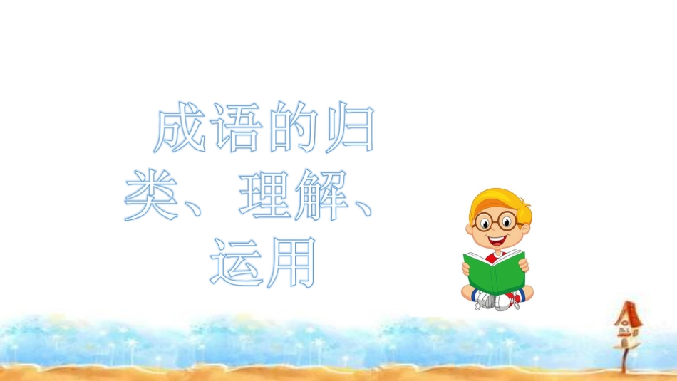 小升初语文总复习专题四·成语《语文新课程标准》具体要求:1.能够借助词典,理解词语意思。2.能联系上下文和自己的积累,推想课文有关词句的意思。3.辨别词语的感情色彩,体会其表达效果。❃专题解说1.在成语后的括号里注明成语的来源。2.请将句子中的俗语换成一个意思相近的四字词语。3.下列句子中加点的成语使用不正确的一项是()4.把成语补充完整,按要求填空。5.根据语境,选择恰当的成语填空。❃常考题型一、成语的归类1.按照出处归类来自寓言故事:守株待兔、拔苗助长等;来自神话故事:精卫填海、夸父逐日等;来自历史故事:四面楚歌、负荆请罪等;来自古文或古诗词:舍生取义、学而不厌等;来自民间俗语:三长两短、千方百计等。成语的归类2.按照数字归类三字成语:忘年交、敲竹杠等;四字成语:目瞪口呆、口若悬河等;五字成语、六字等等。成语的归类3.按照用法归类描写外貌的成语:眉目清秀、仪表堂堂等;描写语言的成语:理直气壮、绘声绘色等;描写动作的成语、景色的、建筑物等。成语的归类4.按修辞手法归类含有比喻手法的成语:光阴似箭、呆若木鸡等;含有拟人的成语:莺歌燕舞、百花争艳等;还有夸张、借代的修辞手法的成语等。二、成语的运用1.成语的意思不能只从表面理解,要透彻理解成语的意义;2.注意成语的规范性,不能随便换字、增减字。要弄清楚成语的感情色彩,不能乱用;3.注意书写和读音要正确。1.看成语的含义与前后文的修饰限制成分是否协调。❃成语运用题答题技巧2.看成语的意思与所处语境是否吻合,是否大词小用或小词大用。❃成语运用题答题技巧3.看成语的褒贬感情色彩是否适合所处语境。❃成语运用题答题技巧4.看成语适用的对象、范围和场合是否造成张冠李戴。❃成语运用题答题技巧5.看成语运用是否因望文生义而误用。❃成语运用题答题技巧6.看成语是否因画蛇添足而造成前后内容重复。❃成语运用题答题技巧成语的来源主要有:A、寓言故事B、神话传说C、古文或古诗文D、历史故事E、民间俗语❃例题一狐假虎威()唇亡齿寒()拐弯抹角()完璧归赵()满园春色()精卫填海()ADEDCB完成此题,在于平时的积累,对日常生活中见过的成语不仅要弄懂意思,还要了解成语的来源。❃答题技巧1.人家又没有明确说是你,你去解释,不是此地无银三百两吗?2.他的结局,对于那种这山望着那山高的人,也是一个极好的警告。3.再不动动脑筋,这样干下去,肯定是井里打水往河里倒。❃例题二请将下列句子中画线的俗语换成一个意思相近的四字词语。欲盖弥彰见异思迁徒劳无功此题是对成语理解的考查,比直接理解成语难度更大。完成此题,要认真理解提供的语境和画线语句的意思,结合自己平时对成语的积累,逐一替换。❃答题技巧A、同样办一件事,有的人认真负责,有的人敷衍塞责,效果迥然不同。B、在地摊上买东西要特别小心,鱼目混珠的东西很多。C、登上宝石山,居高临下,美丽的西湖尽收眼底。D、必须脚踏实地地打好基础,好高骛远地追求心中的目标,这样才能成其事。❃例题三下列句子中加粗的成语使用不正确的一项是()D我们要先理解成语的意思,再联系具体语境和生活实际来加以比较。❃答题技巧1.风()雨顺2.()头丧气3.口若()河4.眼花()乱5.阴谋()计6.鸦()无声7.惊涛()浪8.夸夸()谈(1)第()个成语可以用来形容口才很好,善于辩论。(2)“洋洋得意”跟()个成语意思相反。❃例题四先把成语补充完整,再按要求填空。调垂悬缭诡雀骇其32卧薪尝胆守株待兔精卫填海锲而不舍悬梁刺股风华正茂坚持不懈执着的故事不老----愚公移山、夸父逐日、_________;执著的人物不朽-----闻鸡起舞的祖逖、_________的勾践;执著是_________,是_________,是一支永不休止的进行曲。❃例题五根据语境,选择恰当的成语填空。精卫填海卧薪尝胆坚持不懈锲而不舍下面成语中,所含修辞手法完全相同的一组是()❃练习一A、口若悬河归心似箭像模像样铁证如山B、兔死狐悲车水马龙闭月羞花汗马功劳C、门庭若市草木皆兵巧舌如簧光阴似箭CA.在奥运会乒乓球比赛中,中国军队不负众望,包揽了所有项目的金牌。B.这次考试,大家的成绩都很好,不及格的只是凤毛麟角。C.由于夏季...