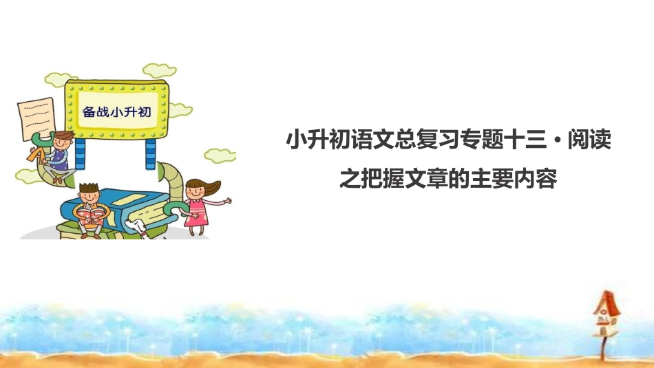 小升初语文总复习专题十三·阅读之把握文章的主要内容把握文章主要内容,是读懂一篇文章的最基本要求。《语文课程标准》指出,使学生“能初步把握文章的主要内容,体会文章表达的思想感情。”❃专题解说1、这篇文章主要写了什么?2、请概括本文主要内容。3、请概括文章大意。4、简单概括本文写了什么故事。❃常考题型概括文章主要内容的原则:1、内容完整。2、语言简洁:用最少的文字表达最多的意思。3、在概括写人记事的文章中,弄清“主人公或主要人物是谁”十分必要。有些文章的题目就是主要内容的高度概括,我们只要把文章标题稍加扩充,就是文章的主要内容了。方法一:题目扩展法如《草船借箭》,把课题四个字扩展成一句话:诸葛亮利用草船向曹操“借”来了十万支箭。其次补上借箭的起因,及周瑜最后的态度,然后稍加整理就能概括出课文的主要内容:周瑜妒忌诸葛亮,要求他十天之内赶造十万支箭。诸葛亮利用草船向曹操“借”来了十万支箭。周瑜自叹不如。1、一般来说,以人名、地名、物名、中心事件命名的文章选择“标题扩充法”归纳主要内容比较适宜。2、要紧扣文题提出相关问题。❃温馨提示:一篇文章由几个段落组成,我们可以用合并段落大意的方法概括文章主要内容。方法二:段意合并法文章分部分给---段意归纳---合段并意《人穷》第一部分:(1—2自然段)夫的妻子桑娜在海呼的深夜,渔风啸焦急地等待丈夫捕。鱼归来第二部分:(3—11自然段)桑娜居西蒙已死,便把可怜的发现邻两个孤抱回了家,但心中忐不安。儿忑第三部分:(12—27自然段)夫出海,听西蒙死了,主提渔归来说动出把孩子抱回,夫妻的想法不而合。两个来抚养俩谋主要容内:夫的妻子桑娜在海呼的深夜,焦急地等待丈渔风啸夫捕。居西蒙已死,便把可怜的孤抱回鱼归来当发现邻两个儿了家,但心中忐不安。夫出海,听西蒙死了,主忑渔归来说动提出把孩子抱回,夫妻的想法不而合。两个来抚养俩谋凡是写人、记事类的记叙文,都有具体的时间、地点、人物、事件(包括起因、经过、结果)等基本要素。阅读文章时,只要弄清这几个要素,就不难将文章的主要内容串联出来了。方法三:要素串联法《火柴的小女孩卖》:时间地点:人物:事件:大年夜街头火柴的小女孩卖小女孩冻死在街头要素串联法主要内容:文章主要写了卖火柴的小女孩在大年夜冻死街头的事。有些文章结构上的总起句、过渡句、总结句或内容上的中心句,就是文章的主要内容。阅读时直接引用或稍加整理,便可抓住主要内容。方法四:句子摘录法如老舍笔下的《猫》,既写了大猫,又写了满月的小猫。我们在概括课文大意时,必须把文中两个中心句串联起来:猫的性格很古怪,而满月的小猫更可爱。还有的时候,中心句表达比较烦琐,我们还需要“缩”,精简一些修饰性的词语,使课文大意表达得更精炼。对叙事复杂的文章,先分清事件的主次,再根据事件主要部分概括文章内容。方法五:取主舍次法•步骤一:通览全文,确定中心。•步骤二:认真分析文章,从词、句、段、写作特点等多方面找出文章的主要信息,然后选用合适的方法进行概括。•步骤三:检查是否抓住了主要内容。•步骤四:读一读句子是否通顺。(1)记人的课文。阅读这类课文要抓住:课文写的谁?在什么地方?做了什么事?然后概括主要内容。如《桥》一文的主要内容是一位普通的老共产党员,面对狂奔而来的洪水,他以自己的威信和沉稳、高风亮节、果决的指挥,挽救了全村人的性命,而他和自己的儿子却被洪水吞没了,塑造了一个英勇无私的共产党员形象。(2)叙事的课文。阅读这类课文要抓住事情发生的时间、地点、人物和事情的起因、经过、结果。如《金色的鱼钩》一文的主要内容是在红军长征途中,一位炊事班长牢记部队指导员的嘱托,尽心尽力地照顾三个生病的小战士过草地,最后献出了自己的生命。(3)写景的课文。阅读这类课文要抓住:写的是什么景物?它有什么特点?按什么顺序写的?然后再进行概括。如《草原》一文的主要内容是:作者按事情发展的顺序,描绘了内蒙古草原美丽的自然风光和浓郁的风俗民情,表达了蒙汉民族间的深厚情谊。(4)状物的课文。阅读这类课文要抓住:写的是什么事物?从几个方...