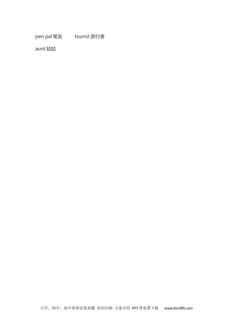 小学、初中、高中各种试卷真题知识归纳文案合同PPT等免费下载www.doc985.com小学生必备英语词汇之交通工具及人物篇交通工具英语单词boat船lorry重型卡车truck卡车bus大客车coach大客车van厢式货车taxi出租车subway地铁railway铁路train火车express列车boat小船ship船yacht游船plane飞机ambulance救护车bike、bicycle自行车motorcycle摩托车cart二轮马车[来源:学科网ZXXK]car汽车jeep吉普车tractor拖拉机helicopter直升机[来源:学.科.网Z.X.X.K]人物称呼英语单词friend朋友boy男孩girl女孩child孩子baby婴儿kid小孩daughter女儿classmate同学mother母亲father父亲sister姐妹brother兄弟uncle叔叔/舅舅son儿子man男人woman女人[来源:学科网]Mr.先生Miss小姐[来源:学+科+网]lady女士/小姐mom妈妈dad爸爸parents父母grandparents祖父母[来源:Zxxk.Com]grandma/grandmother(外)祖母grandpa/grandfather(外)祖父cousin堂(表)兄弟/堂(表)姐妹queen女王visitor参观者neighbour邻居principal校长universitystudent大学生小学、初中、高中各种试卷真题知识归纳文案合同PPT等免费下载www.doc985.compenpal笔友tourist旅行者aunt姑姑小学、初中、高中各种试卷真题知识归纳文案合同PPT等免费下载www.doc985.com