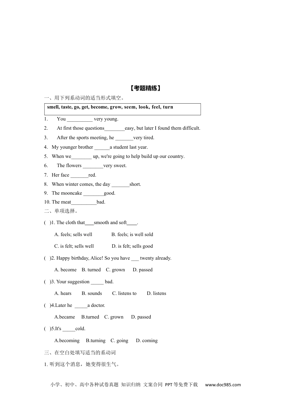 小学、初中、高中各种试卷真题知识归纳文案合同PPT等免费下载www.doc985.com小升初语法第16讲:动词(一)知识点讲解与考题精练(有答案)【考点解读】动词在英语的词类中非常重要,在接下来的学习中,同学们将会了解它的分类并掌握其用法。我们本次将从动词的分类、不同时态句型中的变化形式等方面进行纵向对比学习。学生要特别背诵一些不规则动词的变化形式以及谓语动词和非谓语动词的区别。【知识点1】动词分类定义:动词表示人或事物的动作或状态。宾语及物动词+双宾语实义动词复合宾语不及物动词系动词:be,seem,turn,become等+表语be+doing动词的种类done助动词:havedonebeendoingdo(does,did)will,shall,should,would情态动词:may,can,must,might,could【知识点2】系动词系动词本身没有词义,但不能单独作谓语,必须和其后面的表语一起构成谓语,说明主语的性质、特征、状态或者身份。系动词后一般接形容词作表语。常见系动词有:1.状态类系动词:be动词(1)be动词一般现在时的形式am,is,are,过去形式单数用was,复数用were。这几个词都意为“是”,在句子中充当谓语。(2)在一般现在时态中,be动词am,is,are的运用有所区别。根据主语人称的变化而作出相应的变化。我们可以运用简单的口诀记忆。✮be动词与人称代词使用口诀:我用am,你用are,is跟着他她它;单数用is,复数全用are.2.持续系动词:keep(保持)、rest(保持),remain(保持不变),stay(保持某种状态),stand(处于某种状态)常用搭配:keepquiet保持安静;stayhealthy保持健康例:Hekeepssilentatthemeeting.小学、初中、高中各种试卷真题知识归纳文案合同PPT等免费下载www.doc985.comPleasestayquite.3.感官系动词:look,sound(听起来),smell,taste(尝起来),feel等。常用搭配:lookbeautiful看起来漂亮;smellgood闻起来很棒例:Thisflowersmellsnice.Thefoodtastesgood.4.表象系动词:seem(似乎是),appear(似乎、显得),look(看起来)等。常用搭配:seemdifferent似乎好像不同例:Helookstired.Heseemstobeverysad.5.变化系动词:become(变得),go(趋于),grow(渐渐变得),get(变得),turn(变得),fall(进入某种状态),come(达到某种状态),run(进展)。go+不好的东西常用搭配:gobad变质turn+颜色例:Theleavesturnyellowinautumn.叶子秋天变黄了。Ifallasleepveryeasily.It’sgettingwarmnow.✮注意:系动词用来连接主语和表语,连系动词后面常为形容词【拓展】become、get、go、grow、turn的用法区别:become强调的是一种状态到另一种状态的变化,情况的变化,身份的变化;如:Ibecameateacher.(我成了老师)get强调的是渐变,如天气变长短(时间)、变冷变热(温度)可接形容词比较级;如:Hehasgotrich.(他变富了)Theweathergetshotterandhotter.(天气变得越来越热)go表示“变得”,常表示往坏的方向变化,后常有形容词bad、blind、mad、deaf等;如:Thesandwichwentbad.(那块三明治变质了)grow表示“变得”,常指身体的变化,表示身高、岁数的增长;如:Thatboygrowsup.(那个男孩长大了)turn表示“变得”,指变为与原先不同的情况,通常指颜色等变化;如:Theleavesturnyellow.(树叶变黄)Herfaceturnedredafterhermothercriticized(批评)her.小学、初中、高中各种试卷真题知识归纳文案合同PPT等免费下载www.doc985.com【考题精练】一、用下列系动词的适当形式填空。smell,taste,go,get,become,grow,seem,look,feel,turn1.You__________veryyoung.2.Atfirstthosequestions________easy,butlaterIfoundthemdifficult.3.Afterthesportsmeeting,he_______verytired.4.Myyoungerbrother______astudentlastyear.5.Whenwe________up,we'regoingtohelpbuildupourcountry.6.Theflowers________verysweet.7.Herface_______red.8.Whenwintercomes,theday_______short.9.Themooncake________good.10.Themeat__________bad.二、单项选择。()1.Thecloththatsmoothandsoft.A.feels;sellswellB.feels;iswellsoldC.isfelt;sellswellD.isfelt;sellsgood()2.Happybirthday,Alic...