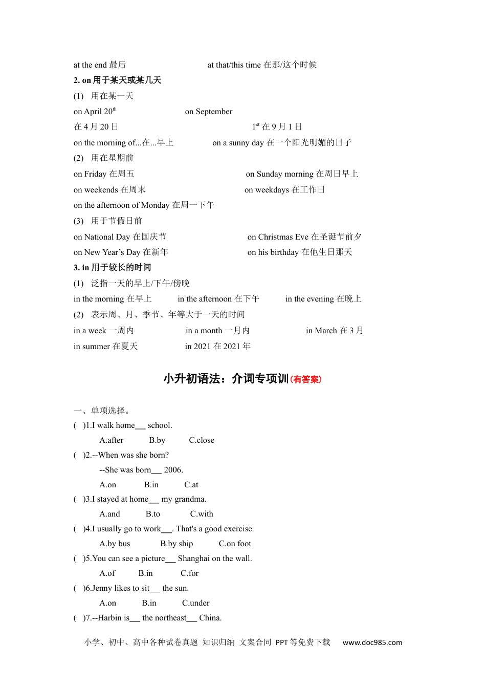 小学、初中、高中各种试卷真题知识归纳文案合同PPT等免费下载www.doc985.com小升初语法第12讲:介词(一)知识点讲解与考题精练(有答案)介词是一种用来表示词与词、词与句之间的关系的虚词,在句子中不能单独作成分。介词后面一般有名词代词或相当于名词的其他词类,短语或从句作它的宾语。介词和它的宾语构成介词词组,在句中作状语、表语、补语或介词宾语。介词可以分为时间介词、地点介词、方式介词、原因介词和其他介词。介词是英语中最活跃的词类之一,特别是一些常用介词的搭配力特别强,可以用来表示各种不同的意思。【知识点1】介词的分类常用介词按词义分为时间介词、地点介词、方位介词、方式介词、原因介词等。介词类别表示地点(包括动向)about,above,across,after,along,among,around,at,before,behind,below,beneath,beside,between,beyond,by,down,from,in,into,near,off,on,over,through,to,towards,under,up,upon,with,without,within表示时间at,in,on,by,after,before,since,for,during,within,throughout,over,until/till,between表示原因becauseof,owingto,dueto,for,with表示方式、方法或手段by,in,with表示“除...外”except,besides,but,exceptfor表示“数量”about,around,over表示“关于”的on,about表示“所属”“部分与整体关系”of本章主要学习以下三部分内容:时间介词、地点介词,其他常用介词。【知识点2】时间介词本课我们重点学习at,on,in这三个易混淆的时间介词。1.at用于具体的、很短的时间(1)用于具体的钟点前at9:00在九点钟at4:30在四点半atseveno’clock在七点钟(2)用于很短的时间前atnoon在中午atmidnight在半夜atnight在夜间(3)用于三餐前atbreakfast在早餐时atlunch在午餐时(4)用于某些固定搭配中atthemoment此刻atthebeginning开始小学、初中、高中各种试卷真题知识归纳文案合同PPT等免费下载www.doc985.comattheend最后atthat/thistime在那/这个时候2.on用于某天或某几天(1)用在某一天onApril20thonSeptember在4月20日1st在9月1日onthemorningof...在...早上onasunnyday在一个阳光明媚的日子(2)用在星期前onFriday在周五onSundaymorning在周日早上onweekends在周末onweekdays在工作日ontheafternoonofMonday在周一下午(3)用于节假日前onNationalDay在国庆节onChristmasEve在圣诞节前夕onNewYear’sDay在新年onhisbirthday在他生日那天3.in用于较长的时间(1)泛指一天的早上/下午/傍晚inthemorning在早上intheafternoon在下午intheevening在晚上(2)表示周、月、季节、年等大于一天的时间inaweek一周内inamonth一月内inMarch在3月insummer在夏天in2021在2021年小升初语法:介词专项训(有答案)一、单项选择。()1.Iwalkhomeschool.A.afterB.byC.close()2.--Whenwassheborn?--Shewasborn2006.A.onB.inC.at()3.Istayedathomemygrandma.A.andB.toC.with()4.Iusuallygotowork.That'sagoodexercise.A.bybusB.byshipC.onfoot()5.YoucanseeapictureShanghaionthewall.A.ofB.inC.for()6.Jennylikestositthesun.A.onB.inC.under()7.--HarbinisthenortheastChina.小学、初中、高中各种试卷真题知识归纳文案合同PPT等免费下载www.doc985.com--Thetemperaturethereisverylowinwinter.A.in;inB.in;ofC.on;of()8.MayIspeakColin?A.atB.toC.for()9.Let'smakesomecakesmygrandpa.A.fromB.forC.give()10.Sanyaisfamousitssandybeaches.A.ofB.forC.to()11.Aliceissittinginfrontofme.Lucyissittingbehindme.SoI'mthem.A.underB.besideC.between()12.Theyoftengetupsixinthemorning.A.onB.atC.in()13.Iwenttozoobus.A.byB./C.on()14.Therearesomephotosmyfamily.A.fromB.forC.of()15.Weshouldsleepwellnight.A.atB.inC.on()16.Children'sDayisJune1st.A.onB.ofC.at()17.Wearriveschoolat8:30.A.inB.forC.at()18.Thispictureapandaisforyou.A.ofB.forC.to()19.I'mreadingsomebooksflowers.A.onB.forC.about()20.Don'tworrymystudy,Mom.Idowellatschool.A.aboutB.forC.of()21.Thehouseistheschoolandthebank.It'seasytofindit.A.underB.betweenC.next()22.Weoftenwashthedishesdinner.A.afterB.atC.on()23.WuPenghadaracehisfatherandMax.A.withB.forC.and()24.Pleaseputthiscap.A.buyB.onC.at()25.Someanimalssleepalongtimeinwinter.A.fourB.forC.andD.from小学、初中、高中各种试卷真题知识归纳文案合同PPT等免费下载www.doc985.com参考答案1.A2.B3.C4.C5.A6.B【解析】inthesun在阳光下7.B【解析】thenortheastofChina在中国的东北部8.B9.B10.B11.C12.B13.A14.C15.A16.A17.C18.A19.C20.A21.B22.A23.A24B25.B小学、初中、高中各种试卷真题知识归纳文案合同PPT等免费下载www.doc985.com