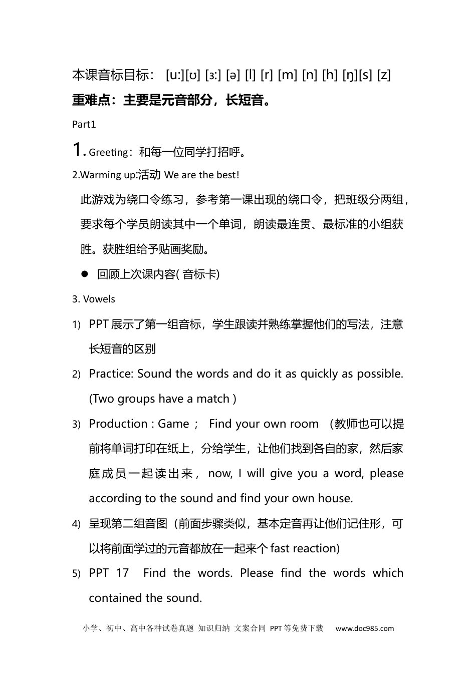 小学、初中、高中各种试卷真题知识归纳文案合同PPT等免费下载www.doc985.com本课音标目标:[u:][][:][][l][r][m][n][h][ŋ][s][z]ʊɜə重难点:主要是元音部分,长短音。Part11.Greeting:和每一位同学打招呼。2.Warmingup:活动Wearethebest!此游戏为绕口令练习,参考第一课出现的绕口令,把班级分两组,要求每个学员朗读其中一个单词,朗读最连贯、最标准的小组获胜。获胜组给予贴画奖励。回顾上次课内容(音标卡)3.Vowels1)PPT展示了第一组音标,学生跟读并熟练掌握他们的写法,注意长短音的区别2)Practice:Soundthewordsanddoitasquicklyaspossible.(Twogroupshaveamatch)3)Production:Game;Findyourownroom(教师也可以提前将单词打印在纸上,分给学生,让他们找到各自的家,然后家庭成员一起读出来,now,Iwillgiveyouaword,pleaseaccordingtothesoundandfindyourownhouse.4)呈现第二组音图(前面步骤类似,基本定音再让他们记住形,可以将前面学过的元音都放在一起来个fastreaction)5)PPT17Findthewords.Pleasefindthewordswhichcontainedthesound.小学、初中、高中各种试卷真题知识归纳文案合同PPT等免费下载www.doc985.com6)PPT18BINGOGAME.(教师给学生每人一张空白的9空格图片,学生随便在里面写9个单词或者音标,写完后教师开始读,看谁第一个三个单词或音标在一条线上,给哪一组加分,可以多玩几组)4.Consonant1)8个辅音分成3个小组。步骤参照上面的(同时参考PPT上面的练习以及互动,注意鼻音的发音和m,n的区别。(穿插一个互动在三个音标输入好后,Now,Iwillinvitetwostudents,andthenIwillsoundtheconsonant,pleasepickthecardquickly,Ok?主要是为了辨析第一组音)2)P31页:Makesomewords(老师可以适当增加几个音标,自己先提前相处一些单词)4.Revision1)Flashcard.2)GiveSsthecard.Tsayaword.Ssmakethewords(根据学生手上的卡片,老师读一个单词,请同学们按照顺序站上来,下面的同学再次拼读)小学、初中、高中各种试卷真题知识归纳文案合同PPT等免费下载www.doc985.com