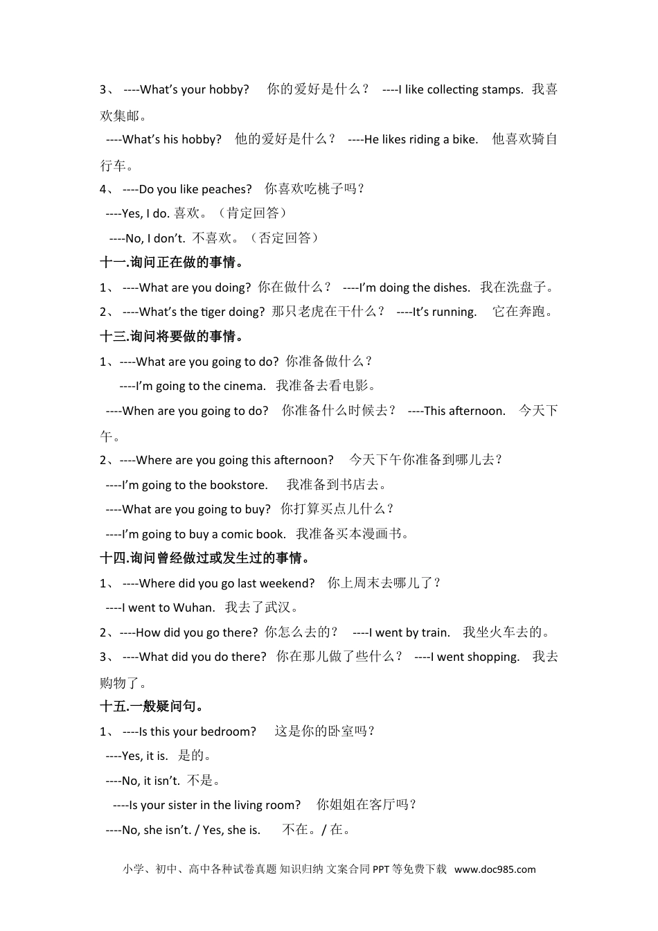 小学英语句子归类一.询问姓名、年龄。1、----What’syourname?你叫什么名字?----Mynameis…….我叫……。2、----Howoldareyou?你几岁了?----I’m12.我十二岁。二.询问颜色。1、----Whatcolourisit?它是什么颜色的?----It’syellowandwhite.黄白相间。2、----Whatcolourarethey?它们是什么颜色的?----They’regreen.绿色的。三.询问数量或价钱。1、----Howmanypeoplearethereinyourfamily?你家有几口人?----Three.三口人。2、----Howmucharetheseapples?这些苹果多少钱?----They’rethirty-fiveyuan.三十五元。四.询问时间或日期。1、----Whattimeisitnow?现在几点钟?----It’snineo’clock.It’stimeforEnglishclass.九点。该上英语课了。2、----Whatdayisittoday?今天星期几?----It’sMonday.星期一。3、----Whenisyourbirthday?你的生日是什么时候?----It’sOctober1st.十月一日,国庆节。4、----Whendoyoudomorningexercises?你们什么时候做早锻炼?----Iusuallydomorningexercisesat8:30.我们通常8:30做早锻炼。五.询问方位或地方。1、----Whereismytoycar?我的玩具汽车在哪儿?----It’shere,underthechair.在这儿,在椅子下面。2、----Whereisthecanteen?餐厅在哪儿?----It’sonthefirstfloor.在一楼。3、----Wherearethekeys?钥匙在哪儿?----They’reinthedoor.在门上。4、----Excuseme.Whereisthelibrary,please?对不起,请问图书馆在哪儿?----It’snearthepostoffice.在邮局附近。5、----Whereareyoufrom?你从哪儿来?----I’mfromChina.我从中国来。6、----Wheredoestheraincomefrom?雨是从哪儿来的?----Itcomesfromtheclouds.它是从云层里来的。小学、初中、高中各种试卷真题知识归纳文案合同PPT等免费下载www.doc985.com六.询问想吃的东西。1、----Whatwouldyoulikeforbreakfast?----你早餐想吃点什么?----I’dlikesomebreadandmilk.----我想吃面包和牛奶。2、----What’sforbreakfast?早餐吃什么?----Hamburgersandorangejuice.汉堡包和橙汁。七.询问天气状况。1、----What’stheweatherlikeinBeijing?北京的天气如何?----It’ssunnyandhot.今天是晴天,天气很热。八.询问身体状况或情绪。1、----Howdoyoufeel?你感觉如何?----Ifeelsick.我觉得不舒服。2、----What’sthematter?怎么了?----Ihaveasorethroat.我的喉咙疼。3、----Howareyou,Sarah?Youlooksosad.你好吗,莎拉?你看起来这么伤心。----Ifailedthemathtest.我的数学考试没有通过。九.询问职业、身份或人物。1、----What’syourfather?你的父亲是做什么的?----He’sadoctor.他是一名医生。2、----Whatdoesyoumotherdo?你的母亲是做什么的?----She’saTVreporter.她是一名电视台记者。3、----Who’sthatman?那位男士是谁?----He’smyfather.他是我父亲。4、----Who’sthisboy?那个男孩是谁?----He’smybrother.他是我兄弟。5、----Who’syourartteacher?你们的美术老师是谁?----MissWang.王老师。----What’sshelike?她长什么样儿?----She’syoungandthin.她很年轻、苗条。十.询问兴趣、喜好。1、----What’syourfavouritefood?你最喜欢的食物是什么?----Fish.鱼。2、----What’syourfavouriteseason?你最喜欢的季节是什么?----Winter.冬天。----Whichseasondoyoulikebest?你最喜欢哪个季节?----Winter.冬天。----Whydoyoulikewinter?你为什么喜欢冬天?----BecauseIcanmakeasnowman.因为可以堆雪人。小学、初中、高中各种试卷真题知识归纳文案合同PPT等免费下载www.doc985.com3、----What’syourhobby?你的爱好是什么?----Ilikecollectingstamps.我喜欢集邮。----What’shishobby?他的爱好是什么?----Helikesridingabike.他喜欢骑自行车。4、----Doyoulikepeaches?你喜欢吃桃子吗?----Yes,Ido.喜欢。(肯定回答)----No,Idon’t.不喜欢。(否定回答)十一.询问正在做的事情。1、----Whatareyoudoing?你在做什么?----I’mdoingthedishes.我在洗盘子。2、----What’sthetigerdoing?那只老虎在干什么?----It’srunning.它在奔跑。十三.询问将要做的事情。1、----W...