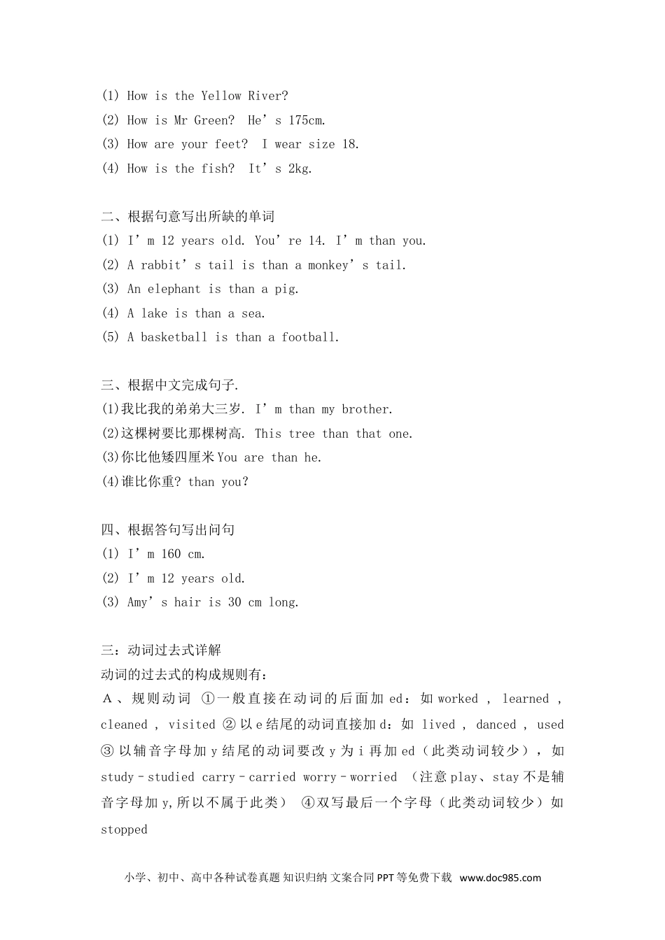 小考知识点汇总一:学生易错词汇1.a,an的选择:元音字母开头的单词用an,辅音字母开头的单词用a.2.am,is,are的选择:单数用is,复数用are.I用am,you用are.3.have,has的选择:表示某人有某物。单数用has,复数用have.I,you用have.4.thereis,thereare的选择:表示某地有某物,某人。单数用thereis,复数用thereare.5.some,any的选择:肯定句用some,疑问句和否定句用any.6.疑问词的选择:what(什么)who(谁)where(哪里)whose(谁的)why(为什么)when(什么时候)which(哪一个)howold(多大)howmany(多少)howmuch(多少钱)二:形容词比较级详解当我们需要对事物作出比较时,需要用到比较级。比较级的句子结构通常是:什么+动词be(am,is,are)+形容词比较级+than(比)+什么,如:I’mtallerandheavierthanyou.(我比你更高和更重。)Anelephantisbiggerthanatiger.(一只大象比一只老虎更大。)形容词的比较级是在形容词的基础上变化而来的,它的变化规则是:①一般的直接在词尾加er,如tall-taller,strong-stronger,②以e结尾的,直接加r,如fine–finer,③以辅音字母加y结尾的,先改y为i再加er,如funny–funnier④双写最后的字母再加er,如big–bigger,thin–thinner,hot–hotter☆注意比较的两者应该是互相对应的可比较的东西。典型错误:Myhairislongerthanyou.(我的头发比你更长。)比较的两者是我的头发、你(整个人),那么比较的对象就没有可比性。应该改为:Myhairislongerthanyours.或Myhairislongerthanyourhair.比较级专项练习:一、从方框中选出合适的单词完成句子Heavytalllongbig小学、初中、高中各种试卷真题知识归纳文案合同PPT等免费下载www.doc985.com(1)HowistheYellowRiver?(2)HowisMrGreen?He’s175cm.(3)Howareyourfeet?Iwearsize18.(4)Howisthefish?It’s2kg.二、根据句意写出所缺的单词(1)I’m12yearsold.You’re14.I’mthanyou.(2)Arabbit’stailisthanamonkey’stail.(3)Anelephantisthanapig.(4)Alakeisthanasea.(5)Abasketballisthanafootball.三、根据中文完成句子.(1)我比我的弟弟大三岁.I’mthanmybrother.(2)这棵树要比那棵树高.Thistreethanthatone.(3)你比他矮四厘米Youarethanhe.(4)谁比你重?thanyou?四、根据答句写出问句(1)I’m160cm.(2)I’m12yearsold.(3)Amy’shairis30cmlong.三:动词过去式详解动词的过去式的构成规则有:A、规则动词①一般直接在动词的后面加ed:如worked,learned,cleaned,visited②以e结尾的动词直接加d:如lived,danced,used③以辅音字母加y结尾的动词要改y为i再加ed(此类动词较少),如study–studiedcarry–carriedworry–worried(注意play、stay不是辅音字母加y,所以不属于此类)④双写最后一个字母(此类动词较少)如stopped小学、初中、高中各种试卷真题知识归纳文案合同PPT等免费下载www.doc985.comB、不规则动词(此类词并无规则,须熟记)小学阶段要记住以下动词的原形和过去式:sing–sang,eat–ate,see–saw,have–had,do–did,go–went,take–took,buy–bought,get–got,read–read,fly–flew,am/is–was,are–were,say–said,leave–left,swim–swam,tell–told,draw–drew,come–came,lose–lost,find–found,drink–drank,hurt–hurt,feel–felt四:动词现在分词详解动词的-ing形式的构成规则:①一般的直接在后面加上-ing,如doing,going,working,singing,eating②以e结尾的动词,要先去e再加-ing,如having,writing③双写最后一个字母的(此类动词极少)有:running,swimming,sitting,getting五:人称和数人称代词物主代词主格宾格第一人称单数I(我)memy(我的)复数we(我们)usour(我们的)第二人称单数you(你)youyour(你的)复数you(你们)youyour(你们的)第三人称单数he(他)himhis(他的)she(她)herher(她的)it(它)itits(它的)复数they(他们/她们/它们)themtheir(他们的/她们的/它们的)六:句型专项归类1、肯定句:是指用肯定的语气来陈述的句子,如:I’mastudent.Sheisadoctor.Heworksinahospital.Therearefourfansinourclassroom.Hewilleatlunchat12:00.IwatchedTVyesterday...
