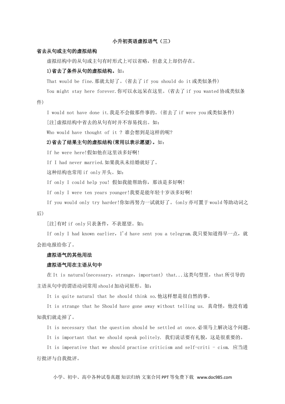 小升初英语虚拟语气(三)省去从句或主句的虚拟结构虚拟结构中的从句或主句有时形式上可以省略,但意义上却仍存在。1)省去了条件从句的虚拟结构。如:Thatwouldbefine.那就太好了。(省去了ifyoushoulddoit或类似条件)Youmightstayhereforever.你可以永远呆在这里。(省去了ifyouwanted协或类似条件)Iwouldnothavedoneit.我是不会做那件事的。(省去了ifwereyou或类似条件)[注]虚拟结构中省去的从句有时并不容易找出。如:Whowouldhavethoughtofit?谁会想到是这样的呢?2)省去了结果主句的虚拟结构(常用以表示愿望)。如:Ifhewerehere!假如他在这里该多好啊!IfIhadnevermarried.如果我从未结婚就好了。这种结构也常用ifonly开头。如:IfonlyIcouldhelpyou!假如我能帮助你,那该是多好啊!IfonlyIweretenyearsyounger!我要是能年轻十岁该多好啊!Ifyouwouldonlytryharder!你如再努力一试就好了。(only亦可置于would等助动词之后)[注]有时ifonly只表条件,不表愿望。如:IfonlyIhadknownearlier,I'dhavesentyouatelegram.我只要知道得早一点,就会拍电报给你了。虚拟语气的其他用法虚拟语气用在主语从句中在Itisnatural(necessary,strange,important)that...这类句型里,that所引导的主语从句中的谓语动词常用should加动词原形。如:Itisquitenaturalthatheshouldthinkso.他这样想是很自然的事。ItisstrangethatheShouldhavegoneawaywithouttellingus.真奇怪,他没有通知我们就走掉了。Itisnecessarythatthequestionshouldbesettledatonce.必须马上解决这个问题。Itisimportantthatweshouldspeakpolitely.我们说话要有礼貌,这是很重要的。Itisimperativethatweshouldpractisecriticismandself-criti-cism.应当进行批评与自我批评。小学、初中、高中各种试卷真题知识归纳文案合同PPT等免费下载www.doc985.com虚拟语气用在宾语从句中下列两种宾语从句须用虚拟语气:1)在动词wish后的宾语从句(常常省去连词that),表示不可实现的愿望。从句中的动词如用过去式,则表示与现在事实相反(如下面第一、二例句);如用过去完成式,则表示与过去事实相反(如下面第三、四例句)。如:IwishIwereapilot.但愿我是个飞行员。IwishIknewhowtooperatethemachine.我要是会操作这架机器该有多好啊!(=I'msorryIdon'tknow.)Iwishhehadn'tgone.他要是没走该多好!(=I'msorryhehasgone.)WewishyouhadcometoourNewYear'sparty.我们真希望你来参加我们的新年联欢会。(=butyoudidnot)动词wish如果是过去式,后面宾语从句的动词的虚拟语气形式不变,仍用过去式或过去完成式。如:Shewishedsheknewhowtoplaygolf.她但愿会打高尔夫球。(和过去事实相反)IwishedIhadn'tbeensoforgetful.ThenIshouldn'thavemissedtheconcert.我要是不这样忘事该多好,那我就不会不去听音乐会。(和过去的过去的事实相反)[注]有时在宾语从句中可用would或might加动词原形,表示有可能实现的愿望。如:.Iwishhe,mightstaywithme.我希望他和我住在一起。HewishesIwouldgowithhim.他希望我和他一起去。Iwishyouwouldbequiet.我希望你安静一些。2)动词demand(要求),suggest(建议),order(命令),insist(坚持),propose(建议)等后面的宾语从句,用should(用于所有的人称)加动词原形来表示虚拟语气。如:Isuggestthatweshouldholdameetingtonight.我建议今晚开个会。ThechairmanproposedthatweShoulddiscussthequestion.主席提议我们讨论这个问题。MoststudentsinsistthattheyshouldhavemoreEnglishclasses.多数同学坚持要多上英语课。[注]这种结构往往可不用should,尤其在美国,只用动词原形(用于所有的人称)。如上面三例只用hold,discuss和have,不用shouldhold,shoulddiscuss和shouldhave。又如:Isuggestthatwemakeanewexpertinent.我建议进行新的试验。Iproposethatthematterbeputthevoteatonce.我提议把这个问题马上付表决。小学、初中、高中各种试卷真题知识归纳文案合同PPT等免费下载www.doc985.com虚拟语气用在状语从句中由asif或asthough所引导的状浯从句表示比较或方式时,从句中的谓语动词常用虚拟语气。动词形式用动词的过去式(...