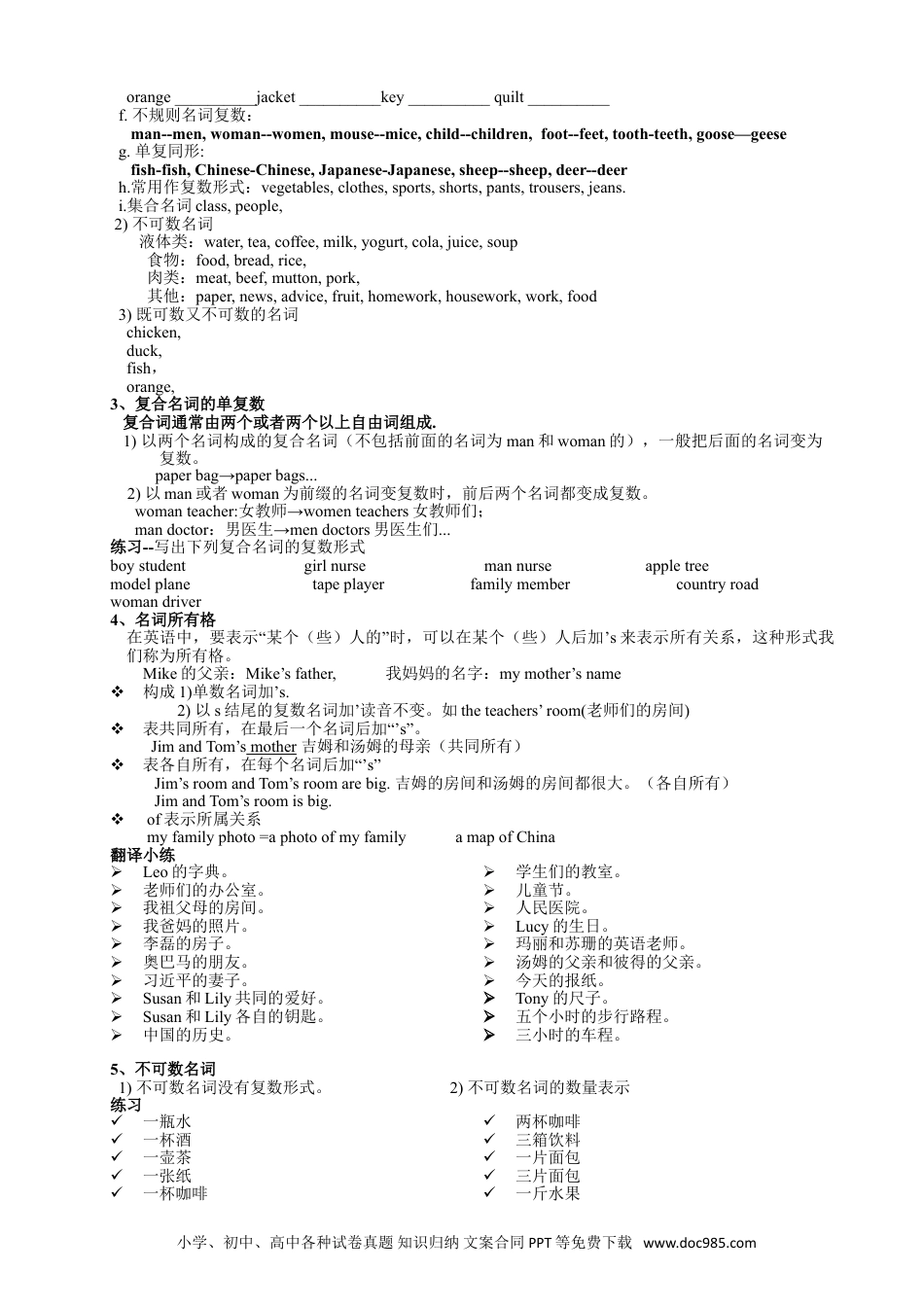 第六讲名词一、基本词汇1.mango芒果2.tomato西红柿3.potato土豆4.knife小刀5.thief小偷6.leaf树叶7.wife妻子8.shelf架子9.life生活;生命10.wolf狼11.half一半12.strawberry/'strɔ:bəri/n.草莓13.milk/milk/n.牛奶14.bread/bred/n.面包15.food/fu:d/n.食物16.vegetable/'vedʒitəbl/n.蔬菜17.fruit/fru:t/n.水果18.carrot/'kærət/n.胡萝卜19.rice/rais/n.大米;米饭20.chicken/'tʃikin/n.鸡肉21.sock/sɔk/n.短袜22.shortsn.(pl.)短裤23.sweater/'swetə/n.毛衣24.trousersn.(pl.)裤子25.shoe/ʃu:/n.鞋26.skirt/skə:t/n.裙子27.clothes/kləuðz/n.(pl.)衣服;服装28.woman/'wumən/n.女子29.man/mæn/男子30.mouse[maʊs]老鼠31.child[tʃaɪld]32.foot[fʊt]33.goose[gu:s]34.fish[fɪʃ]n.鱼,鱼肉,鱼类;35.Chinese[tʃaɪˈni:z]n.中文;汉语;华人;中国人36.Japanese[ˌdʒæpə'ni:z]n.日语;日本37.sheep[ʃi:p]n.羊,绵羊38.deer[dɪə(r)]n.鹿39.tooth[tu:θ]n.齿;牙40.soup[su:p]n.汤,羹;41.housework家务42.homework作业43.news新闻44.meat肉类45.beef牛肉46.mutton羊肉47.pork猪肉48.paper纸张49.advice建议50.work工作二、重点短语集锦1.eatinghabit饮食习惯2.tapeplayer录音机3.modelplane飞机模型4.halfanhour半个小时5.myfamilyphoto=aphotoofmyfamily我的家庭照片6.whatkindof什么类型7.differentkindsof不同种类的8.befriendlytosb对……友好三、知识讲解1、名词的定义表示某一事物,有具体的和抽象的之分。分为可数名词和不可数名词。2、可数名词与不可数名词1)可数名词--单数--复数a.一般情况下,直接加-s,如:book-books,bag-bags,cat-cats,bed-beds;读音:清辅音后读,浊辅音和元音后读[z]。b.以s.x.sh.ch结尾,加-es,如:bus-buses,box-boxes,brush-brushes,watch-watches;读音:[iz]。c.以“辅音字母+y”结尾,变y为i,再加-es,如:family-families,strawberry-strawberries;读音:[z]。d.以“o”结尾的词,分两种情况有生命的+es,读音:[z]mango-mangoestomato-tomatoespotato-potatoes无生命的+s,读音:[z]photo-photose.以“f或fe”结尾,变f或fe为v,再加-es,读音:[z],knife-knives,thief-thieves;半片树叶半片黄,妻子拿刀去砍狼,架下小偷逃命忙。half,leaf,wife,knife,wolf,shelf,thief,lifehalves,leaves,wives,knives,wolves,shelves,thieves,lives练习--写出下列单词的复数形式peach--____________,dress--____________monkey--____________boy--____________body--____________,baby--____________,library--____________,leaf--____________wife--____________knife--____________thief--____________shelf--____________life--____________radio--____________zoo____________family--____________school--____________photo--____________picture--____________eraser--____________box--____________dictionary--____________watch--____________computer--____________notebook--____________bag--____________classroom--____________basketball--____________hamburger--____________tomato--____________birthday--____________subject--____________lesson--____________hour--____________potato--____________zoo--____________life--____________student--____________geography--____________history--____________sister__________parent__________girl__________dog__________telephone__________number__________friend__________map__________cup__________ruler__________小学、初中、高中各种试卷真题知识归纳文案合同PPT等免费下载www.doc985.comorange__________jacket__________key__________quilt__________f.不规则名词复数:man--men,woman--women,mouse--mice,child--children,foot--feet,tooth-teeth,goose—geeseg.单复同形:fish-fish,Chinese-Chinese,Japanese-Japanese,sheep--sheep,deer--deerh.常用作复数形式:vegetables,clothes,sports,shorts,pants,trousers,jeans.i.集合名词class,p...