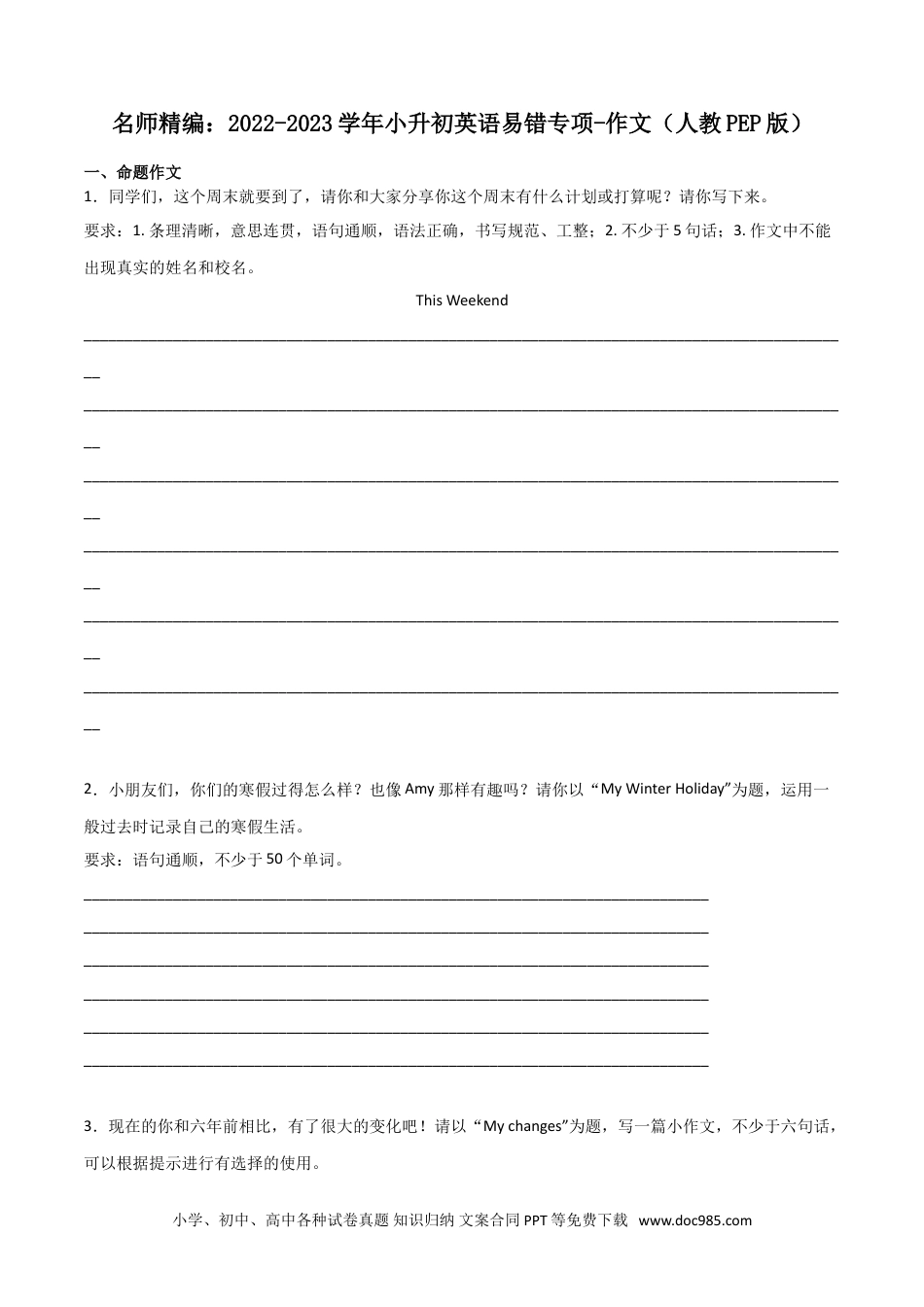 名师精编:2022-2023学年小升初英语易错专项-作文(人教PEP版)一、命题作文1.同学们,这个周末就要到了,请你和大家分享你这个周末有什么计划或打算呢?请你写下来。要求:1.条理清晰,意思连贯,语句通顺,语法正确,书写规范、工整;2.不少于5句话;3.作文中不能出现真实的姓名和校名。ThisWeekend__________________________________________________________________________________________________________________________________________________________________________________________________________________________________________________________________________________________________________________________________________________________________________________________________________________________________________________________________________________________________________________________________________________________________________________________2.小朋友们,你们的寒假过得怎么样?也像Amy那样有趣吗?请你以“MyWinterHoliday”为题,运用一般过去时记录自己的寒假生活。要求:语句通顺,不少于50个单词。______________________________________________________________________________________________________________________________________________________________________________________________________________________________________________________________________________________________________________________________________________________________________________________________________________________________________________________________________________3.现在的你和六年前相比,有了很大的变化吧!请以“Mychanges”为题,写一篇小作文,不少于六句话,可以根据提示进行有选择的使用。小学、初中、高中各种试卷真题知识归纳文案合同PPT等免费下载www.doc985.com要求:条理清晰,语言准确,意思连贯;标点正确,书写规范;不能出现自己的真实姓名和校名。Mychanges____________________________________________________________________________________________________________________________________________________________________________________________________________________________________________________________________________________________________________________________________________________________________________________________________________________________________________________________________________________________________________________________________________________________________________________________________________________________________________________________________4.请你以“MyFamily”为题,写一篇关于你的家庭成员的爱好、职业、工作地点和交通方式的短文。MyFamily___________________________________________________________________________________________________________________________________________________________________________________________________________________________________________________________________________________________________________________________________________________________________________________________________________5.请以“Mybestfriend”为题,介绍你好朋友的年龄,外貌,住在哪个城市,她/他的爱好以及周末经常干什么,不少于五句话。_______________________________________________________________________________________________________________________________________________________________________________________________________________________________________________________________________________________________________________________________________...