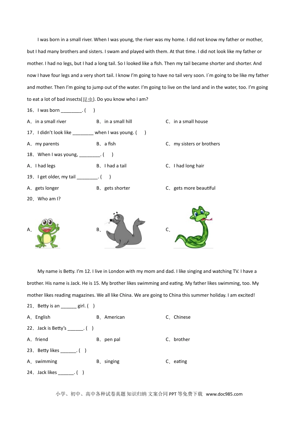 名师精编:2022-2023学年小升初英语易错专项-阅读理解(人教PEP版)一、阅读选择Anoldmanwenttoseeadoctor.Thedoctorcheckedhimandsaid,“Medicinewon’thelpyou.Youshouldhaveagoodrest.Gotobedearly,drinkmilk,walkalotanddon’tsmokeanymore.”Afteramonththemancametothedoctoragain.Thedoctorsaid,“I’mgladtoseeyouagain.Youlookyounger.”“Oh!Doctor,Ifeelwellnow,”saidtheman.“Ihadagoodrest.Iwenttobedearly,drankalotofmilkandwalkedalot.Andyoutoldmenottosmoke.Ididit.It’snoteasy(容易的)toquitsmoking(戒烟)atmyage!”1.Thedoctordidn’ttellthemanto______.()A.gotobedearlyB.drinkwaterC.haveagoodrest2.Whichisright(正确的)?()A.Thedoctortoldtheoldmantosmokealot.B.Thedoctorgavetheoldmansomemedicine.C.Afteramonth,theoldmanfeltbetter.3.Theoldmandidn’t______duringthemonth.()A.gotobedearlyB.smokeC.drinkmilk4.Didtheoldmanwalkalotbeforethatmonth?()A.Yes,hedid.B.No,hedidn’t.C.Wedon’tknow.5.Whichisthebesttitle(标题)?()A.Goodhabits(习惯)aregoodforhealth(健康).B.Medicineisnotgoodforhealth.C.Smokingisgoodforhealth.Amanlivedinalittlehouse.Healwayscookedhisownmeal.Onenighthecamehomeandfelthungry.Sohemadeabigmeal.Itwasverynice.Afterthemeal,hewasverytired.Soheleftthedishestillthenextday.Thenextdayhewasmuchhungrier.Sohemadehimselfabiggermeal.Afterthemeal,hefeltmoretired.Soheleftthedishesinthesink(洗碗池).Thereweresomanydirtydishesinthesink,onthetableandonthefloor.Itwashardforhimtogetintotheroom.Oneday,itstartedtorain.Hehadanidea.Hedrovehistrucktothesideofhishouseandputallthedishesonitanddroveitoutintotherain.Itwasraininghard.Therainfellonthedishes.Soon,theywereallclean.6.Whomadethemealfortheman?()A.Themanhimself.B.Hismother.C.Wedon’tknow.7.Howdidthemanfeelafterthemeal?()小学、初中、高中各种试卷真题知识归纳文案合同PPT等免费下载www.doc985.comA.Glad.B.Tired.C.Hungry.8.Wherewerethedirtydishes?()A.Onthefloor.B.Inthesinkandonthetable.C.BothAandB.9.Howdidthemanwashthedishesatlast?()A.Heaskedsomeonetowashthem.B.Hewashedtheminariver.C.Hewashesthem,withthefallingrain.10.WhichofthefollowingsentenceisNOTright?()A.Theman’shousewasnotbig.B.Themanwasclever.C.Themandidn’tknowhowtocook.SugarTownShoppingCentreOpenhours:9:00a.m.-6:00p.m.(Mon.-Sat)9:00a.m.-9:00p.m.(Sun.)Discount(折扣):5%forshopperswithmembershipcards(会员卡)ineveryshop☆ChildrenCentrecanlookafterchildrenforparents.Price:$10everychild(childrenover8arefree)Address:No.120,ColonyStreet,SugarTown(BetweenCici’sPizzaandSugarTownBank.)Bus:909,25,31111.SugarTownShoppingCentreisopenfor______hoursonWednesdays.()A.nineB.tenC.eleven12.WecanshopinSugarTownShoppingCentreat8:00p.m.______.()A.OnThursdaysB.OnSaturdaysC.OnSundays13.Acomputeris$500,MrBlackwantstobuyitwithamembershipcard.Howmuchdoesheneedtopay?()A.$450.B.$475.C.$495.14.MrBlacktakeshis5-year-oldsonandhis10-year-olddaughtertotheChildrenCentre.Heshouldpay.______.()A.$20B.$10C.$1615.WhichofthefollowingisNOTtrue?()A.TheCici’sPizzaisnexttoSugarTownShoppingCentre.B.SugarTownShoppingCentreisopenfor13hoursonSundays.C.PeoplecantaketheNo.25bustogettoSugarTownShoppingCentre.小学、初中、高中各种试卷真题知识归纳文案合同PPT等免费下载www.doc985.comIwasborninasmallriver.WhenIwasyoung,theriverwasmyhome.Ididnotknowmyfatherormother,butIhadmanybrothersandsisters.Iswamandplayedwiththem.Atthattime.Ididnotlooklikemyfatherormother.Ihadnolegs,butIhadalongtail.SoIlookedlikeafish.T...