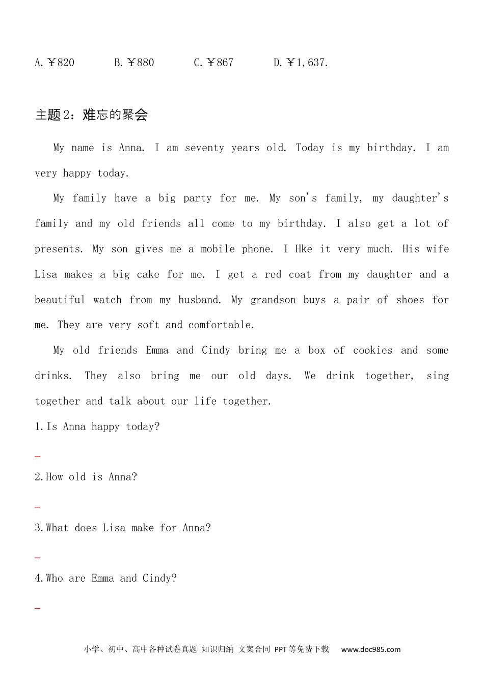 小学、初中、高中各种试卷真题知识归纳文案合同PPT等免费下载www.doc985.com小升初英语PEP版阅读理解专项训练(二十五)班级:姓名:主题1:航班信息FLIGHTINFORMATION(航班信息)DateFromToDeparture(出发)Arrival(到达)FlightNo.Price(价格)January20BeijingHongKong20:1023:35HX313¥867January20BeijingTaipei14:0517:20CA189¥2,084January20BeijingMacao11:4515:10NX002¥1,637January20BeijingSanya09:3513:45CAI803¥2,500January20BeijingXiamen07:1510:20CA1871¥880January20BeijingShenzhen06:4010:20CZ3172¥820()1.IfyoutaketheplanetoSanya,youwillarrivethereatA.10:20B.13:45C.15:10D.23:35()2.WhichflightcanyoutaketoTaipei?A.HX313B.CA1803C.CA189D.CA1871()3.What'sthepricefortheticketfromBeijingtoShenzhen?小学、初中、高中各种试卷真题知识归纳文案合同PPT等免费下载www.doc985.comA.¥820B.¥880C.¥867D.¥1,637.主题2:忘的聚难会MynameisAnna.Iamseventyyearsold.Todayismybirthday.Iamveryhappytoday.Myfamilyhaveabigpartyforme.Myson'sfamily,mydaughter'sfamilyandmyoldfriendsallcometomybirthday.Ialsogetalotofpresents.Mysongivesmeamobilephone.IHkeitverymuch.HiswifeLisamakesabigcakeforme.Igetaredcoatfrommydaughterandabeautifulwatchfrommyhusband.Mygrandsonbuysapairofshoesforme.Theyareverysoftandcomfortable.MyoldfriendsEmmaandCindybringmeaboxofcookiesandsomedrinks.Theyalsobringmeourolddays.Wedrinktogether,singtogetherandtalkaboutourlifetogether.1.IsAnnahappytoday?2.HowoldisAnna?3.WhatdoesLisamakeforAnna?4.WhoareEmmaandCindy?小学、初中、高中各种试卷真题知识归纳文案合同PPT等免费下载www.doc985.com5.Whatdotheydotogether?主题3:人信息交流个I'mKen.MylastnameisGreen.Mytelephonenumberis875-0987.Peterismycousin.Heis9.Mingmingismygoodfriend.HeisinChina.MynameisMaryBrown.Myphonenumberis824-9564.MyfriendisAlice.Sheis8.Hertelephonenumberis634-0965.IamZhangLei.IaminShanghai.Hereismycomputer(电脑).MyQQnumberis56732456.Andmyphonenumberis837-9837.()1.What'sKen'stelephonenumber?A.634-0965B.637-9837C.875-0987D.875-0967()2.Aliceisyearsold.A.9B.8C.7D.6()3.WhoisMingming?A.Peter'sfriendB.Alice'sfriendC.Ken'sfriendD.ZhangLei'sfriend.()4.What'sZhangLei'slastname?小学、初中、高中各种试卷真题知识归纳文案合同PPT等免费下载www.doc985.comA.ZhangB.LeiC.BrownD.Ken.()5.Whichofthefollowingistrueaccordingtothepassage?A.PetcrisMary'scousinB.Ken'sphonenumberis824-9564C.Mary'sfriendAlicehasacomputerD.ZhangLei'sphonenumberis837-9837.主题4:珍的生日聚妮会December17thisJenny'sfifteenthbirthday.ItisSaturday.Jenny'smotherhasabigbirthdaypartyfbrJenny.Jennyinvitesalotofherfriendstotheparty.Eachofthembringsabirthdaypresentfbrherandsayshappily,“HappyBirthday,Jenny!”,Therearefifteengirlsattheparty.Jenny'smothermakesabigbirthdaycakewithfifteencandles(虫昔烛)onit.Shealsobuysalotoffruits.Thereareapples,oranges,pearsandalotofbiscuits.Thegirlsareveryhappy,andtheyaresinginganddancing.Jennyishappy,too.Shedancesandsingsmanysongsinasweetvoice.Allofthemenjoythemselvesverymuch.小学、初中、高中各种试卷真题知识归纳文案合同PPT等免费下载www.doc985.com()1.HowoldisJenny?A.14B.15C.16D.17.()2.aredancingandsingingattheparty.A.OnlyJennyB.Jenny'sfriendsC.JennyandherfriendsD.Jenny'smothcr()3.FromthepassagewecanguessJennyisa(n)girl.A.shy'B.outgoing(外向的)'C.badD.lazy()4.Jennyandherfriendsareonthatday.A.happyB.unhappyC.cryingD.skating()5.Jenny'smothergivesthegirlstoeat.A.onlyabirthdaycakeB.abirthdaycakeandfruitsC.onlyfruitsandbiscuitsD.abirthdaycake,fruitsa...