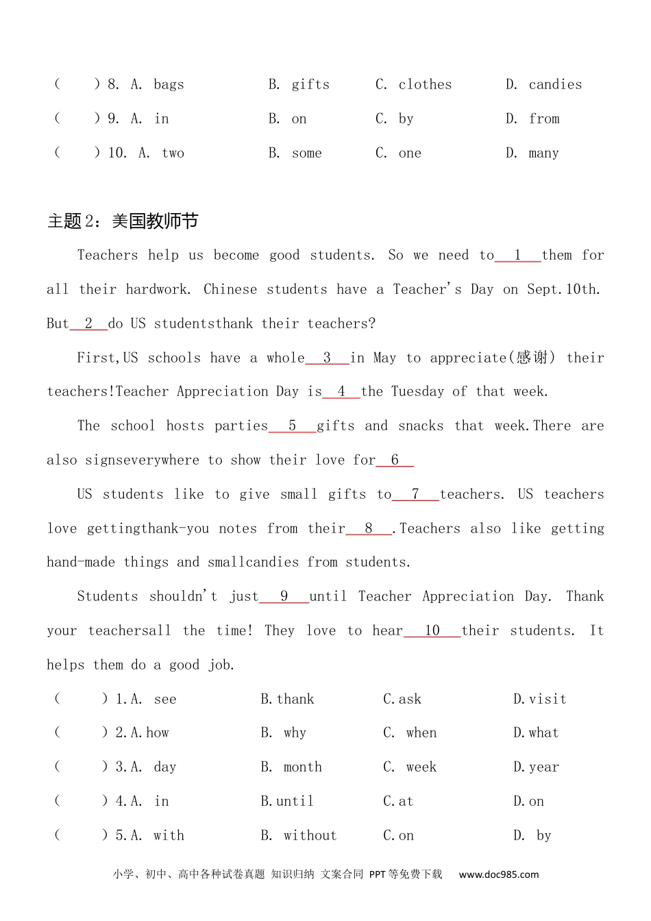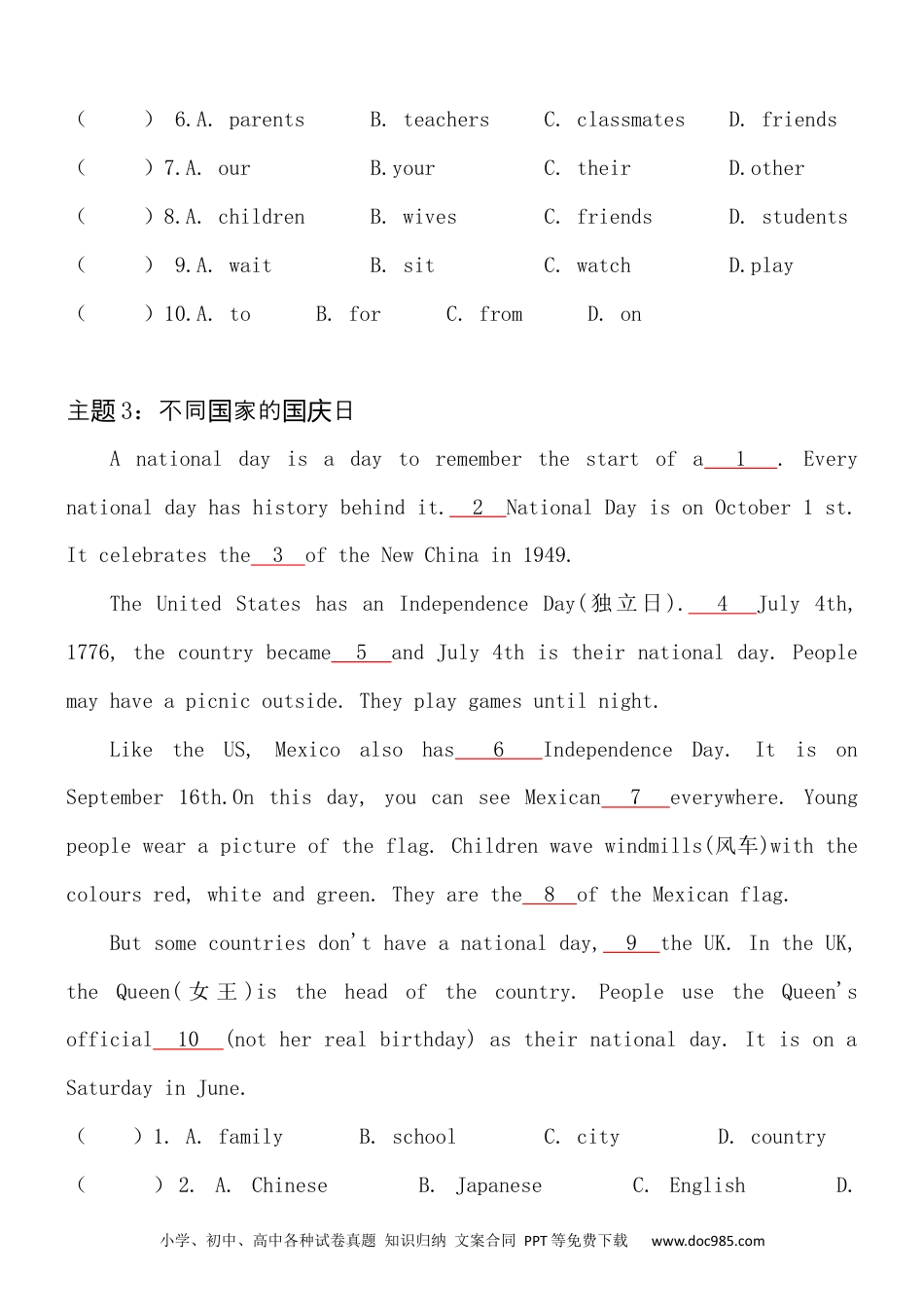小学、初中、高中各种试卷真题知识归纳文案合同PPT等免费下载www.doc985.com小升初英语PEP版完形填空专项训练(五)班级:姓名:主题1:理想的假期Everyonehasadreamholidayinourlife.IhopeIcan1atriptoFrancebyship,becauseitisabeautifulcountryfullof2,flowersandwine.Onthe3day,IwillgotoParisto4thefamousEiffelTower.Iwanttogettothetopofitandhaveagoodlookattheview(风景)ofthisgreat5.WhenIenjoythebeautifulviewsonthetopofthetower,Iwillbevery6tosayloudly“France!Iloveyou!”Thenextday,I'dliketoenjoytheFrench7.Ithinkthefoodwillbegreatlydelicious.Onthelastday,Iwillgotoshopstobuyalotof8fbrmyfriendsandfamily.ThenIwillcomeback9plane.ThetriptoFrancewillbe10ofmygreatestexperiences(经历).IamsurethatIwilllearnalotandneverforgetit.()1.A.takeB.watchC.forgetD.want()2.A.noisesB.visitorsC.loveD.students()3.A.lastB.firstC.thirdD.second()4.A.readB.watchC.loveD.visit()5.A.cityB.countryC.townD.farm()6.A.excitedlyB.exciteC.excitingD.excited()7.A.weatherB.foodC.shopsD.parks小学、初中、高中各种试卷真题知识归纳文案合同PPT等免费下载www.doc985.com()8.A.bagsB.giftsC.clothesD.candies()9.A.inB.onC.byD.from()10.A.twoB.someC.oneD.many主题2:美国教师节Teachershelpusbecomegoodstudents.Soweneedto1themforalltheirhardwork.ChinesestudentshaveaTeacher'sDayonSept.10th.But2doUSstudentsthanktheirteachers?First,USschoolshaveawhole3inMaytoappreciate(感谢)theirteachers!TeacherAppreciationDayis4theTuesdayofthatweek.Theschoolhostsparties5giftsandsnacksthatweek.Therearealsosignseverywheretoshowtheirlovefor6USstudentsliketogivesmallgiftsto7teachers.USteacherslovegettingthank-younotesfromtheir8.Teachersalsolikegettinghand-madethingsandsmallcandiesfromstudents.Studentsshouldn'tjust9untilTeacherAppreciationDay.Thankyourteachersallthetime!Theylovetohear10theirstudents.Ithelpsthemdoagoodjob.()1.A.seeB.thankC.askD.visit()2.A.howB.whyC.whenD.what()3.A.dayB.monthC.weekD.year()4.A.inB.untilC.atD.on()5.A.withB.withoutC.onD.by小学、初中、高中各种试卷真题知识归纳文案合同PPT等免费下载www.doc985.com()6.A.parentsB.teachersC.classmatesD.friends()7.A.ourB.yourC.theirD.other()8.A.childrenB.wivesC.friendsD.students()9.A.waitB.sitC.watchD.play()10.A.toB.forC.fromD.on主题3:不同家的日国国庆Anationaldayisadaytorememberthestartofa1.Everynationaldayhashistorybehindit.2NationalDayisonOctober1st.Itcelebratesthe3oftheNewChinain1949.TheUnitedStateshasanIndependenceDay(独立日).4July4th,1776,thecountrybecame5andJuly4thistheirnationalday.Peoplemayhaveapicnicoutside.Theyplaygamesuntilnight.LiketheUS,Mexicoalsohas6IndependenceDay.ItisonSeptember16th.Onthisday,youcanseeMexican7everywhere.Youngpeoplewearapictureoftheflag.Childrenwavewindmills(风车)withthecoloursred,whiteandgreen.Theyarethe8oftheMexicanflag.Butsomecountriesdon'thaveanationalday,9theUK.IntheUK,theQueen(女王)istheheadofthecountry.PeopleusetheQueen'sofficial10(notherrealbirthday)astheirnationalday.ItisonaSaturdayinJune.()1.A.familyB.schoolC.cityD.country()2.A.ChineseB.JapaneseC.EnglishD.小学、初中、高中各种试卷真题知识归纳文案合同PPT等免费下载www.doc985.comAustralian()3.A.peopleB.leadersC.birthD.heroes()4.A.InB.OnC.AboutD.From()5.A.freeB.newC.activeD.great()6.A.theB.aC./D.an()7.A.booksB.flowersC.flagsD.teachers()8.A.colourB.coloursC.picturesD.heroes()9.A.likeB.asC.forD.in()10.A.timeB.dayC.birthdayD.husband主题4:中的夜宵国Whatistheyexiaoinyourcity?Yex...