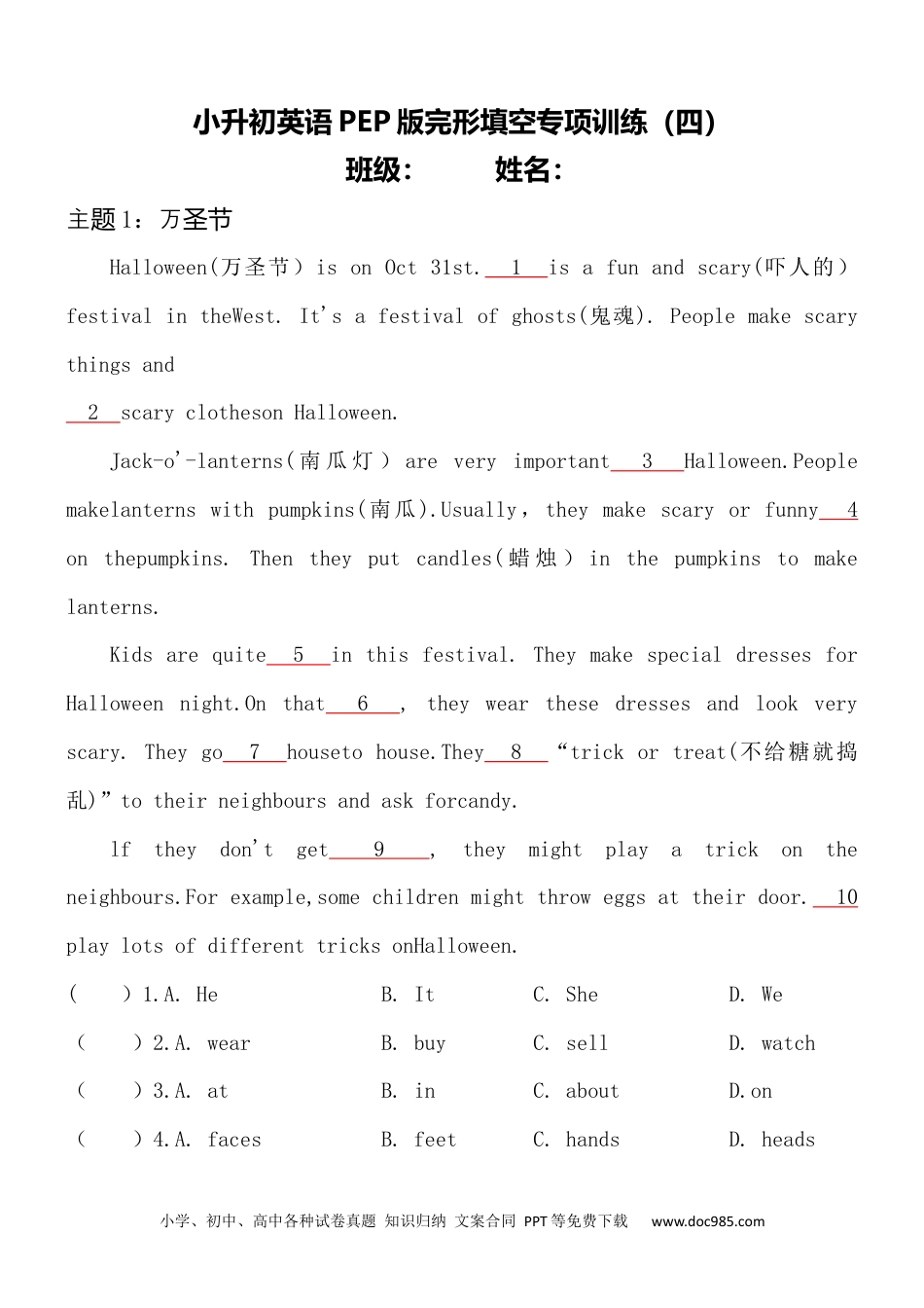 小学、初中、高中各种试卷真题知识归纳文案合同PPT等免费下载www.doc985.com小升初英语PEP版完形填空专项训练(四)班级:姓名:主题1:万圣节Halloween(万圣节)isonOct31st.1isafunandscary(吓人的)festivalintheWest.It'safestivalofghosts(鬼魂).Peoplemakescarythingsand2scaryclothesonHalloween.Jack-o'-lanterns(南瓜灯)areveryimportant3Halloween.Peoplemakelanternswithpumpkins(南瓜).Usually,theymakescaryorfunny4onthepumpkins.Thentheyputcandles(蜡烛)inthepumpkinstomakelanterns.Kidsarequite5inthisfestival.TheymakespecialdressesforHalloweennight.Onthat6,theywearthesedressesandlookveryscary.Theygo7housetohouse.They8“trickortreat(不给糖就捣乱)”totheirneighboursandaskforcandy.lftheydon'tget9,theymightplayatrickontheneighbours.Forexample,somechildrenmightthroweggsattheirdoor.10playlotsofdifferenttricksonHalloween.()1.A.HeB.ItC.SheD.We()2.A.wearB.buyC.sellD.watch()3.A.atB.inC.aboutD.on()4.A.facesB.feetC.handsD.heads小学、初中、高中各种试卷真题知识归纳文案合同PPT等免费下载www.doc985.com()5.A.interestingB.excitedC.interestedD.exciting()6.A.monthB.dayC.yearD.week()7.A.withB.inC.atD.from()8.A.laughB.cryC.sayD.sing()9.A.foodB.cakesC.clothesD.candy()10.A.ChildrenB.GirlsC.BoysD.Parents主题2:世界上最的路长铁Doyouliketakingatrain?TheTrans-SiberianRailway1heworld'slongestrailwayline.Itisonehundred2oldthisyear.TherailwaygoesfromMoscowtoVladivostok.It3acrosstheSiberianarea(西伯利亚地区)ofRussia.Tofinishthetrip,peopleneedto4aweekonthetrain.Theywillgothroughseventimezones(时区)andtravel9,280km!Duringthetrip,youwill5beautifulforests,mountainsandlakes.Forexample,LakeBaikalhas6nameof"thePearl(珍珠)ofSiberia".Youcanalsosee7historicalsites(历史遗迹).ThegreatKremlin(克里姆林宫),forexample,8inKazan.ItisoneoftheWorldHeritageSites(世界遗产).Buttheviewisnottheonlyfun.Onecanmeetpeopleandmake9duringthetraintrip.Thismightbethemost10partofthelongestrailway.()1.A.isB.soundsC.areD.looks小学、初中、高中各种试卷真题知识归纳文案合同PPT等免费下载www.doc985.com()2.A.yearB.yearsC.monthD.months()3.A.goB.fliesC.goesD.run()4.A.liveB.sleepC.lieD.spend()5.A.watchB.seeC.lookatD.listento()6.A.oneB.aC.otherD.another()7.A.manyB.muchC.alotD.few()8.A.standingB.lyingC.standsD.lie()9.A.friendsB.facesC.photosD.friend()10.A.excitedB.boringC.excitingD.interested主题3:美生校服愁国学为发Doyouwearaschooluniform(校服)?Well,1theUnitedStates,mostprivateschools(私立学校()haveuniforms.Somepublic2havethem,too.Theseschoolsthinkuniformshelpstudentswiththeir3.Wheneveryonewearsthesamething,studentsdon'tspend4timeonclothes.Thereareproblems,too.Someparentssaytheyspendtoomuch5onuniforms.Somestudentssaytheiruniformsdon'tlook6Butevenifsomeschoolsdon'thaveuniforms,almosteveryschoolhasdress7.Theytellwhatstudentsshouldnotwear.Forexample,notanktops(吊带衫()andno8wordsonanyclothes.Dressrulescanbevery9insomeschools.Ifstudentsdon't小学、初中、高中各种试卷真题知识归纳文案合同PPT等免费下载www.doc985.comfollowthem,theymighthavetogohomeandchange10.Sosomewouldsay,whynothaveschooluniforms?Whatdoyouthink?()1.A.forB.inC.atD.around()2.A.schoolsB.hospitalsC.museumsD.libraries()3.A.lifeB.healthC.bodiesD.lessons()4.A.manyB.afewC.muchD.few()5.A.moneyB.timeC.dollarsD.ideas()6.A.uglyB.beautifulC.comfortableD.cheap()7.A.habitsB.waysC.placesD.rules()8.A.goodB.beautifulC.badD.interesting()9.A.greatB.strictC.cleve...