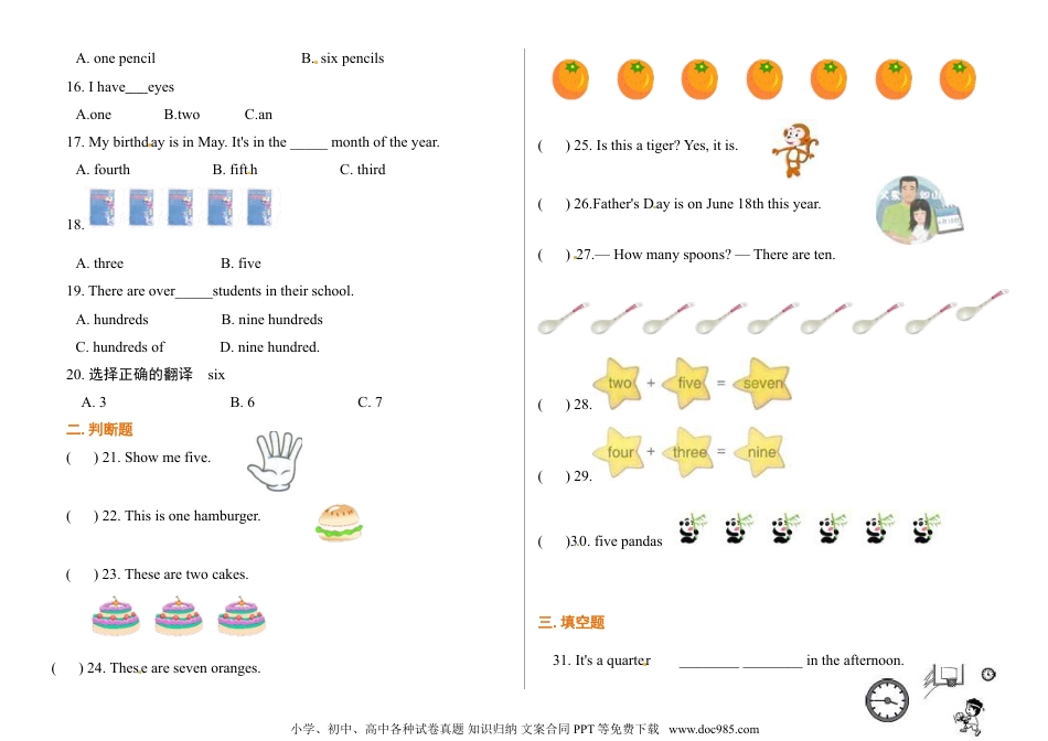 数词一.单选题1.eleven的左邻右舍是_______.A.ten,nineB.ten,twelveC.nine,twelve[来源:学科网]2.two的序数词是.A.twostB.twothC.second3.Icansee_____book.A.fourB.one4.Therearedaysinayear.A.threehundredsandsixtyfiveB.threehundredandsixty-fiveC.threehundredsandsixtyfiveD.threehundredsandsixty—five5.Yourseatisin.A.RownineB.theninerowC.theninthrowD.theninethrow6.Sheis____Englishteacher.[来源:学科网ZXXK]A.anB.aC.one7.ClassTwoisonthe_________floor.A.threeB.firstC.two8.—Howoldareyou?—I'melevenyearsold.A.B.9.Marchisthe________monthoftheyear.A.firstB.fourthC.third10.__________pupilsarestandingintheplayground.A.FivehundredsB.FivehundredsofC.Hundredsof11.A.threeB.sixC.five12.A.ninepensB.ninepencils13.Ourclassroomisonthe________floor.A.twoB.secondC.thesecond[来源:学科网]14.选出不同类的单词()A.oneB.twoC.second15.六支铅笔小学、初中、高中各种试卷真题知识归纳文案合同PPT等免费下载www.doc985.comA.onepencilB.sixpencils16.IhaveeyesA.oneB.twoC.an17.MybirthdayisinMay.It'sinthe_____monthoftheyear.A.fourthB.fifthC.third18.A.threeB.five19.Thereareover_____studentsintheirschool.[来源:学科网]A.hundredsB.ninehundredsC.hundredsofD.ninehundred.20.选择正确的翻译sixA.3B.6C.7二.判断题()21.Showmefive.()22.Thisisonehamburger.()23.Thesearetwocakes.[来源:学|科|网Z|X|X|K]()24.Thesearesevenoranges.[来源:Z|xx|k.Com]()25.Isthisatiger?Yes,itis.()26.Father'sDayisonJune18ththisyear.[来源:学&科&网]()27.—Howmanyspoons?—Thereareten.()28.()29.()30.fivepandas三.填空题31.It'saquarter________________intheafternoon.小学、初中、高中各种试卷真题知识归纳文案合同PPT等免费下载www.doc985.comI'mgoingto________________atfouro'clock.32.one,________(two/five),nine33.It’sonthe________(第二个)SundayinMay.34.Thursdayishis________(fifth/five)birthday.35.找出每组单词中不同类的一项。①________A.pencilB.penC.Three②________A.notebookB.purpleC.yellow③________A.eraserB.rulerC.rabbit④________A.twoB.haveC.seven⑤________A.schoolbagB.heavyC.small36.—Icansee________(12)kitesinthesky.—The________(12)oneisabird.36.为下列词组选择对应的图片A.B.C.D.E.(1)twodogs_____(2)fiveeggs_____(3)fourrulers_____(4)onemouth_____(5)sevenpens_____38.读一读,选择正确的答案,将字母代号写入前面的括号内①fourteen________A.②thirteen________B.③fifteen________C.④eleven________D.[来源:学§科§网Z§X§X§K]⑤twelve________E.小学、初中、高中各种试卷真题知识归纳文案合同PPT等免费下载www.doc985.com39.数字排序seventhreetwosixninetenonefour________________________________________________________40.Ineed________(four/nine)spoonsforfather,mother,sisterandme.[来源:学科网ZXXK]41.算一算,写单词(1)hamburger+juice=________yuan(2)hotdog+milk=________yuan(3)donut+juice=________yuan(4)hotdog+coffee=________yuan(5)hamburger+milk=________yuan[来源:Z+xx+k.Com](6)donut+coffee=________yuan42.Marchisthe(three)monthofayear.43.写出相应的基数词、序数词和序数词的缩略形式①________________23rd②twenty-five________________③________________46th④________Fifty-seventh________⑤eighty-eight________________44.Thereare__________(thirtieth)daysinJune.45.TheschooltripisonJune________(第三天).46.看看你有多聪明1.Oneandoneis__________.2.Threeandtwois__________.3.Sevenminus(减)fouris__________.4.Elevenminussevenis__________.5.Fourteenminuseightis__________.47.Amy:Whattimeisitnow,John?John:It's10:10.It'stimeformathsclass.Johnhasmathsclassat__________.48.选出适合的答案①eleven________A.五②ten________B.九小学、初中、高中各种试卷真题知识归纳文案合同PPT等免费下载www.doc985.com③twelve________C.十一④five________D.十⑤nine________E.十二49.Thelibraryisonthe________(eight,eighth)floor.50.选择出不同类的单词⑴________A.alwaysB.oftenC.fruit⑵________A.vegetableB.firstC.fruit⑶________A.eightB.threeC.first⑷________A.hisB.yourC.I⑸________A.drinkB.sportC.eat小学、初中、高中各种试卷真题知识归纳文案合同PPT等免费下载www.doc985.com