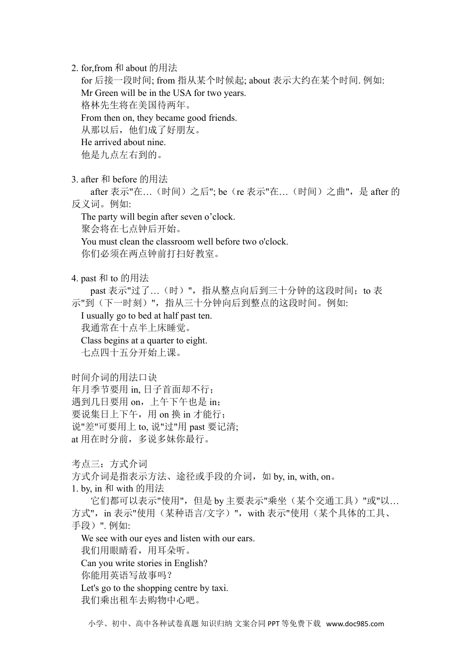 小升初语法-介词(基础篇)考点一:方位介词方位介词是表示位置和方向的介词.常用的方位介词有on,over,above,under,below,in,at,about,around,behind,between,among,beside,near等.1.on,over和above的用法on,over和above都有“在…上面”的意思,但这三个调在意义上还是有一些区别的。(1)on表示两个物体的表面相互接触,例如:Thereisaplantonthedesk.书桌上有一株植物。(植物紧贴着桌面)(2)over表示“在…的正上方”,两个物体表面没有接触,侧如:Alamphungoverthetable.桌子上方挂着一盏灯。(灯和桌面没有接触)(3)above表示一个物体在另一个的上方,但不一定是在正上方,两个物体之间没有接触。例如:Look!Alotofbirdsareflyingabovethetrees.看!许多鸟正在树的上空飞。2.under和below的用法under和below都有“在…下面”的意思,不过这两个词也是有区别的.(1)under表示“在…的正下方”。例如:Thereisacatunderthetable.桌子下面有一只猫。(2)below表示"在…的下面",但不强测是否在正下方,例如:Ourclassroomisbelowtheirs.我们的教室在他们(教室)的下面。3.in的用法in表示"在…里面",也可以用来表示在一个很大的空间内。例如:Therearesomebooksinthebox箱子里有一些书。4.at,about和around的用法at表示"在…旁边",about或around表示"在…周围"。(1)at表示在某物旁边。例如:小学、初中、高中各种试卷真题知识归纳文案合同PPT等免费下载www.doc985.comThegirlreadabookatatablebesideTom.这个女孩在汤姆身边的一张桌子旁看书。(2)about和around这两个词都可以表示"在…周围""围绕…"。例如:Thereisafenceabout/aroundthehouse.房子周围有一圈篱笆。5.behind的用法behind表示"在…的后面"。例如:YangLingsitsbehindme.杨玲坐在我后面。温馨提示:英语中用infrontof表示“在......前面”,与behind的意思刚好相反。例如:Thereisatreeinfrontofthehouse.房子前面有棵树。=Thereisahousebehindthetree.树后面有座房子。6.between和among的用法between表示"在两者之间",among表示"在三者或三者以上之间".例如:Theofficebuildingisbetweenthelibraryandtheplayground.办公楼在图书馆和操场之间。Thereisahouseamongthetrees.树林中有一座房子。7.beside和near的用法beside表示"在…旁边",near表示"在…附近(范田比较广)"。例如:TomsitsbesideBen.汤姆坐在本的旁边。Nearmyhome,thereisabookstore.在我家附近有一家书店。考点二:时间介词时间介词是指表示时间的介词。常用的时间介词有in,on,at,for,from,about,alter,before,past,to等.1.in,on和at的用法in通常用在比较大的时间之前,如年、月、季节等,也可用在泛指的上午、下午、晚上之前;on用在具体的某一天或某天的上午、下午、晚上之前;at用于某一时刻或某一时间点之前。例如:Theylikemakingsnowmeninwinter.他们喜欢在冬天堆雪人。MybirthdayisonthesecondofOctober.我的生日在十月二日。TheywentthereonthemorningofMarch26.他们在三月二十六日早上去了那儿.Hegetsupatseveno’clockeverymorning.他每天早上七点钟起床。小学、初中、高中各种试卷真题知识归纳文案合同PPT等免费下载www.doc985.com2.for,from和about的用法for后接一段时间;from指从某个时候起;about表示大约在某个时间.例如:MrGreenwillbeintheUSAfortwoyears.格林先生将在美国待两年。Fromthenon,theybecamegoodfriends.从那以后,他们成了好朋友。Hearrivedaboutnine.他是九点左右到的。3.after和before的用法after表示"在…(时间)之后";be(re表示"在…(时间)之曲",是after的反义词。例如:Thepartywillbeginafterseveno’clock.聚会将在七点钟后开始。Youmustcleantheclassroomwellbeforetwoo'clock.你们必须在两点钟前打扫好教室。4.past和to的用法past表示"过了…(时)",指从整点向后到三十分钟的这段时间;to表示"到(下一时刻)",指从三十分钟向后到整点的这段时间。例如:Iusuallygotobedathalfpastten.我通常在十点半上床睡觉。Classbeginsataquartertoeight.七点四十五分开始上课。时间介词的用法口诀年月季节要用in,...