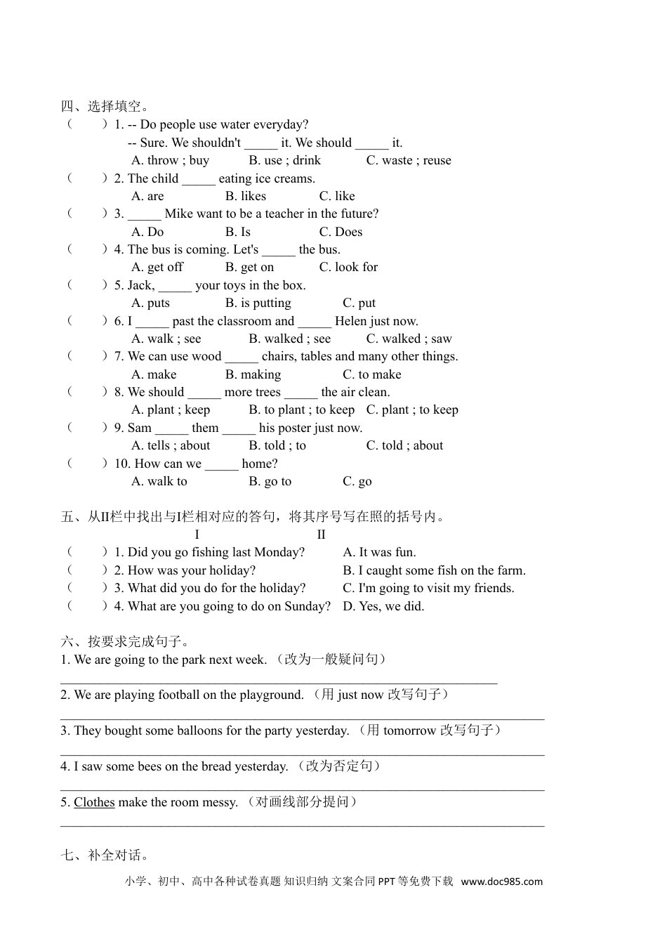 小升初语法-动词及时态练习(提升篇)一、按要求写词。(每小题1分,共15分)1.take(过去式)________________2.make(过去式)________________3.read(过去式)________________4.stand(过去式)________________5.teacher(动词)________________6.watch(第三人称单数)____________7.go(第三人称单数)_____________8.swim(现在分词)_______________9.dance(现在分词)______________10.skate(现在分词)______________11.met(原形)_________________12.ran(原形)__________________13.bought(原形)_______________14.studied(原形)________________15.sit(对应词)___________________二、根据中文提示填空。1.Alittleboy_________(指着)thekingandlaughed.2.Thestudents_________(讲故事)justnow.3.Thechildren_________(谈论他们的梦想)now.4.Thewomanis_________(摘花)inthegarden.5.I_________(将会得到红包)frommyparents.6.Thismorning,I_________(看一场鹦鹉表演).7.LiuTaooften_________(骑自行车去公园)onSundays.8.Themousehelpedthelion_________(出来).9.I_________(写信)tomysisteryesterday.10.Therewasaredman.Thedriver_________(停下等待).11.Hedidn'tdohishomeworkandhismother_________(变得生气).12.DidTom_________(吃太多食物)justnow?13.Children'sDayiscoming.I_________(演出一部戏剧).14.They_________(带一些面包)forlunch.15.Look,thechild_________(种一些树).三、用所给词的适当形式填空。1.He_________(go)tothezoolastweek.2.Look!Theapples_________(fall)downthetable.3.YangLingusually_________(finish)herhomeworkbeforebedtime.4._________(travel)aroundtheworldismydream.5.Mychild_________(have)a_________(paint)lessontomorrow.6.Sheisgoodat_________(dance).7.Ican'twait_________(have)thepicnic.8.LetSuHai_________(help)you.9.Heisgoingtoa_________(cook)school.10.Tomorrowismyfather'sbirthday.I_________(buy)himawatchyesterday.11.SuiHai,_________(notput)yourhandsonthedesk.12.Thesignmeans"No_________(smoke)".13.HeisaskingSuYanghow_________(get)there.14.Ann_________(notlike)rainydays.15.Youcan't_________(bite)thehotdognow.小学、初中、高中各种试卷真题知识归纳文案合同PPT等免费下载www.doc985.com四、选择填空。()1.--Dopeopleusewatereveryday?--Sure.Weshouldn't_____it.Weshould_____it.A.throw;buyB.use;drinkC.waste;reuse()2.Thechild_____eatingicecreams.A.areB.likesC.like()3._____Mikewanttobeateacherinthefuture?A.DoB.IsC.Does()4.Thebusiscoming.Let's_____thebus.A.getoffB.getonC.lookfor()5.Jack,_____yourtoysinthebox.A.putsB.isputtingC.put()6.I_____pasttheclassroomand_____Helenjustnow.A.walk;seeB.walked;seeC.walked;saw()7.Wecanusewood_____chairs,tablesandmanyotherthings.A.makeB.makingC.tomake()8.Weshould_____moretrees_____theairclean.A.plant;keepB.toplant;tokeepC.plant;tokeep()9.Sam_____them_____hisposterjustnow.A.tells;aboutB.told;toC.told;about()10.Howcanwe_____home?A.walktoB.gotoC.go五、从Ⅱ栏中找出与Ⅰ栏相对应的答句,将其序号写在照的括号内。IⅡ()1.DidyougofishinglastMonday?A.Itwasfun.()2.Howwasyourholiday?B.Icaughtsomefishonthefarm.()3.Whatdidyoudofortheholiday?C.I'mgoingtovisitmyfriends.()4.WhatareyougoingtodoonSunday?D.Yes,wedid.六、按要求完成句子。1.Wearegoingtotheparknextweek.(改为一般疑问句)_________________________________________________________________2.Weareplayingfootballontheplayground.(用justnow改写句子)________________________________________________________________________3.Theyboughtsomeballoonsforthepartyyesterday.(用tomorrow改写句子)________...