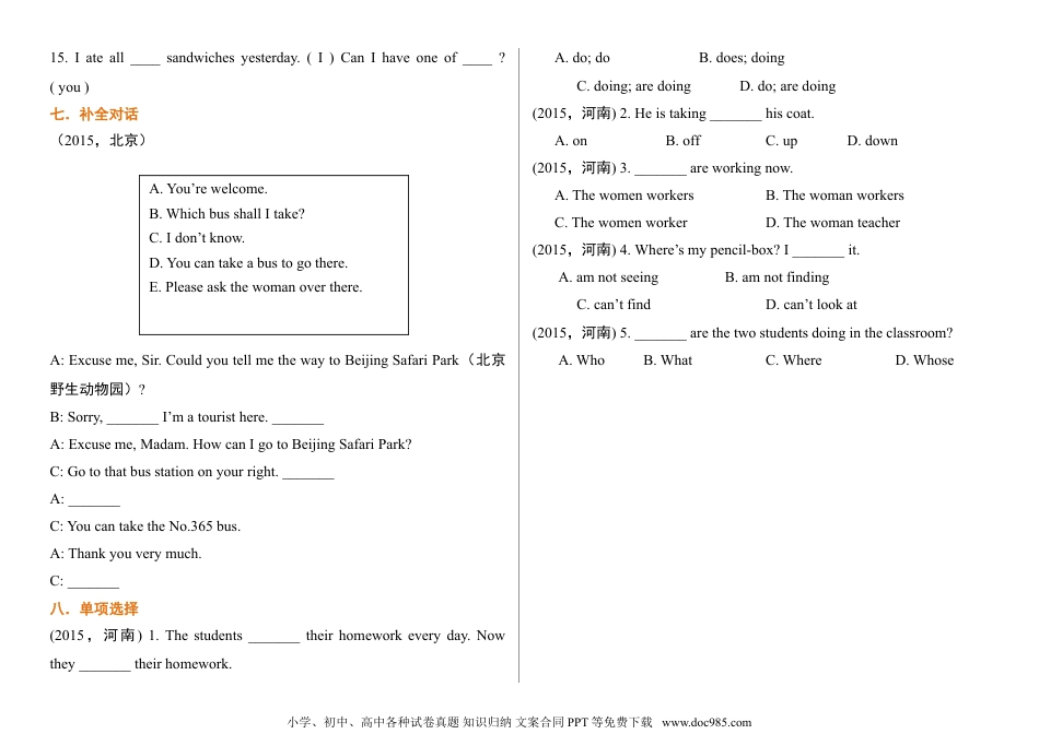 代词一.用适当的人称代词填空1._______ismyaunt.Weoftenvisit_______.(she)2.Chinaisadevelopingcountry._______isintheeastofAsia.(its)3.Whatdayis_______today?—_______isThursday.(its)5.Iownabluebike.Theredoneisn’t_______.(I)6.Thesenewhousesaresonice._______areveryexpensive.(them)7.Thefishermencaughtalotoffish,didn’t_______?(them)8.LingLingisagirl._______studiesinaprimaryschool._______brotherliveswith_______andhelps______with_______lessons.(she)9.Mikeismyclassmate._______isgoodatEnglish.(his)10.Katewantsaglassofmilk.Willyoupassitto_______?(she)11.What’stheweatherliketoday?_______iscloudy.(its)二.单项选择1.Who’ssingingoverthere?—_______isSandy’ssister.A.ThatB.ItC.SheD.This2._______willspendthesummerholidayinHawaii.A.She,youandIB.You,sheandIC.I,youandsheD.Her,meandyou3.Betweenyouand_______,heisnotarealfriend.A.meB.IC.heD.his4.Myuncleboughtanewbikefor_______.A.theirsB.theyC.meD.I5.Here’sapostcardforyou,Jim!—Oh,______isfrommyfriend,Mary.A.heB.itC.sheD.it’s6.Thisis_______.A.apictureoffamilyB.apictureofmyfamilyC.afamily’spictureD.afamilyofmypicture7.LittleBabyknowsthatheshouldnottakethethingsthatdonotbelongto_______.A.heB.hisC.herD.him8.Willanyonegoonatripwithhim?—Not_______.A.IB.meC.mineD.he9.Amongthoselovelytoys,thebrowntoydogwasgivenby_______.A.heB.hisC.himD.he’s三.选出括号中正确的词,在正确的词上打勾1.Thisis(my/I)mother.2.Nicetomeet(your/you).3.(He/His)nameisMark.4.What’s(she/her)name?5.Excuse(me/my/I).小学、初中、高中各种试卷真题知识归纳文案合同PPT等免费下载www.doc985.com6.Are(your/you)MissLi?7.(I/My)amBen.8.(She/Her)ismysister.9.Fine,thank(your/you).10.Howoldis(he/his)?四.用代词的适当形式填空1.MissGaoteaches_______Englishatschool.(we)2.Ineedanewschoolbag,so_______motherbuysonefor_______.(I)3.Thisisnotmydictionary.Thisis_______(she)4.Thisbookisnot_______(he)5.Lookat_______mouth.(I)6.Theyare_______parents.(he)7.Yourschoolisnewer(更新)than(比)_______.(she)8._______classroomisbright(明亮).(I)9.Heis_______father.(Bob)10.Thankyouforhelping_______(I)11.Thisisn’t_______pen._______isoverthere.(she)12._______schoolisfarawayfrom(远离)_______home.(he)五.改错1.Ilikehe.2.Thiscarisyour.3.Wecalltheylions(狮子).4.Thosemodelplanesaremy.5.Canmehelpyou?6.Whatisshename?7.Sheisreading(读)abookforthey.8.Thisbookisn’ther,it’smine.六.填入正确的人称代词或物主代词1.Thisisn’t________knife._________isgreen.(she)2.Theseareyourbooks,Kate.Put__________inthedesk,please.(they)3._______mustlookafter________things.(you)4.WeiFang,isthat________ruler?Yes,itis.(you)5.Theywantafootball.Give__________thegreenone,please.(they)6.It’sLinTao’sbag.Giveitto__________.(he)7.Isthispencil-boxLiLei’s?No,___________isverynew.(he)8.Thisboxistooheavy.Ican’tcarry_________.(it)Don’tworry,Let__________(I)help__________.(you)9._____isaboy._____nameisMike.Mike’sfriendslike_____verymuch.(he)10.Mysisterisin_____room._____isateacher.(she)11.Janeisalittlegirl._____motherisanurse.(she)12.Wearein_____classroom._____classroomisbig.(we)13.Myfatherandmotherareteachers._____arebusy(them)14.Youareapupil.Is_____brotherapupil,too?(you)小学、初中、高中各种试卷真题知识归纳文案合同PPT等免费下载www.doc985.com15.Iateall____sandwichesyesterday.(I)CanIhaveoneof____?(you)七.补全对话(2015,北京)A:Excuseme,Sir.CouldyoutellmethewaytoBeijingSafariPark(北京野生动物园)?B:Sorry,_______I’matouristhere._______A:Excuseme,Madam.HowcanIgotoBeijingSafariPark?C:Gotothatbusstationonyourright._______A:_______C:YoucantaketheNo.365bus.A:Thankyouverymuch.C:_______八.单项选择(2015,河南)1.Thestudents_______theirhomeworkeveryday.Nowthey_______theirhomework.A.do;doB.does;doingC.doing;aredoingD.do;aredoing(2015,河南)2.Heistaking_______hiscoat.A.onB.offC.upD.down(2015,河南)3._______areworkingnow.A.ThewomenworkersB.ThewomanworkersC.ThewomenworkerD.Thewomanteacher(2015,河南)4.Where’smypencil-box?I_______it.A.amnotseeingB.amnotfindingC.can’tfindD.can’tlookat(2015,河南)5._______arethetwostudentsdoingintheclassroom?A.WhoB.WhatC.WhereD.Whose小学、初中、高中各种试卷真题知识归纳文案合同PPT等免费下载www.doc985.comA.You’rewelcome.B.WhichbusshallItake?C.Idon’tknow.D.Youcantakeabustogothere.E.Pleaseaskthewomanoverthere.