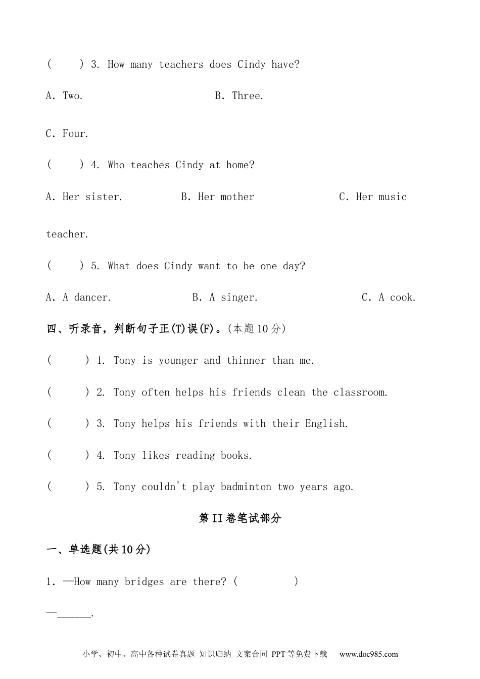 小学、初中、高中各种试卷真题知识归纳文案合同PPT等免费下载www.doc985.com英语小升初模拟试卷(三)第I卷听力部分一、你将听到一个单词,请根据读音选择正确的答案。每小题读两遍。(本题10分)()1.A.o’clockB.clock()2.A.giveB.gift()3.A.snackB.snake()4.A.bearB.pear()5.A.rainB.run()6.A.musicB.mouth()7.A.hugB.huge()8.A.startB.smart()9.A.metB.metre()10.A.hallB.fall二、听录音,选出你所听到的句子。每个句子读两遍。(本题10分)()1.A.MikelikesSpringFestivalbest.B.MikelikesChildren’sDaybest.C.MikelikesMid-AutumnFestivalbest.小学、初中、高中各种试卷真题知识归纳文案合同PPT等免费下载www.doc985.com()2.A.Lookatthegiraffe.B.Let’splaywiththegiraffe.C.Let’smakethebread.()3.A.Theycandrawcartoons.B.Theycan’tplaythepiano.C.Theycansing.()4.A.It’sonthefirstfloor.B.It’sonthefourthfloor.C.It’sonthethirdfloor.()5.A.Let’sdrinksomemilk.B.Let’seatsomerice.C.Let’shavesomechicken.三、听录音,选出正确的选项。(本题10分)()1.WhatisCindy’shobby?A.Dancing.B.Reading.C.Singing.()2.DoesCindyusuallyplaythepianoafterschool?A.Yes,shedoes.B.No,shedoesn’t.C.Sorry,Idon’tknow.小学、初中、高中各种试卷真题知识归纳文案合同PPT等免费下载www.doc985.com()3.HowmanyteachersdoesCindyhave?A.Two.B.Three.C.Four.()4.WhoteachesCindyathome?A.Hersister.B.HermotherC.Hermusicteacher.()5.WhatdoesCindywanttobeoneday?A.Adancer.B.Asinger.C.Acook.四、听录音,判断句子正(T)误(F)。(本题10分)()1.Tonyisyoungerandthinnerthanme.()2.Tonyoftenhelpshisfriendscleantheclassroom.()3.TonyhelpshisfriendswiththeirEnglish.()4.Tonylikesreadingbooks.()5.Tonycouldn'tplaybadmintontwoyearsago.第II卷笔试部分一、单选题(共10分)1.—Howmanybridgesarethere?()—______.小学、初中、高中各种试卷真题知识归纳文案合同PPT等免费下载www.doc985.comA.Icansee3.B.Thereare3C.Overtheriver2.Thereis______oldcarinthemuseum.()A.aB./C.an3.Beforemyaunt______shorthair.()A.haveB.hadC.has4.Howmany________arethereunderthetree?()A.manB.womenC.woman5.Thatisn’t__________dog.It’s________.()A.your;mineB.your;myC.yours;mine6.Look!Thegiraffes__________thanthesheep.()A.isshorterB.aretallerC.isthinner7.Sheusually_______toschoolbybus.()A.goB.goesC.going8.MyfatherisgoingtoBeijing_______.()A.yesterdayB.lastweekendC.tomorrow9.It’shotand_______today.()A.snowyB.sunnyC.cold10.Amycansingwell,sheis_________ontheplayground小学、初中、高中各种试卷真题知识归纳文案合同PPT等免费下载www.doc985.comnow.()A.singingB.dancingC.playing二、汉译英:单词/短语(共10分)1.去散步______________2.在公共汽车站______________3.写一封信______________4.我旁边的男人______________5.有相同的爱好______________6.bytheway______________7.begoodatmathsandEnglish______________8.domoreexercise______________9.haveabadcold______________10.在秋季_____________三、词形转换(共10分)1.study(第三人称单数)_______2.near(近义词)____________3.fun(形容词)____________4.two(序数词)____________5.hurt(过去式)____________6.September(缩写)__________7.these(对应词)____________8.better(原级)____________9.country(复数)___________10.I(宾格)____________四、连词成句(共10分)1.should,see,this,a,doctor,morning,I(?)小学、初中、高中各种试卷真题知识归纳文案合同PPT等免费下载www.doc985.com____________________________________________________________________2.mother,here,but,sorry,is,my,not(,.)____________________________________________________________________3.the,lot...