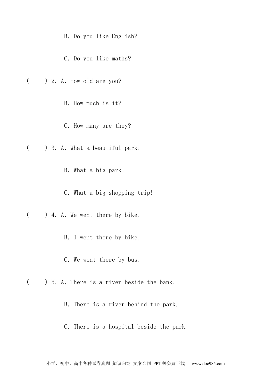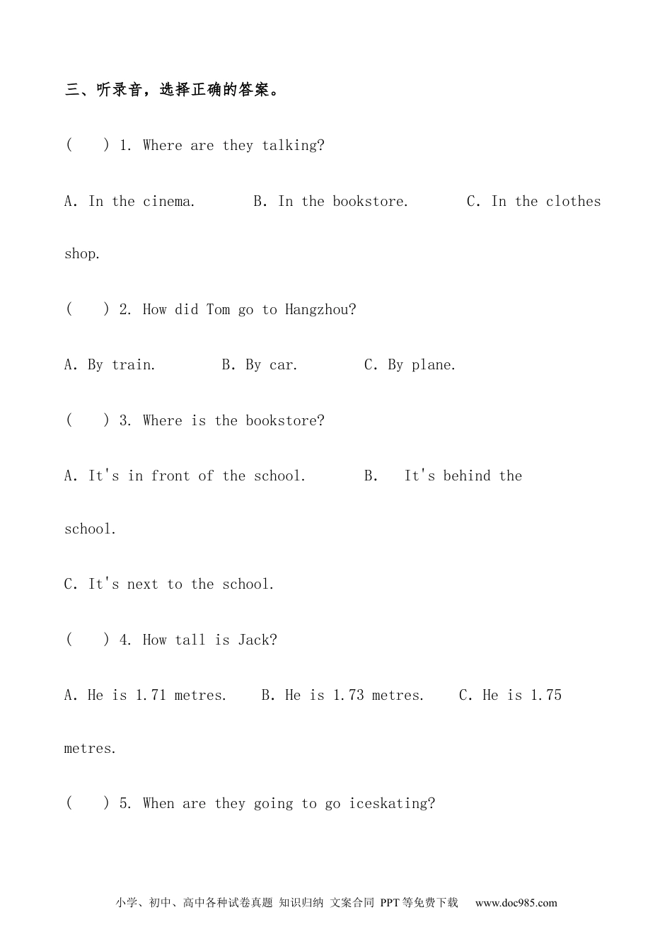 小学、初中、高中各种试卷真题知识归纳文案合同PPT等免费下载www.doc985.com六年级2023毕业小升初模拟精选卷(二)一、听录音,选出你所听到的单词,读两遍。()1.A.shorterB.smarter()2.A.showB.slow()3.A.turtleB.murder()4.A.fellB.feel()5.A.partB.play()6.A.giftB.gym()7.A.magazineB.magic()8.A.hotelB.hurt()9.A.hangB.heel()10.A.horseB.hall二、选出你所听到的句子。()1.A.DoyoulikeChinese?小学、初中、高中各种试卷真题知识归纳文案合同PPT等免费下载www.doc985.comB.DoyoulikeEnglish?C.Doyoulikemaths?()2.A.Howoldareyou?B.Howmuchisit?C.Howmanyarethey?()3.A.Whatabeautifulpark!B.Whatabigpark!C.Whatabigshoppingtrip!()4.A.Wewenttherebybike.B.Iwenttherebybike.C.Wewenttherebybus.()5.A.Thereisariverbesidethebank.B.Thereisariverbehindthepark.C.Thereisahospitalbesidethepark.小学、初中、高中各种试卷真题知识归纳文案合同PPT等免费下载www.doc985.com三、听录音,选择正确的答案。()1.Wherearetheytalking?A.Inthecinema.B.Inthebookstore.C.Intheclothesshop.()2.HowdidTomgotoHangzhou?A.Bytrain.B.Bycar.C.Byplane.()3.Whereisthebookstore?A.It'sinfrontoftheschool.B.It'sbehindtheschool.C.It'snexttotheschool.()4.HowtallisJack?A.Heis1.71metres.B.Heis1.73metres.C.Heis1.75metres.()5.Whenaretheygoingtogoiceskating?小学、初中、高中各种试卷真题知识归纳文案合同PPT等免费下载www.doc985.comA.Thisafternoon.B.Tomorrowmorning.C.Tomorrowafternoon.四、听录音,根据所听内容判断下列句子正(T)误(F)。()1.KateisinClassTwo,GradeSix.()2.TheteachersinKate'sschoolarefriendlytotheirstudents.()3.Allthestudentsgotoschoolonfoot.()4.Katehassixclassesonweekdays.()5.Thestudentscandoallkindsofactivitiesinclass.第II卷笔试部分一、单选题1.—Aretheseallours?()—Yes,______.A.they’reB.theirareC.theyare小学、初中、高中各种试卷真题知识归纳文案合同PPT等免费下载www.doc985.com2.Thepicture______BeijingisZhangPeng’s.()A.inB.ofC.with3.Icanplay______pianowellnow.()A.theB.×C.a4.Whichruleris______,theredoneorthegreenone?()A.longestB.longC.longer5.Didyou______campingwithyourgoodfriendslastweekend?()A.goesB.goC.went6.Theoldmanthankedme______myhelp.()A.forB.onC.to7.Linglingwants______somefruit.()A.buyB.buysC.tobuy8.It'shot_______summerinBeijing.()小学、初中、高中各种试卷真题知识归纳文案合同PPT等免费下载www.doc985.comA.byB.inC.at9.—Whenisyourbirthdayparty?()—______threeo'clock______themorning.A.At;onB.On;anC.At;in10.Heisan______,hedrawspictures.()A.actorB.cleanerC.artist二、汉译英:单词/短语1.一杯水_____________2.许多书_____________3.书包里_____________4.当然_____________5.脱鞋_____________6.那边_____________7.失物招领办公室_____________8.在大树下_____________9.在门后_____________10.在校园里_____________三、按要求写单词1.alotof(缩写形式)________2.man(复数)________小学、初中、高中各种试卷真题知识归纳文案合同PPT等免费下载www.doc985.com3.let's(完全形式)________4.people(复数)________5.thing(复数)________6.do(过去式)______________7.brought(原型)______________8.sad(反义词)______________9.cap(复数)________________10.rain(形容词)_________________11.T-shirt(复数)_________________四、连词成句1.booksmanyaretheretoobagthein(.)___________________________________________________________________2.nightwhatdidlastAmydo(?)___________________________________________________________________3.will,the,spring,this,children,kites,fly(.)__________________________________________________...
