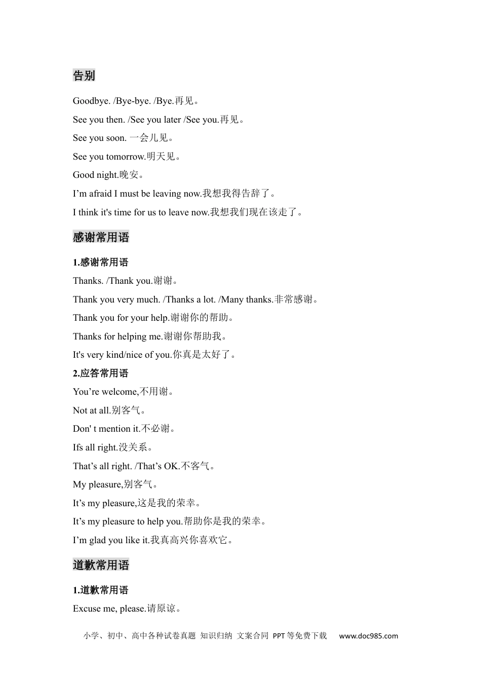 小学、初中、高中各种试卷真题知识归纳文案合同PPT等免费下载www.doc985.com小升初英语必背句型问候1.初次见面的问候语Howdoyoudo?你好!Nice/Glad/Pleasedtomeetyou.认识你很高兴。2.熟人之间的问候语Hello./Hi.你好。Goodmorning!/Morning!早上好!Goodafternoon!下午好!Goodevening!晚上好!Howareyou?你好吗?介绍1.介绍自己的情况IamLucy,我是露西。MynameisLily.我的名字叫莉莉。Iamastudent.我是一个学生。IcomefromChina,rmChinese,我来自中国,我是中国人。IstudyinBeijingPrimarySchool.IaminClass2,Grade6.我在北京小学学习,是六年级二班学生。2.介绍别人的情况ThisisMrGreen.这是格林先生。Thisismymother.Sheisateacher.这是我妈妈。她是一名教师。I'dlikeyoutomeetTom.我想让你认识一下汤姆。MayIintroduceMissSmithtoyou?我可以把史密斯小姐介绍给你吗?3.介绍某物或某地的情况Thisismyfavouritecat,Mimi.这是我最喜欢的猫,咪咪。Itisacircle.它是一个圆。ThisistheGreatWall.It’sthemostfamousinChina.这是长城,它在中国是最负盛名的。小学、初中、高中各种试卷真题知识归纳文案合同PPT等免费下载www.doc985.com告别Goodbye./Bye-bye./Bye.再见。Seeyouthen./Seeyoulater/Seeyou.再见。Seeyousoon.一会儿见。Seeyoutomorrow.明天见。Goodnight.晚安。I’mafraidImustbeleavingnow.我想我得告辞了。Ithinkit'stimeforustoleavenow.我想我们现在该走了。感谢常用语1.感谢常用语Thanks./Thankyou.谢谢。Thankyouverymuch./Thanksalot./Manythanks.非常感谢。Thankyouforyourhelp.谢谢你的帮助。Thanksforhelpingme.谢谢你帮助我。It'sverykind/niceofyou.你真是太好了。2.应答常用语You’rewelcome,不用谢。Notatall.别客气。[来源:Zxxk.Com]Don'tmentionit.不必谢。Ifsallright.没关系。That’sallright./That’sOK.不客气。Mypleasure,别客气。It’smypleasure,这是我的荣幸。It’smypleasuretohelpyou.帮助你是我的荣幸。I’mgladyoulikeit.我真高兴你喜欢它。道歉常用语1.道歉常用语Excuseme,please.请原谅。小学、初中、高中各种试卷真题知识归纳文案合同PPT等免费下载www.doc985.comSorry./I’msorry.对不起。I’mverysorry.十分抱歉。I’msorryfor/aboutit.我对这件事感到抱歉。2.应答常用语That’sailright./That'sOK.没关系。That'snothing.没什么.Itdoesn'tmatter.不碍事。Nevermind.别介意。请求1.请求常用语MayI...?我可以...吗?Can/CouldI...?我能...吗?Do/WouldyoumindifI...?如果我...你介意吗?IwonderifIcould...?我想知道我是否能...?IsitallrightifI...?如果我...好吗?2.应答常用语Yes./Sure./Certainly.是的./行./当然可以.Yes,(do)please.可以,请吧。Ofcourse(youmay).当然(你可以)。Certainlynot./Ofcoursenot.当然不会。That’sOK./That,sailright.行。/好的。Notatall.没问题。I’mafraidnot.恐怕不行。I’msorryyoucan’t.对不起,你不能。I’msorry,but...抱歉,但是……You’dbetternot.你最好不要。提供帮助及其应答1.提供帮助常用语小学、初中、高中各种试卷真题知识归纳文案合同PPT等免费下载www.doc985.comCan/Could/ShallIhelpyou?我能为你做点什么?WhatcanIdoforyou?我能为你做点什么?Isthereanythingleandoforyou?有什么我能为你做的吗?[来源:学科网]Doyouwantmeto...?你要我做...吗?Wouldyoulikesome...?你想要点...吗?Letmedo/carry/help...foryou,让我为你做/为你搬/帮你...2.应答常用语Yes,please.好的,请吧。That’sverykindofyou,你真是太好了。Thanks.Thatwouldbenice/fine.谢谢。那太好了。No,thanks./No,thankyou.不用,谢谢。/不用,谢谢你。No,thanks.Icanmanageitmyself.不用,谢谢。我自己能行。That’sverykindofyou,but...你真是太好了,但是...[来源:Z。xx。k.Com]Thankyouallthesame.仍然谢谢你。询问及其应答1.询问常用语What'syourhobby?你的爱好是什么?What'syourfavouritecolour/subject/food...?你最喜欢的颜色/课程/食物……是什么?Whichdrinkdoyoulikebest?你最喜欢什么饮料?Whatdoyoudo?...