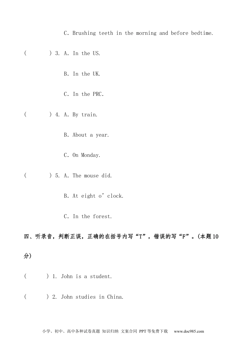 小学、初中、高中各种试卷真题知识归纳文案合同PPT等免费下载www.doc985.com六年级英语小升初模拟试卷(十三)一、听音选词,听2遍。(本题10分)()1.A.tiredB.travelC.fairytale()2.A.planttreesB.TreePlantingDayC.apieceof()3.A.moveB.togetherC.wood()4.A.theGreatWallB.theEiffelTowerC.placesofinterest()5.A.dropB.difficultC.aloud二、听录音,选择所听句子中包含的信息,每小题读两遍。(本题10分)()1.A.goswimmingB.gotoseeadoctorC.gotobed小学、初中、高中各种试卷真题知识归纳文案合同PPT等免费下载www.doc985.com()2.A.thefirsttripB.milkacowC.goingfishing()3.A.inthetreesB.intheparkC.inthegarden()4.A.playedgamesB.flyakiteC.seeafilm()5.A.visitedafarmB.domyhomeworkC.makeacake三、根据你所听到的内容,选择合适的应答句,听两遍。(本题10分)()1.A.Playfootballwithgoodfriends.B.WaitforthegreenlightC.Crosstheroadwithotherpeople.()2.A.Eatingalotofsweetsatatime.B.Goingtobedlateatnight.小学、初中、高中各种试卷真题知识归纳文案合同PPT等免费下载www.doc985.comC.Brushingteethinthemorningandbeforebedtime.()3.A.IntheUS.B.IntheUK.C.InthePRC.()4.A.Bytrain.B.Aboutayear.C.OnMonday.()5.A.Themousedid.B.Ateighto’clock.C.Intheforest.四、听录音,判断正误,正确的在括号内写“T”,错误的写“F”。(本题10分)()1.Johnisastudent.()2.JohnstudiesinChina.小学、初中、高中各种试卷真题知识归纳文案合同PPT等免费下载www.doc985.com()3.Johnlikesplayingbasketball.()4.Johngoesbackhomeat6:30p.m.()5.Johndoesn’tlikereadingbooksintheevening.五、单选题(共10分)1.Iusuallygotoschool_____seven____themorning.()A.at;onB.at;inC.about;onD.in;on2.Howmany________?()A.candleB.candles3.We_______threenewfriends.()A.hasB.haveC.is4.There___________threebooksinmybag.()A.areB.isC.am5.What’syour___________job?()A.auntB.uncle’sC.fathers小学、初中、高中各种试卷真题知识归纳文案合同PPT等免费下载www.doc985.com6.It's7:30.It'stime________toschool.()A.goB.forgoC.togo7.Lookatthe______.()A.o’clockB.clockC.aclock8.Thereisacall_______you.()A.forB.withC.to9._____youlikethemusic,children?()A.AreB.DoesC.Do10.Icouldn't______thehamburger,becauseitwasbad.()A.eatB.ateC.eating六、中英互译:单词/短语(共10分)1.heavier_________________2.更长的_________________3.kilogram_________________4.更年长的_________________5.size_________________6.rideahorse_______________小学、初中、高中各种试卷真题知识归纳文案合同PPT等免费下载www.doc985.com7.劳动节假期_______________8.hurtmyfoot_______________9.去游泳_______________10.summerholiday_______________七、词形转换(共10分)1.short(反义词)__________2.quiet(反义词)__________3.can(过去式)__________4.cycle(现在分词)__________5.did(否定式)__________6.one(序数词)_____________7.wear(动词-ing形式)_____________8.go(第三人称单数)_____________9.I(名词性物主代词)_____________10.say(过去式)____________八、连词成句(注意标点符号)。(共10分)1.help,can,you,I(?)2.how,people,many,there,are,your,in,小学、初中、高中各种试卷真题知识归纳文案合同PPT等免费下载www.doc985.comfamily(?)3.what,the,weather,is,like,today(?)4.are,you,doing,what(?)5.likes,he,stamps,too,collecting(.)6.did,what,do,you,weekend,last(?)7.should,he,this,see,doctor,a,morning(.)8.no,in,there,my,old,was,library,school,(.)小学、初中、高中各种试卷真题知识归纳文案合同PPT等免费下载www.doc985.com九、阅读选择(共10分)I’mOliver.Ourweekendatthehotelwasbad.Ourroomwasbigbuteverythingwasveryold.OurfriendRobincleanedourroom...