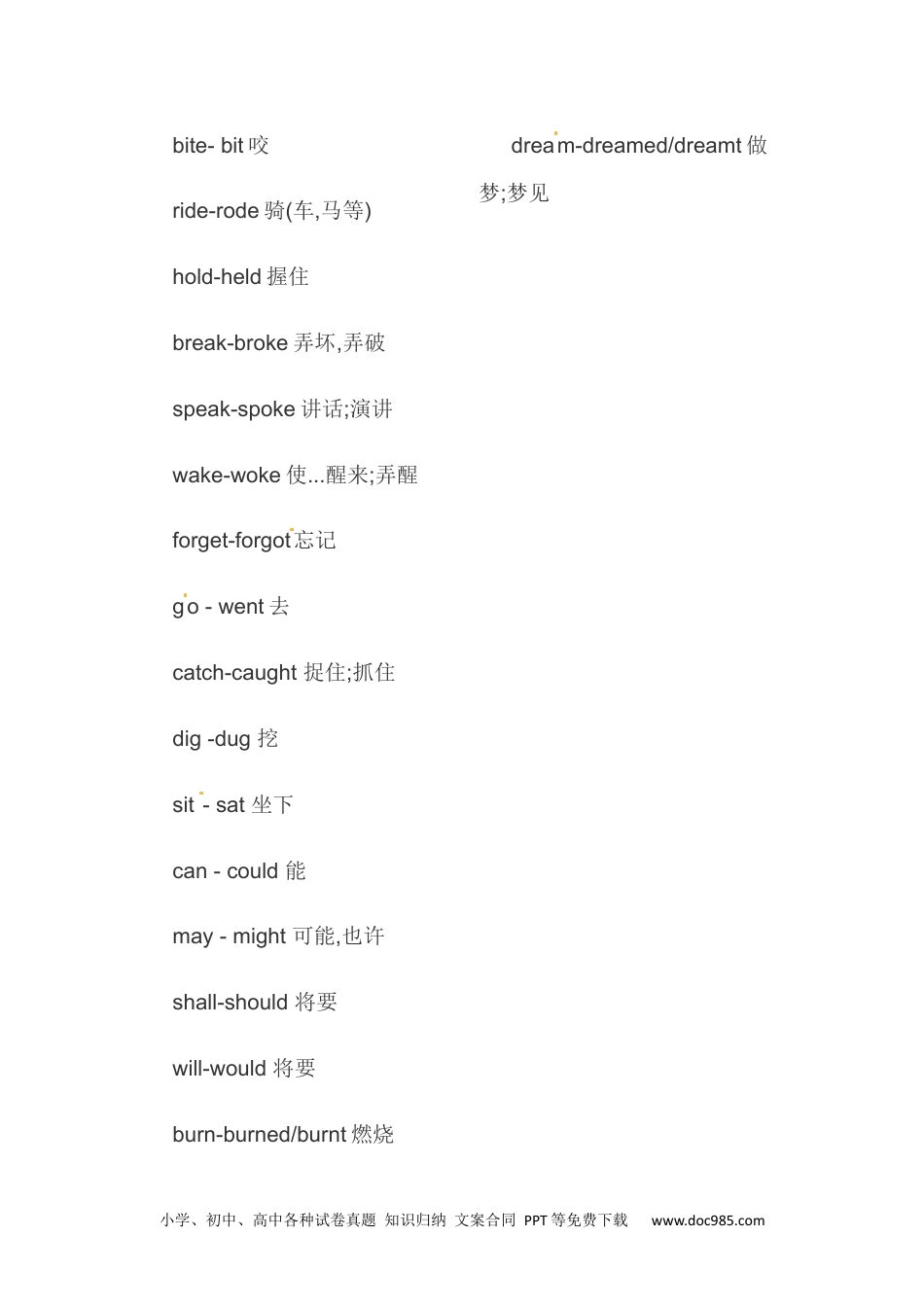小学、初中、高中各种试卷真题知识归纳文案合同PPT等免费下载www.doc985.com小学生英语常见动词过去式汇总is-was是are-were是am-was是go-went去do,does-did做bring-brought带来make-made制作have-had有,吃run-ran跑[来源:Z#xx#k.Com]tell-told高速eat-ate吃get-got得到draw-drew画put-put放read-read读take-took携带see-saw看见fly-flew飞cut-cut切meet-met遇见tell-told告诉build-built建造lose-lost失去[来源:学科网]hear-heard听见buy-bought买[来源:Z,xx,k.Com]choose-chose选择forget-forgot忘记sing-sang唱[来源:学_科_网]小学、初中、高中各种试卷真题知识归纳文案合同PPT等免费下载www.doc985.combegin-began开始drink-drank喝wear-wore穿know-knew知道teach-taught教swim-swam游泳stand-stood站立keep-kept保持think-thought想[来源:学§科§网Z§X§X§K]call-called打电话Use-used使用learn-learned/learnt学习cost--cost价值hit--hit撞击shut--shut关become-became变得,成为come-came来run-ran跑begin-began开始drink-drank喝ring-rang打电话fall-fell落下;跌倒meet-met碰到,会面blow-blew吹grow-grew种植;生长throw-threw投;掷;扔see-saw看见,看到show-showed出示;给...看give-gave给drive-drove驾驶小学、初中、高中各种试卷真题知识归纳文案合同PPT等免费下载www.doc985.combite-bit咬ride-rode骑(车,马等)hold-held握住break-broke弄坏,弄破speak-spoke讲话;演讲wake-woke使...醒来;弄醒forget-forgot忘记go-went去catch-caught捉住;抓住dig-dug挖sit-sat坐下can-could能may-might可能,也许shall-should将要will-would将要burn-burned/burnt燃烧dream-dreamed/dreamt做梦;梦见小学、初中、高中各种试卷真题知识归纳文案合同PPT等免费下载www.doc985.com