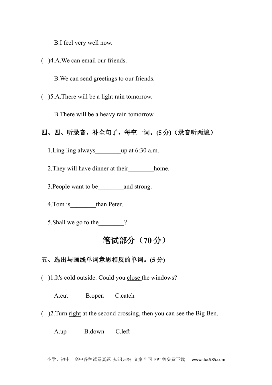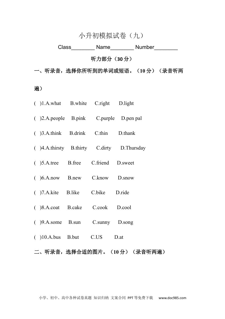 小学、初中、高中各种试卷真题知识归纳文案合同PPT等免费下载www.doc985.com小升初模拟试卷(九)Class________Name________Number________听力部分(30分)一、听录音,选择你所听到的单词或短语。(10分)(录音听两遍)()1.A.whatB.whiteC.rightD.light()2.A.peopleB.pinkC.purpleD.penpal()3.A.thinkB.drinkC.thinD.thank()4.A.thirstyB.thirtyC.dirtyD.Thursday()5.A.treeB.freeC.friendD.sweet()6.A.nowB.newC.knowD.snow()7.A.kiteB.likeC.bikeD.ride()8.A.coatB.cakeC.cookD.cool()9.A.someB.sunC.sunnyD.song()10.A.busB.butC.USD.at二、听录音,选择合适的图片。(10分)(录音听两遍)小学、初中、高中各种试卷真题知识归纳文案合同PPT等免费下载www.doc985.com()1.A.B.()2.A.B.()3.A.B.()4.A.B.()5.A.B.三、三、听录音,选出你所听到的句子。(5分)(录音听两遍)()1.A.I'dlikeaboxoflotusseedmooncakes.B.I'dlikeaboxofredbeanmooncakes.()2.A.Katiesometimestakesawalk.B.Katienevertakesawalk.()3.A.Idon'tfeelwelltoday.小学、初中、高中各种试卷真题知识归纳文案合同PPT等免费下载www.doc985.comB.Ifeelverywellnow.()4.A.Wecanemailourfriends.B.Wecansendgreetingstoourfriends.()5.A.Therewillbealightraintomorrow.B.Therewillbeaheavyraintomorrow.四、四、听录音,补全句子,每空一词。(5分)(录音听两遍)1.Linglingalways________upat6:30a.m.2.Theywillhavedinnerattheir________home.3.Peoplewanttobe________andstrong.4.Tomis________thanPeter.5.Shallwegotothe________?笔试部分(70分)五、选出与画线单词意思相反的单词。(5分)()1.It'scoldoutside.Couldyouclosethewindows?A.cutB.openC.catch()2.Turnrightatthesecondcrossing,thenyoucanseetheBigBen.A.upB.downC.left小学、初中、高中各种试卷真题知识归纳文案合同PPT等免费下载www.doc985.com()3.—WhydoesMarylooksoworried?—Becauseshelostherfavouritepetdog.A.tookB.gotC.gave()4.Therewillbeastrongwind.Gohomequickly.A.lightB.funnyC.small()5.MrsChenoftentakesawalkafterdinner.A.duringB.atC.before六、用所给单词的正确形式填空。(10分)1.Itisalwayscooland________(wind)inautumn.2.Thelibraryisonthe________(two)floor.3.—What______(do)you______(do)lastnight?—IwatchedTV.4.Wesawmany________(kangaroo)inthezoolastweekend.5.Iwill________(take)pictureswithmyfriendtomorrow.6.Hisfeetare________(small)thanyours.7.John________(have)acoldlastnight,sobedidn’t_____(sleep)well.8.Themonkeysare________(climb)thetreesnow.小学、初中、高中各种试卷真题知识归纳文案合同PPT等免费下载www.doc985.com七、单项选择。(10分)()1.Ienjoy________atthemoon.A.looksB.lookedC.looking()2.Thestudentis________apicturewithabrush.A.paintsB.paintingC.paint()3.Wecanhelp________tocarrythings.A.themB.theyC.their()4.Sheliketoreadbooks________space.A.aboutB.withC.for()5.Tom'shairis________thanMike’s.A.longerB.longC.longest()6.Ihaveapicture________BigBen________London.A.of,onB.in;inC.of;in()7.—IsthatAnne?—Yes,________Anne.A.IamB.thisisC.itis()8.Linglingsometimes________tothezoowithherparents.A.goB.goesC.isgoing小学、初中、高中各种试卷真题知识归纳文案合同PPT等免费下载www.doc985.com()9.Peterwas________inthefilm.A.interestB.interestedC.interesting()10.You________litterhereandthere.A.areB.shouldC.shouldn't八、选择合适的单词,将句子补充完整。(5分)A.difficultB.healthyC.restaurantD.SpringFestivalE.chocolate1.Myfamilygoestothe__________tohaveabigdinnertogether.2.Weshouldeat________food.Weshouldeatvegetablesandfruit.3.Mingmingcan'treadthisbook.It'stoo________.4.We'llhaveapicnicatthepark.Iwillbringafewbarsof________.5.Childrenenjoythe________most.Theywearnewclothesandgetredpackets.九、找出...