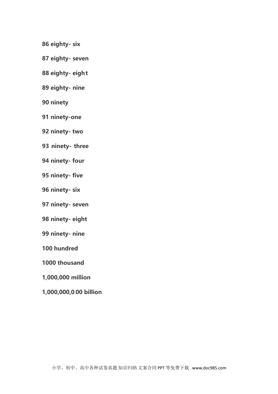 小学生必备英语词汇之基数词篇1one2two3three4four5five6six7seven8eight9nine10ten11eleven12twelve13thirteen14fourteen15fifteen16sixteen17seventeen18eighteen19nineteen20twenty21twenty-one22twenty-two23twenty-three24twenty-four25twenty-five26twenty-six27twenty-seven28twenty-eight29twenty-nine30thirty[来源:学科网]31thirty-one32thirty-two33thirty-three34thirty-four35thirty-five36thirty-six37thirty-seven38thirty-eight[来源:学科网ZXXK]39thirty-nine40forty41forty-one小学、初中、高中各种试卷真题知识归纳文案合同PPT等免费下载www.doc985.com42forty-two43forty-three44forty-four45forty-five46forty-six47forty-seven48forty-eight49forty-nine50fifty51fifty-one52fifty-two53fifty-three54fifty-four55fifty-five56fifty-six57fifty-seven58fifty-eight59fifty-nine60sixty61sixty-one62sixty-two63sixty-three[来源:学。科。网Z。X。X。K]64sixty-four65sixty-five66sixty-six67sixty-seven68sixty-eight69sixty-nine70seventy71seventy-one72seventy-two73seventy-three74seventy-four75seventy-five76seventy-six77seventy-seven78seventy-eight79seventy-nine80eighty81eighty-one82eighty-two83eighty-three84eighty-four85eighty-five小学、初中、高中各种试卷真题知识归纳文案合同PPT等免费下载www.doc985.com86eighty-six87eighty-seven[来源:学科网ZXXK]88eighty-eight89eighty-nine90ninety91ninety-one[来源:Zxxk.Com]92ninety-two93ninety-three94ninety-four95ninety-five96ninety-six97ninety-seven98ninety-eight99ninety-nine100hundred1000thousand1,000,000million1,000,000,000billion小学、初中、高中各种试卷真题知识归纳文案合同PPT等免费下载www.doc985.com小学、初中、高中各种试卷真题知识归纳文案合同PPT等免费下载www.doc985.com