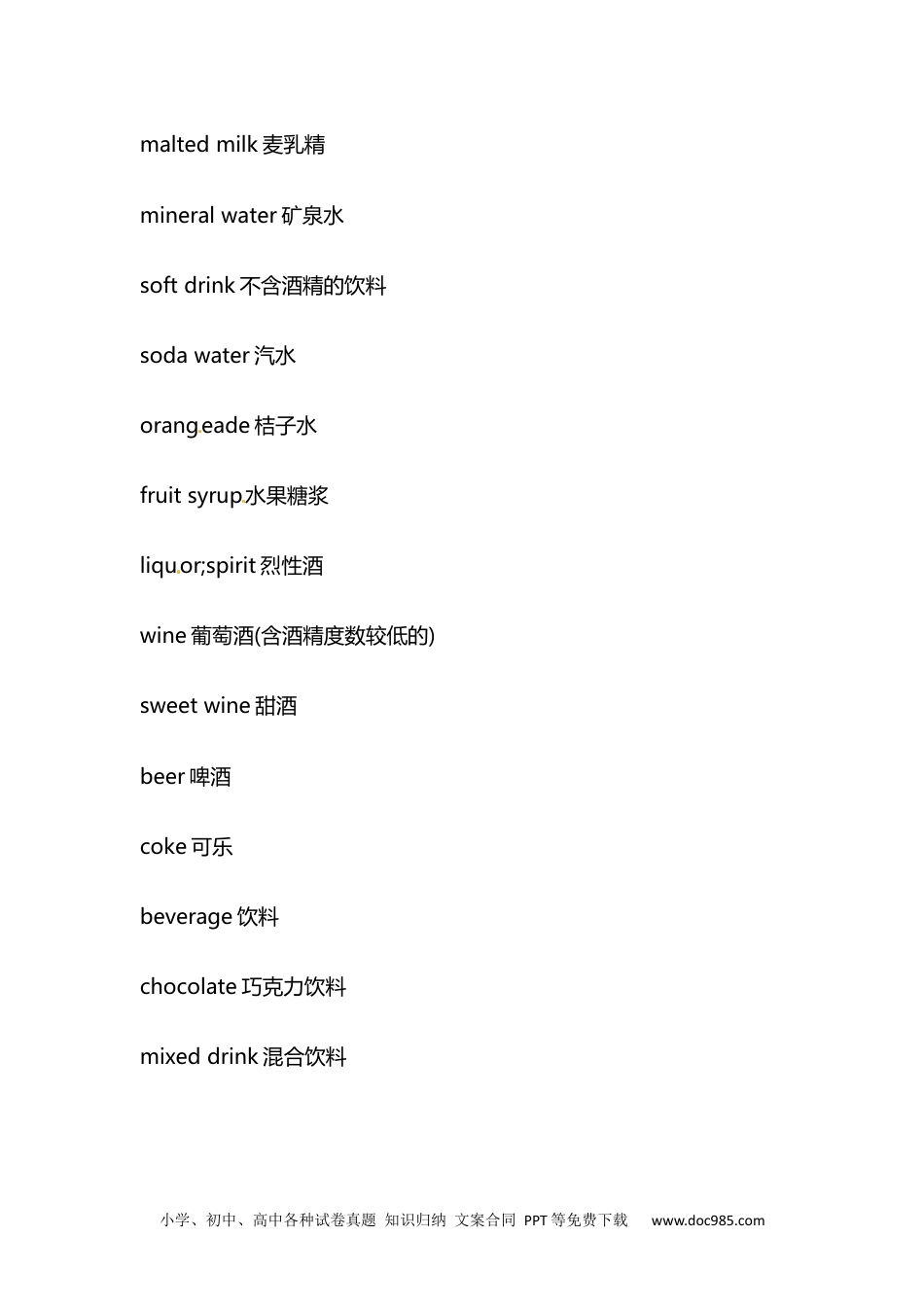 小学、初中、高中各种试卷真题知识归纳文案合同PPT等免费下载www.doc985.com小学生必备英语词汇之饮食篇salt盐sugar糖vinegar醋carp鲤鱼crab螃蟹lobster龙虾beef牛肉pork猪肉mutton羊肉lamb羔羊肉chicken鸡肉[来源:Zxxk.Com]rice米饭water水wheatgluten面筋blacktea红茶greentea绿茶strong(weak)tea浓(淡)茶bricktea砖茶blackcoffee(不加牛奶的)纯咖啡coffeewithmilk;whitecoffee牛奶咖啡instantcoffee速溶咖啡cocoa可可milk牛奶wholemilk全脂奶milkcurd奶酪powderedmilk奶粉condensedmilk炼乳小学、初中、高中各种试卷真题知识归纳文案合同PPT等免费下载www.doc985.commaltedmilk麦乳精[来源:Z#xx#k.Com]mineralwater矿泉水softdrink不含酒精的饮料sodawater汽水orangeade桔子水[来源:学.科.网Z.X.X.K][来源:Zxxk.Com]fruitsyrup水果糖浆liquor;spirit烈性酒[来源:学+科+网]wine葡萄酒(含酒精度数较低的)sweetwine甜酒beer啤酒coke可乐beverage饮料chocolate巧克力饮料mixeddrink混合饮料小学、初中、高中各种试卷真题知识归纳文案合同PPT等免费下载www.doc985.com