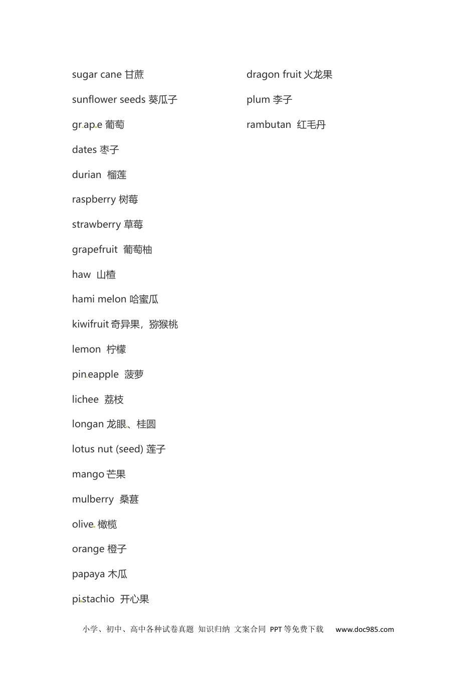 小学、初中、高中各种试卷真题知识归纳文案合同PPT等免费下载www.doc985.com小学生必备英语词汇之蔬菜水果篇蔬菜tomato蕃茄radish小红萝卜mooli白萝卜watercress西洋菜babycorn玉米尖potato马铃薯carrot红萝卜greenpepper青椒redpepper红椒yellowpepper黄椒mushroom蘑菇lettuce莴苣菜okra秋葵corn玉米粒onion洋葱eggplant茄子celery芹菜whitecabbage包心菜redcabbage紫色包心菜cucumber大黄瓜sweetcorn玉米cauliflower白花菜onions洋葱garlic大蒜ginger姜Chineseleaves大白菜leeks大葱水果apple苹果apricot杏子banana香蕉bitterorange苦柑橘blackberry黑莓blueberry蓝莓cherry樱桃starfruit杨桃cherrytomato圣女果coconut椰子cranberry蔓越莓pear香梨commonfig无花果小学、初中、高中各种试卷真题知识归纳文案合同PPT等免费下载www.doc985.comsugarcane甘蔗sunflowerseeds葵瓜子grape葡萄dates枣子durian榴莲raspberry树莓strawberry草莓grapefruit葡萄柚haw山楂[来源:学#科#网Z#X#X#K]hamimelon哈蜜瓜kiwifruit奇异果,猕猴桃[来源:学科网]lemon柠檬[来源:Z|xx|k.Com]pineapple菠萝lichee荔枝longan龙眼、桂圆lotusnut(seed)莲子mango芒果[来源:Zxxk.Com]mulberry桑葚olive橄榄orange橙子[来源:学.科.网Z.X.X.K]papaya木瓜pistachio开心果dragonfruit火龙果plum李子rambutan红毛丹小学、初中、高中各种试卷真题知识归纳文案合同PPT等免费下载www.doc985.com