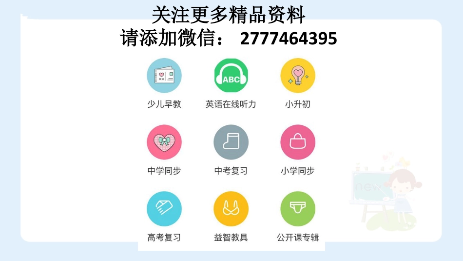 关注更多精品资料请添加微信:2777464395小升初英知点精语识讲序的用法数词Todayismybirthday!ninth表示顺序thethirdlessonthefirstpicture第一张图片第三课PictureOneLessonThree表示日期Oct.4thJan.1st十月四日一月一日读作:Octoberthefourth读作:Januarythefirst序数词与thefirstpictureJanuaryfirstthethe序数词前经常加上the序数词与a(an)Iwanttoreadthebookathirdtime.再一次:这本书我想再读第三遍。当序数词前有物主代词或名词所有格修饰时,不用冠词。hissecondbook他的第二本书Peter’sthirdjob彼得的第三份工作单项选择。-What’sthedatetoday?-It’s__________.A.MaythefourthB.MayfourC.fourthMay选A。日期应当表达为“月+the+序数词”。【解析】单项选择。Thereare______picturesonthewall,the________oneismine.A.three;thirdB.third;threeC.three;three选A。表示数量用基数词,表示顺序用序数词。【解析】Ibought_____secondcomputeryesterday.A.aB.anC.theC题目要表达的意思是“又买了一台电脑”,所以应该用不定冠词a.【解析】【错误答案】【正确答案】易错1ASarahis12yearsold.Todayisher_________birthday.A.twelveB.twelfthC.thetwelfthCSarah12岁了,今天是她的第12个生日,应当用序数词twelfth,因为前面有her修饰,所以不需要再加the.【解析】【错误答案】【正确答案】易错2B1.表示顺序the+序数词2.表示日期月+the+序数词1.经常与the连用;2.表示“再一次”时与a(an)连用;3.前面有物主代词或名词所有格时,不用冠词。