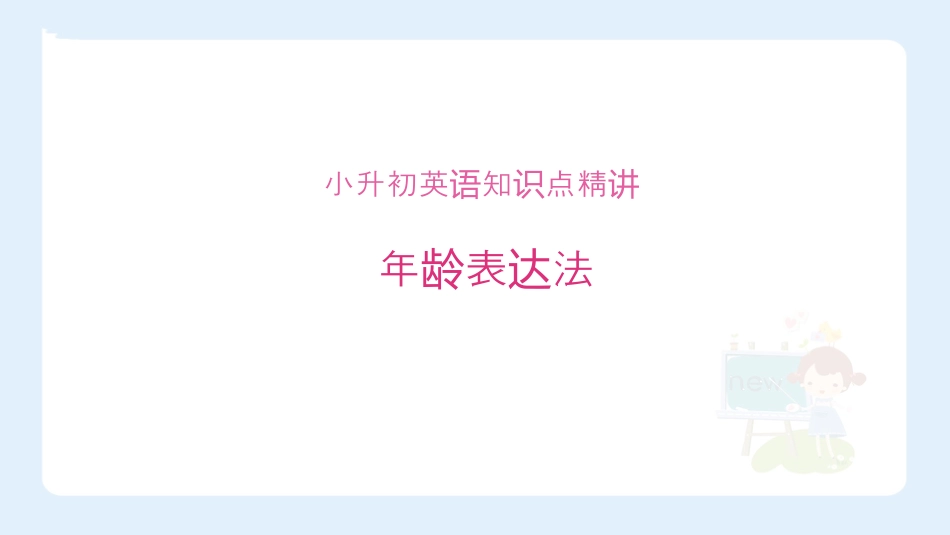 关注更多精品资料请添加微信:2777464395小升初英知点精语识讲年表法龄达那个小男孩是谁?他多大了?如何询问年龄呢?Howold知识1结构Howold+be+主语?Howoldareyou?Howoldishe?Howoldisshe?知识2如何回答年龄呢?yearsold结构主语+be+数字+yearsold.Iamsevenyearsold.结构主语+be+数字+yearsold.Heisfiveyearsold.Sheissixyearsold.知识3yearsold可以省略吗?Iam11yearsold.Iam11.11.单项选择:---______isLiMing?---Heisfiveyearsold.A.WhatB.WhereC.HowD.Howold根据答语可知,此处在询问年龄,询问年龄用疑问词Howold.D翻译句子:你多大了?___________________?询问年龄,要使用疑问词howold,你是第二人称,be动词用are。Howoldareyou---______areyou?---Iamnine.A.HowB.HowoldAIamnine.表示“我九岁。”所以此处在询问年龄,问年龄用howold。B【解析】【错误答案】【正确答案】易错1Mysisterisone________.A.yearoldB.yearsoldByearsold用于表示“……岁”,但是当前面的数字为1时,要使用year的单数形式。A【解析】【错误答案】【正确答案】易错2询问年龄用:Howold+be+主语?年龄的表达法回答年龄用:主语+be+数字+yearsold.