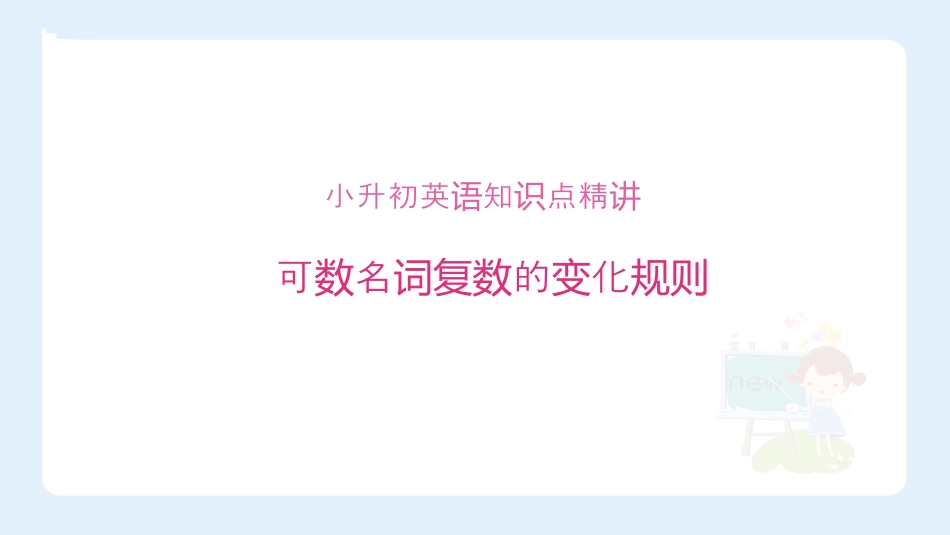 关注更多精品资料关注更多精品资料请添加微信:请添加微信:27774643952777464395小升初英知点精语识讲可名的化数词复数变规则知识1birdbirds一般在名词词尾直接加-s。当我们描述两个或两个以上事物的时候,要使用名词的复数形式。知识2busbusesboxwatchbrushboxeswatchesbrushes以s,x,ch,sh结尾的单词,在变为复数时,在词尾加-es。知识3potatotomatopotatoestomatoesradioradiosphotophotos以o结尾的名词,变为复数时,无生命的加-s,有生命的加-es。知识4babybabies以辅音字母加y结尾的名词,变复数时,要改y为i,然后再加-es。知识5leafleavesknifeknives以f,fe结尾的单词,变为复数时,改f为v,再加-es。写出下列单词的复数形式:book_______baby________bus______potato________booksbabiesbusespotatoes名词变复数的第一条规则:直接加-s.名词变复数的第四条规则:改y为i,在加-es.名词变复数的第二条规则:以s结尾,加-es.名词变复数的第三条规则:以o结尾,有生命的加-es.用所给单词的适当形式填空:Jimhasthree______(photo).photos易错1【错误答案】photoes【解析】以o结尾的单词,没有生命的加-s,而不加-es.【正确答案】photos易错2用所给单词的适当形式填空:Thereare20______(boy)inmyclass.boys【错误答案】boies【解析】以辅音字母加y结尾的单词,改y为i,加-es.【正确答案】boys可数名词复数的变化规则可数名词复数的变化规则一般直接加s以辅音字母加y结尾改y为i加es以s,x,ch,sh结尾加es以f或fe结尾,改f或fe为v加es以o结尾,有生命加es,无生命加s