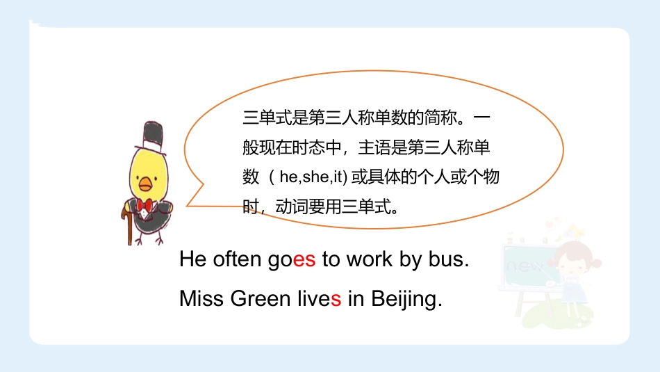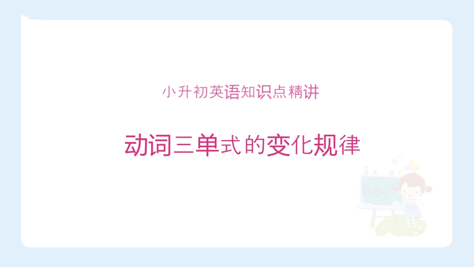关注更多精品资料关注更多精品资料请添加微信:请添加微信:27774643952777464395小升初英知点精语识讲三式的化律动词单变规Heoftengoestoworkbybus.MissGreenlivesinBeijing.三单式是第三人称单数的简称。一般现在时态中,主语是第三人称单数(he,she,it)或具体的个人或个物时,动词要用三单式。getmakereadlivewalkeatgetsmakesreadsliveswalkseats观察一:试总结下列动词三单式的规律知识1多数动词直接在词尾加s,清辅音后读/s/,浊辅音或元音后读/z/.在/t/后与/t/一起发/ts/音,在/d/后与/d/一起发/dz/音。stopmakeplaylivecomessworkssss/s//z/reads/dz//ts/writesstudytrycarrycopystudiestriescarriescopies观察二:下面单词变形有何规律?知识2以辅音字母+y结尾的动词,把y变为i再加–es,读/iz/.fliesflycopiescopytrytriesstudystudiesteachguesscatchfixteachesguessescatchesfixes观察三:上述单词变形有何规律?知识3以ch,sh,s,x结尾的动词,在后面加–es,读/iz/.missesmisspassespassbrushbrusheswatchwatches知识4以o结尾的动词,在后面加–es,读/z/.doesdogogoes/dʌz/知识5除了上述基本规律之外,英语中还存在一些无规则的第三人称单数变形。这些需要我们特别记忆.hashavebeis用所给单词的适当形式完成句子:1.Heoften________basketball.(play)解析:根据句意,他经常打篮球,句子为一般现在时,主语是第三人称单数,动词要用三单式,play的三单式为plays.playsgoes解析:根据句意,我父亲每天7点去上班,句子为一般现在时,主语是第三人称单数,动词要用三单式,go以o结尾,其三单式应加es,所以应填goes.2.Myfather_____toworkat7:00everyday.(go)用所给单词的适当形式完成句子:1.Theplane____fromBeijingtoNewYork.(fly)解析:根据句意,这是从北京飞往纽约的飞机,句子为一般现在时,主语是第三人称单数,动词要用三单式,fly是辅音+y结尾的动词,其三单式应把y变i再加es,故应填flies.flieswatches解析:本句意思是,Jane星期天总是看电视,根据所学语法知识可知动词要用三单式,watch以ch结尾,其三单式应加es,故应填watches.2.Janealways__________TVonSunday.(watch)Heoften________(have)dinnerathome.A.hasB.haveC.havesC根据句意,他经常在家吃晚饭,根据所学语法知识可知动词要用三单式,have的三单式是has,属不规则变化,应着重记忆。A易错1单项选择ALiuTao_______(do)notlikePE.A.doB.doesC.dosAB易错2单项选择根据句意,LiuTao不喜欢体育课,根据所学语法知识可知动词要用三单式,do是以o结尾的,其三单式应加es,故应选does.BThegirl_______(teach)usEnglishonSundays.A.teachsB.teachesC.teachA本句意思是这女孩星期天教我们英语,根据所学语法,动词要用三单式,teach以ch结尾,其三单式应加es,故应选teaches.B易错3单项选择B以o结尾的:在后面加–es以o结尾的:在后面加–es一般动词后面直接加-s.一般动词后面直接加-s.以ch,sh,s,x结尾的,在后面加-es以ch,sh,s,x结尾的,在后面加-es以辅音字母+y结尾的:把y变为i再加-es.以辅音字母+y结尾的:把y变为i再加-es.不规则的变化不规则的变化goesdoesgoesdoescleansgetslikeswalkscleansgetslikeswalkswatchesfixesmisseswasheswatchesfixesmisseswashesfly|fliesstudy|studiesfly|fliesstudy|studieshave---hashave---has