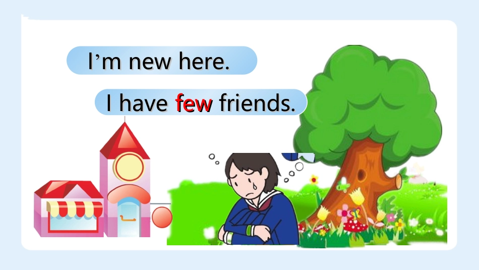 关注更多精品资料关注更多精品资料请添加微信:请添加微信:27774643952777464395小升初英知点精语识讲fewafewlittlealittle的用法II’’mnewhere.mnewhere.IhaveIhavefewfewfriends.friends.“few”是什么意思呢?知识1表示否定意义:没有;几乎没有表示肯定意义:有几个;有一些Wearefriends.Wearefriends.表示否定意义:没有;几乎没有表示肯定意义:有一点儿;有一些知识2few,little都表示否定afew,alittle都表示肯定afew+可数名词复数alittle+不可数名词afeweggsafewapplesalittlemilkalittletime知识3few+可数名词复数little+不可数名词知识41.Schoolisover,butthereare__________studentsintheclassroom.解析:students是可数名词复数,根据句意要用afew来修饰。请用afew/few/alittle/little来填空2.Ihave____________timenow,Icanhelpyoucleantheroom.解析:time是不可数名词,根据句意要用alittle来修饰。请用afew/few/alittle/little来填空3.Maryhas____________money,soshecan’tbuythebook.解析:money是不可数名词,根据句意要用little来修饰。请用afew/few/alittle/little来填空4.Ihaven’tlearnedEnglish,soIknow____________Englishwords.解析:words是可数名词复数,根据句意要用few来修饰。请用afew/few/alittle/little来填空Therearemanystudentsinmyclass,butIhave____friends.A.afewB.alittleC.littleD.fewD易错1Thereislittlewaterinthebottle,_______there?A.isB.areC.isn’tD.aren’tA易错2few(否),没有;几乎没有afew(肯),有几个;有一些little(否),没有;几乎没有alittle(肯),有一点儿;有一些