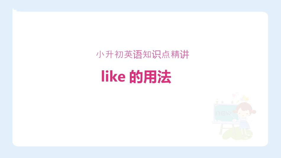 关注更多精品资料关注更多精品资料请添加微信:请添加微信:27774643952777464395小升初英知点精语识讲like的用法你们知道like是什么意思吗?知识1like为动词的时候可译为喜欢。1.后接名词或者代词,表示喜欢某人或某物。例如:Ilikethebaby.2.后接动名词(v-ing)表示喜欢做某事,着重于习惯或爱好。例如:Ilikecooking.3.后接动词不定式(todo)表示偶尔的喜欢做某事,着重于某次具体的行动。例如:Ilikereading,butIliketowatchTVnow.知识2like作为介词时译为”像……”,在句中一般作状语或表语。例如:Johnmakesamachinelikeabike.请用动词的适当形式填空1.Shelikesto____(go)swimmingthisafternoon.2.Ilike_______(watch)TV.解析:liketodosth.喜欢做某事。to后动词用原形,所以go用原形。解析:喜欢做某事,like后面用动名词watching.Thelittleboylookslikehisfather.看看哪个翻译正确?A.这个小男孩看起来喜欢他的爸爸。B.这个小男孩看起来像他的爸爸。解析:like在这里是介词,是像……的意思,所以应该翻译成看起像,而不是喜欢,所以B正确。Wouldyoulike____tomyparty?A.comingB.tocomeAWouldyouliketodo…?是固定搭配,意思是你想做什么?不是喜欢做什么,所以应该用tocome.BWhatishelike?看看哪个翻译正确?A.他喜欢什么?B.他是怎么样的一个人?ABLike在这里是作为介词,不是动词,所以不是喜欢的意思,应该是”像……”1.Doyoulike______housework?A.doB.doesC.doingD.did2.I______playingbasketball.A.amnotlikeB.don’tlikeC.isn’tD.likes3.Whichcolor______?A.areyoulikeB.shelikesC.doyoulikesD.doesshelike