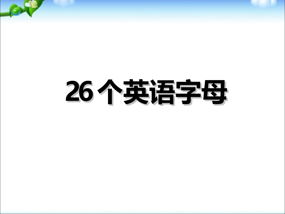 2626个英语字母个英语字母Aa大写的A像圆规,小写的a像蜗牛。Bb大B像耳朵听声音,小b像6直起腰。Cc大C像月亮弯弯腰,大写小写一个样,只是大写个头高。Dd大D像月饼切一半,小写的d像汤勺,EeE像“山”字向右偏,小e像只小眼睛。FfF像菜刀缺了口,小写f的像镰刀。GgG像一座圆宝库,小写g的像蝌蚪。HhH像河上独木桥。小写的h像椅子。IiI像甘蔗砍一段,始终有节腰不弯。小i长大就是“我”,为求正义头可断。JjJ像一个长铁钩,拉钩守诺最长久。“小j”听来像“小姐”,要防帽子风吹走。KkK像竹子两片叶,长短高低仔细写。小竹叶子长得低,方向朝东没分别。LlL的大写右半框,合并7字一扇窗。开窗睁眼看世界,却见l小瘦又长。Mm大写的M像峡谷,两座山峰相对峙。小写m的像梳子,总共只有三个齿.NnN的左边是山峰,右边河谷一样深。小写的n像拱门,不见门板不见人。OoO像鸭蛋滚一边,大写也是一个圈。PPP像小旗迎风飘,外边圆圆没有角。小p总叫“劈劈劈”,像把斧头劈柴烧。QqQ像小蛇出蛋壳,里面是否也太热?RrR像门板要倒下,找根短棍支撑它。小r写的像根草,才吐两片嫩嫩芽。SSS像长蛇在爬行,小蛇也学大蛇走,长短高低要分清。Tt小写t的像鱼钩,大写的T像铁锚。UuU像弯弯鞋后跟。Vv大小V是胜利,斜竖中间俩指头。字母与音标(1)Review/ei//bi://si://di://i://ef//ʤi://eiʧ//el//kei//ʤei//ai//a://ju://zed//wai//kju://es//ti://vi://’dʌblju://eks//em//en//əʊ//pi:/字母与音标(2)Review/zi:/1.字母的笔顺书写时注意下列各点:①除f,i,j,t,x5个小写字母书写时是两笔完成外,其余小写字母都是一笔完成。②C,G,J,L,O,S,V,W,Z9个大写字母,书写时笔尖不能离开纸面,都必须一笔完成。如:•小结B,D,K,M,N,P,Q,R,T,U,X,Y12个大写字母,书写时都是两笔完成。如:A,E,F,H,I5个大写字母,书写时都是三笔完成。如:③小写字母a,d,g,o,q和大写字母O,Q等字母的起笔都在相当于小写字母c或大写字母C的起笔处。④e是英语字母中唯一从左边中间起笔的:2.书写的规格①按照字母的笔顺和字母在三格中应占的位置书写。②每个字母都稍向右斜,斜度要一致。本书字母的斜度约为5°。③大写字母都一样高,不顶第一线。小写字母a,c,e,m,n,o,r,s,u,v,w,写在中间的一格,上下都不出格。⑤小写字母b,d,h,k,l的上端顶第一线。⑥小写字母i的点和t的上端都在第一格中间。⑦小写字母g,q,y的下端抵第四线⑧小写字母j,p的上端在第一格中间,小写字母f比j,p要高,与大写字母同样高或稍低一些;它们的下端都抵第四线。⑨小写字母a,d,g,q的起笔都在第二线上,中间部分是椭圆形。注意起笔处要合拢。小写字母a,d,h,i,k,l,m,n,t,u等字母是一个上挑的小圆钩,如注意不能写成锐角,如:更不能写成汉字的竖弯钩,如:g,j,y的下延弯度要适当,如:,不能太长,如:也不能太钩,如:(11)字母与字母不论是否连写,间隔要均匀、适当,不要凑得过紧,也不要离得太远。(12)单词之间必须有适当的距离,一般说,以空出小写字母a的宽度为宜。