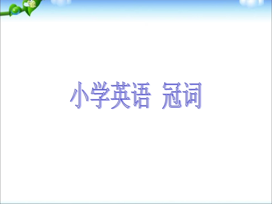 一、什么是冠词?冠词是用于名词前,说明名词所表示的人或事物的词。二、冠词的分类。定冠词:the冠词不定冠词:a、an1、不定冠词的用法•a/an都表示一个,有些情况也可译为“每”•an用在单词发音中元音音标开头的单词•a用在单词发音中辅音音标开头的单词Eg.anorangeanapple三、冠词的用法:•(1)表示某一类人或事物中的任何一个,经常用在第一次提到的某人或某物时,用不定冠词起介绍作用,表示“一个”•e.g.Thisisaninterestingbook.这是一本有趣的书。•(2)表示人或事物的某一类,强调整体,即以其中一个代表一类。•e.g.Abirdcanfly.鸟会飞。•(3)表示数量“一”,相当于one.•e.g.Therearetwenty-fourhoursinaday.一天有24小时。•(4)用于一些习语中。•inaminute一会儿forawhile一会儿•haveatry试一试inaword总而言之2、定冠词the的用法:•(1)特指某些人或物•Thebookonthedeskismine.•(2)双方都知道的人或事物•Openthedoor,please.•(3)指上文提到的人或事物•Helivesonafarm,thefarmisnotbig.•(4)指世界上独一无二的事物前;如果名词前有修饰语,也可能用不定冠词。Thesunisbiggerthanthemoon.abrightmoon•(5)用在形容词前表示一类人。•thepoortheold•(6)用在姓氏前表示一家人。•TheGreensareattable.(7)用于序数词、形容词最高级及形容词only,very,same等词的前面。Theislandisthebiggestofthethree.Januaryisthefirstmonthoftheyear.Theyareinthesameclass.(8)用于乐器前。Ilikeplayingthepiano.(9)用在习语中。lookthesameinthedaytime四、不用冠词的情况:•1.在国名、人名等专有名词前不用。•CanadaLucy•2.复数名词表示泛指,表示一类人或事物时,可不用冠词。•Ilikevegetables.•3.不可数名词前通常不加不定冠词,但可加定冠词修饰。•Waterisimportanttous.•Whereisthejuice?•4.在季节、月份、星期、节日等名词前不用冠词。•It’sautumnnow.It’scool.•NewtermbeginsinSeptember.•IoftenvisitmygrandparentsonSunday.•ChristmasDayChildren’sDay•5.在称呼、官衔、职业的名词前不用。•Thisismymathteacher.•6.在一日三餐、球类运动或娱乐运动的名词前不用。•havebreakfast/lunch/dinner•playfootball/basketball/chess•7.当两个或两个以上的名词并用时不用。•Icanwritewithpenandpencil.•8.当名词前已有作定语的词时不用。•I’dliketobuythisdress.例题:冠词(a/an)1.Ihave__book.2.__catcancatchinsect.3.Lucyspends___hourdoingherhomeworkeveryday.4.Bob’sfatheris__engineer.5.Johnis__honestboy.6.__apple__daykeepsthedoctoraway.aAanananAna7.Let’shave__restfor__while.8.Motherboughtme__uniformyesterday.9.Ihave__pencil,__(a,the)pencilisred.10.___(a,the/)sunisshiningbrightlyin__(a,the,/)sky.11.__(a,the)dictionaryon__(a,the)deskismine.12.Is(the,/)Mary(a,the,/)youngestgirlinourclass?13.Canyouplay(a,an,the,/)violin?14.Wegotoschoolby(a,the,/)bikein(aanthe)morningeverydayaaaatheThetheThethe•根据所学知识用a,an,the,/填空Mynameis__Michael.I’min__gradethreethisterm.Mymotheris__doctorandmyfatheris__actor.Todayis__Saturday.Now,myfatheristalkingon__phone.Mymotherishaving__breakfast.Mygrandmotheriswatering__flowersin__gardenandI’mwatching__TV.Look!Thisismyzone.Thereis__beautifulumbrellainmybedroom.Ilike__umbrellaverymuchbecauseIboughtitin__Paris.Theseareallmypresents.