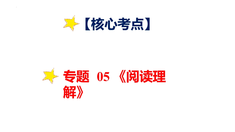 阅读理解小升初英语总复习【核心考点】专题05《阅读理解》学习目标1.掌握阅读的常见题型2.例题赏析3.巩固练习考点分析考点一细节理解题解题思路一要:在文章中找出相应的信息点二要:排除干扰项Lin'senjoymentofbasketballactuallybeganinTaiwan,wherehisfatherstartedwatchingit.Lin'sfathermovedtoU.S.,andpassedonthisloveofbasketballtohisson,theyoungLinspentmuchofhisyouthplayingbasketballforfun,learningfromhisfatherandelderbrother.1.Lin'senjoymentofbasketballstartedin________.A.TaiwanB.theU.SC.HarvardUniversityD.NBA例题剖析Lin'senjoymentofbasketballactuallybeganinTaiwan,wherehisfatherstartedwatchingit.Lin'sfathermovedtoU.S.,andpassedonthisloveofbasketballtohisson,theyoungLinspentmuchofhisyouthplayingbasketballforfun,learningfromhisfatherandelderbrother.Step1.——断案找出问题中的关键词1.Lin'senjoymentofbasketballstartedin_______例题剖析Lin'senjoymentofbasketballactuallybeganinTaiwan,wherehisfatherstartedwatchingit.Lin'sfathermovedtoU.S.,andpassedonthisloveofbasketballtohisson,theyoungLinspentmuchofhisyouthplayingbasketballforfun,learningfromhisfatherandelderbrother.Step2.去案发现场寻找蛛丝马迹例题剖析=startLin'senjoymentofbasketballactuallybeganinTaiwan,wherehisfatherstartedwatchingit.Lin'sfathermovedtoU.S.,andpassedonthisloveofbasketballtohisson,theyoungLinspentmuchofhisyouthplayingbasketballforfun,learningfromhisfatherandelderbrother.Step3.找到证据,破解案情1.Lin'senjoymentofbasketballstartedin________.A.TaiwanB.theU.SC.HarvardUniversityD.NBA例题剖析Lin'senjoymentofbasketballactuallybeganinTaiwan,wherehisfatherstartedwatchingit.Lin'sfathermovedtoU.S.,andpassedonthisloveofbasketballtohisson,theyoungLinspentmuchofhisyouthplayingbasketballforfun,learningfromhisfatherandelderbrother.Step3.找到证据,破解案情1.Lin'senjoymentofbasketballstartedin________.A.TaiwanB.theU.SC.HarvardUniversityD.NBA例题剖析WhendidMr.Sheldongotoaforeigncountry?why/who/howWhatdidMr.Sheldonwanttobuyinthemarket?Wherearethestudentsplayingbasketball?Theiruncleaskedthemto_______,Accordingtothesecondparagraph,youcanask_______forhelp.1.5wlh类2.设空类WhendidMr.Sheldongotoaforeigncountry?WhatdidMr.Sheldonwanttobuyinthemarket?Wherearethestudentsplayingbasketball?Theiruncleaskedthemto_______,Accordingtothesecondparagraph,youcanask_______forhelp.名词、大写的词、形容词名词、动词名词、动词名词、动词数词、动词例题剖析Oneday,Lilywalkedwithhermotherandcametoabeautifulgarden.Lilylookedin.Shesawcleanroadsandbeautifulflowers.Sheturnedtohermotherandsaid,"Mum,comeandlookatthisgarden.IhopeIcanopenthegateandwalkin."WhodidLilywalkwithwhenshecametoaprettygarden?A.Aboy.B.Agardener.C.Hermother.D.Herfather.事实细节题--关键词定位法ThisisMrs.White.Nowsheisteachingmath.Sheworksinamiddleschool.ShelivesinLondon.Mrs.WhiteandMr.Whitehavethreechildren.Theyallloveanimalsandtheyhaveabigdogandacutecat.Mrs.Whiteisa_______.A.farmerB.teacherC.doctorD.musician例题剖析Youneedtopay______altogetherifyouwanttotravelwithtwofriends.Thevisitorsaidthatinhiscountryitwouldtakethem______tobuildtheTowerofLondon.HowmanylessonsdoesDalehaveinaday?Howmuchshoulda14-year-oldboypayforSeaLifeAquarium?Howlongwillherjourneylastabout?花费看题干&选项例题剖析WhatdoesAnnadoafterschoolonschooldays?At5:00pmonMonday,shehasaguitar(吉他)lessonforanhour.Mrs.Greenisherguitarteacher.Annathinksherclassesarealwaysfun.Annaisintheschooltennisteam.OnTuesdaysheplaystenniswithherP.E.teacherMr.Wellsfrom4...