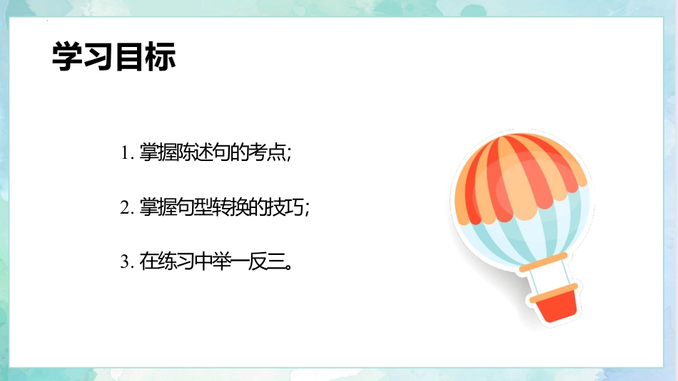 小升初英语总复习陈述句【核心考点】专题05《句法(陈述句)》学习目标1.掌握陈述句的考点;2.掌握句型转换的技巧;3.在练习中举一反三。陈述句肯定句否定句思维导图句型转换考点分析陈述句陈述句是陈述一个事实或者说话人的看法的句子。它包括肯定句和否定句两种。陈述句在书写时句末用句号,在朗读时用降调。Sheisagoodstudent.她是一个好学生。Wearegoingtodoourhomeworkafterclass.放学后我们做家庭作业。考点一陈述句的形式陈述句有肯定式和否定式两种形式。1.陈述句的肯定式陈述句的肯定式有以下几种形式:(1)主语+系动词+表语如:Thisismyfather.这是我父亲。It'swarmtoday.今天暖和。考点一陈述句的形式(2)主语+谓语动词如:Icanhardlywait.我等不及了。Theteachersmiled.老师笑了。(3)主语+谓语动词+宾语如:Iwantsomechickenandahotdog.我想要一些鸡肉和一个热狗。Icanusechopsticks.我能用筷子。考点一陈述句的形式(4)主语+谓语动词+间接宾语+直接宾语如:Mymotherisgoingtobuymeanewskirt.我妈妈将要给我买一条新裙子。ThedrivertoldusmanythingsaboutKunming.司机告诉了我们许多关于昆明的事。考点一陈述句的形式(5)主语+谓语动词+宾语+宾语补足语如:ShespeaksEnglishwell.她英语讲得好。Mybabysistercallsmymom"mommy".我的小妹妹叫我妈妈“妈咪”。考点一陈述句的形式2.陈述句的否定式(1)陈述句的否定式有以下几种形式:①主语+be动词+not+其他(谓语动词是be动词时的否定式)如:Thosearenotmyglasses.那不是我的眼镜。Lucywasnotlateforschoolyesterdaymorning.露西昨天早上上学没有迟到。考点一陈述句的形式②主语+助动词(do/does/did)+not+实义动词+其他如:Idon'tlikegrapes.我不喜欢葡萄。Myfatherdidn'tgoshoppinglastweek.我爸爸上周没有去购物。③主语+情态动词+not+实义动词+其他如:Ican'tfindSarah.我找不到萨拉。考点一陈述句的形式(2)否定式的缩写形式isnot=isn'tarenot=aren'tdonot=don'tdoesnot=doesn'tdidnot=didn'twillnot=won'twerenot=weren'twasnot=wasn't考点二陈述句之间的转换肯定句改为否定句的方法:一、首先,要看肯定句中是否有情态动词,如果有情态动词,直接在情态动词后面加not即可,同时句中如果有some,some就要变成any。举例如下:1、肯定句:Mikecanhelpyousolvetheproblem.迈克可以帮你解决那个问题。否定句:Mikecan'thelpyousolvetheproblem.(can't=cannot)迈克不能帮你解决那个问题。考点二陈述句之间的转换肯定句改为否定句的方法:二、如果肯定句中没有情态动词,那就要看句中有无be动词的相应形式,如果有,直接在be动词后面加not,句中有some,some变any。举例如下:1、肯定句:IamanEnglishteacher.我是一名英语老师。否定句:I’mnotanEnglishteacher.2、肯定句:Therearesomebooksonthedesk.书桌上有一些书。否定句:Therearen'tanybooksonthedesk.书桌上没有书。考点二陈述句之间的转换肯定句改为否定句的方法:三、如果肯定句中既没有情态动词,也没有be动词,那么就要用相应的助动词加上not来变换,句中有some,some变any。举例如下:1、肯定句:Shelikeshelpingothers.她喜欢帮助别人。否定句:Shedoesn'tlikehelpingothers.她不喜欢帮助别人。2、肯定句:Theyhavesomeapples.他们有一些苹果。否定句:Theydon'thaveanyapples.他们没有苹果。例题解析【例1】按要求改写句子。1.Shedoesherhomeworkeveryevening.(改为否定句)_____________________________________________2.Wedon'thaveanylessonsonSundays.(改为肯定句)_______________________________________________思路点拨:第1题中,借助于助动词doesn't构成否定句,并将动词does改为do。第2题中,将否定句变为肯定句,当谓语动词是“do+not+实义动词”时,删去句中的donot,再将句中的any变为some。【答案】1.Shedoesn'tdoherhomeworkeveryevening.2.WehavesomelessonsonSundays.【例2】根据图片将句子补充完整。1.Theparkis____________________________2.Lucy_____________________________思路点拨:本题考查学生对陈述句基本句型的运用能力。第1题的句子形式是:主语+...